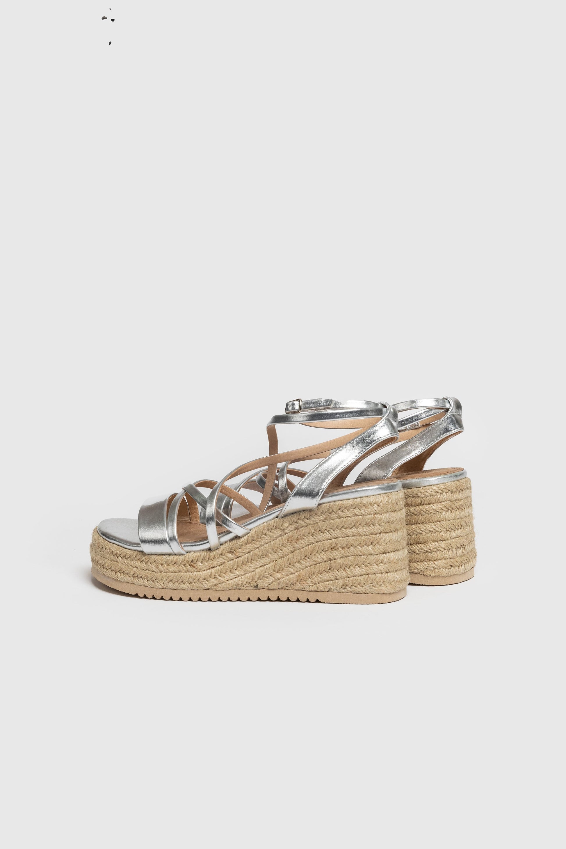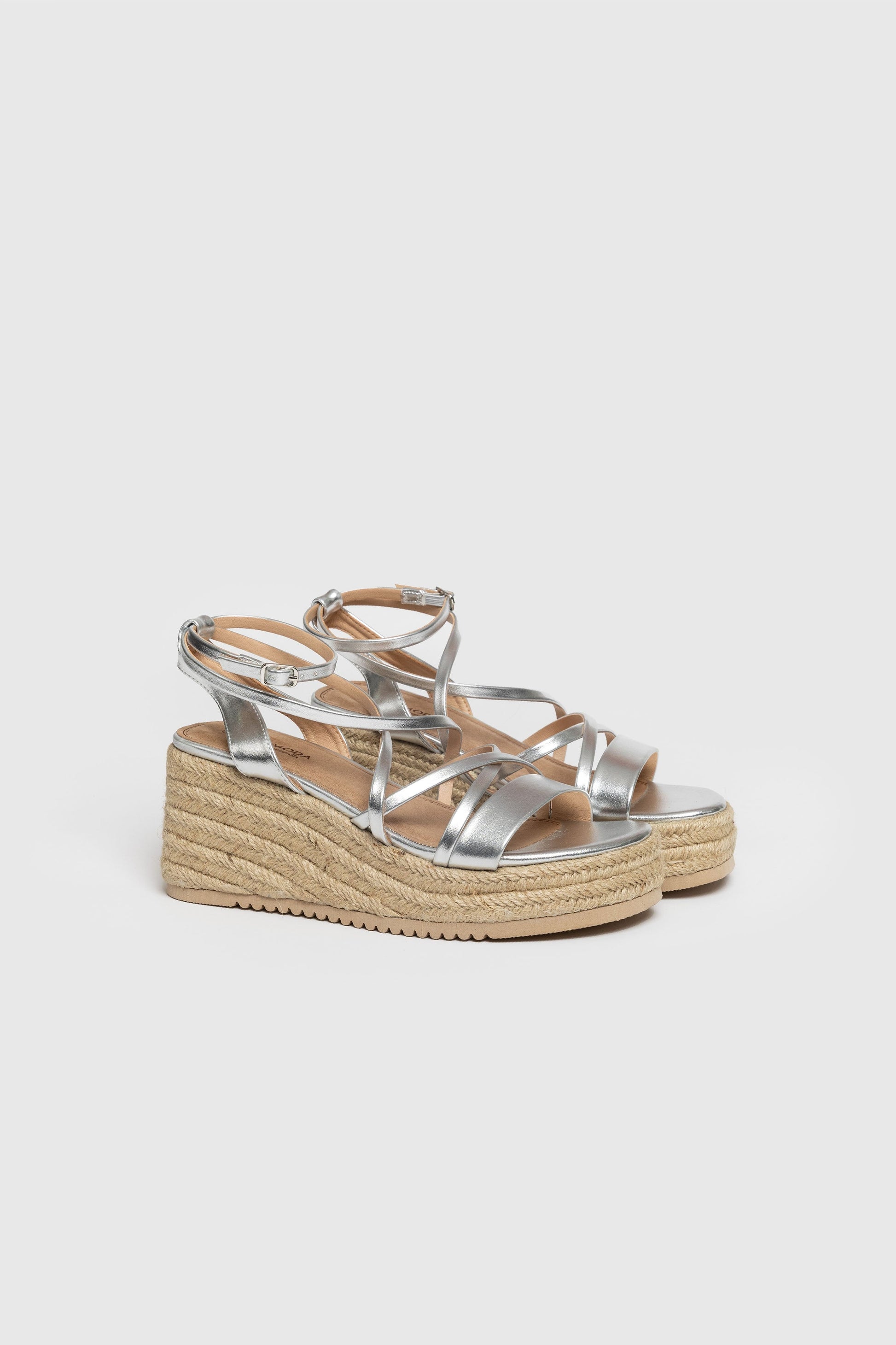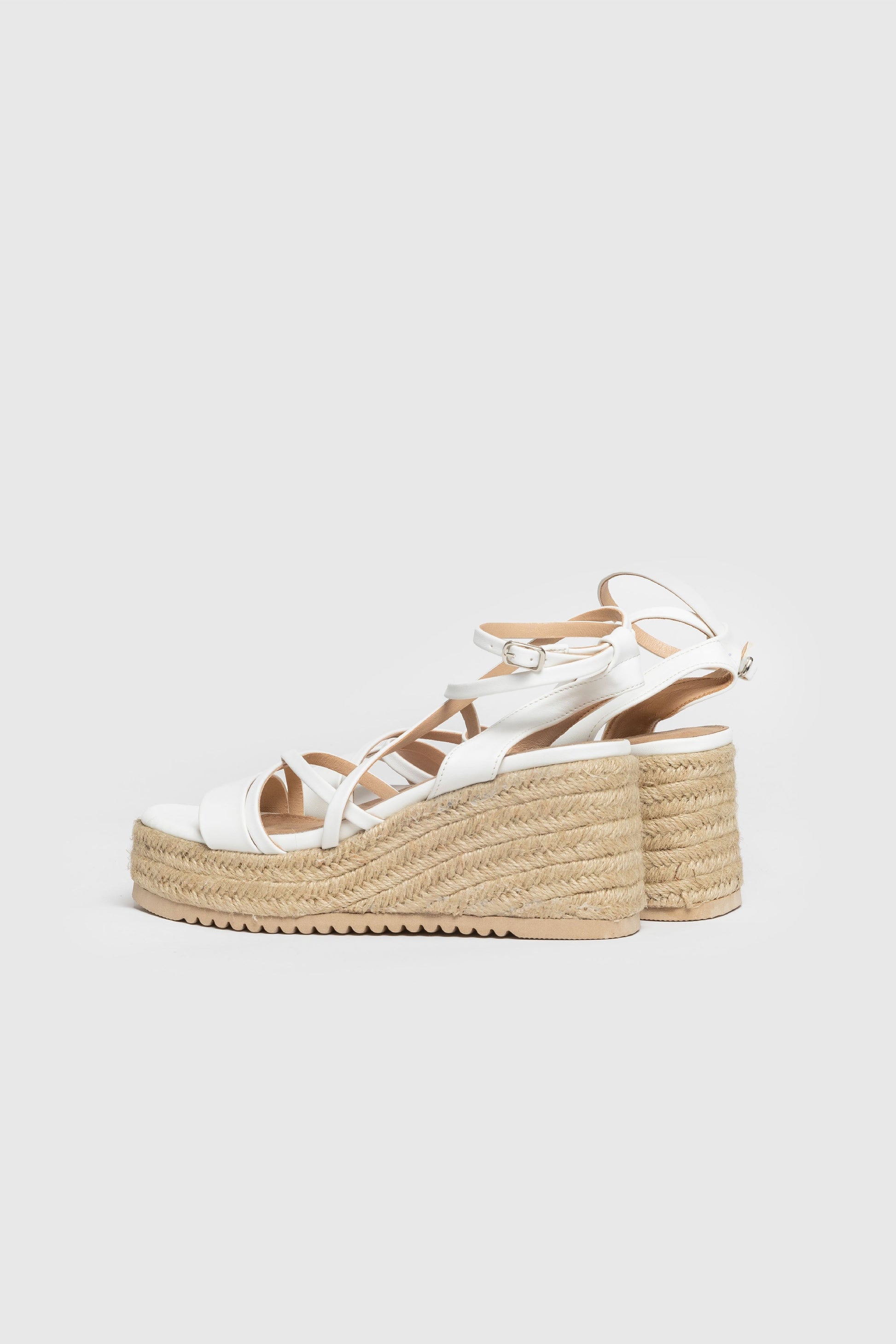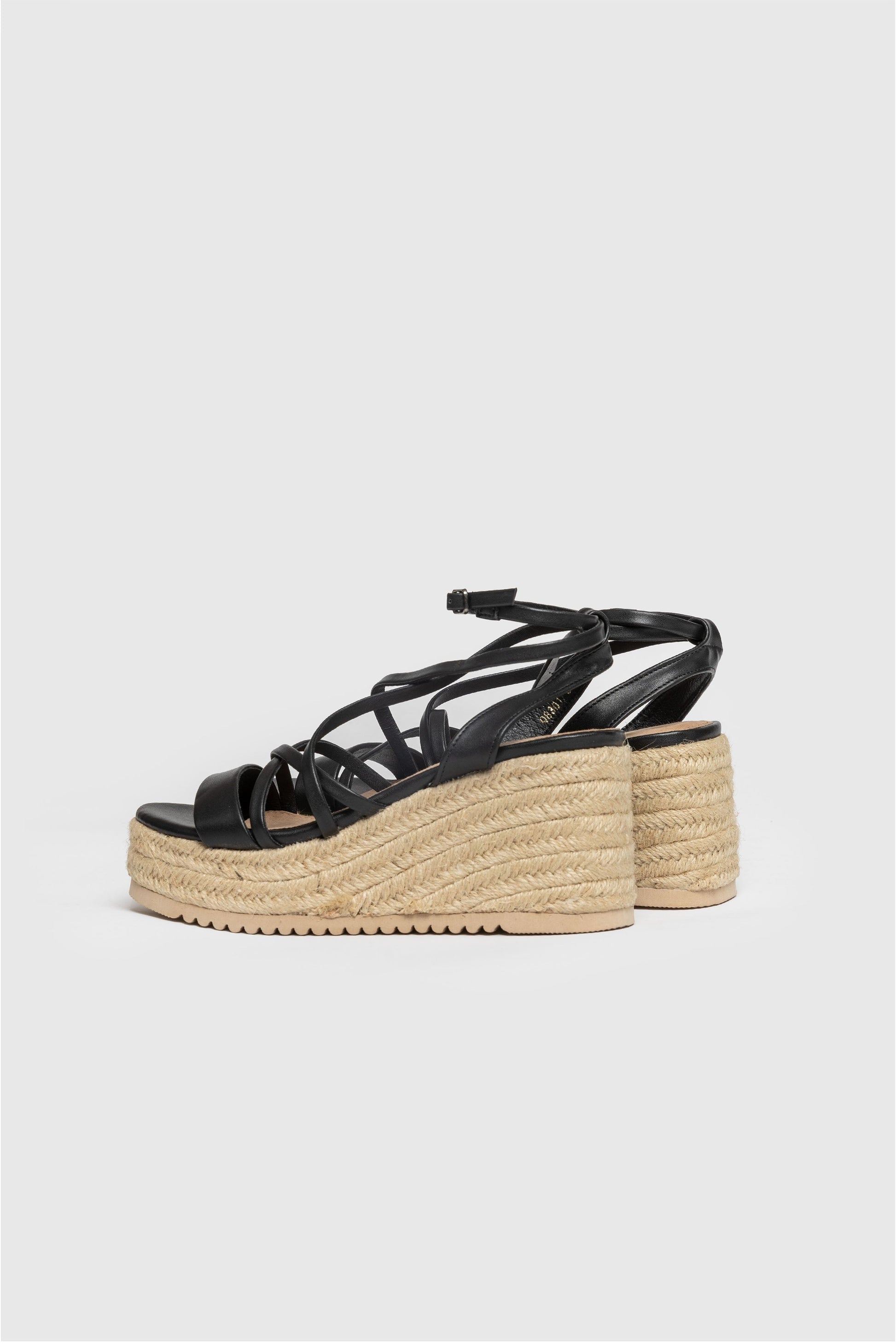 Sandalia cuña. Tejido combinado. Diseño tiras. Diseño cruzado. Punta redondeada. Cierre de correa atada al tobillo. Suela de contacto antideslizante. Altura cuña: 8.0 cm