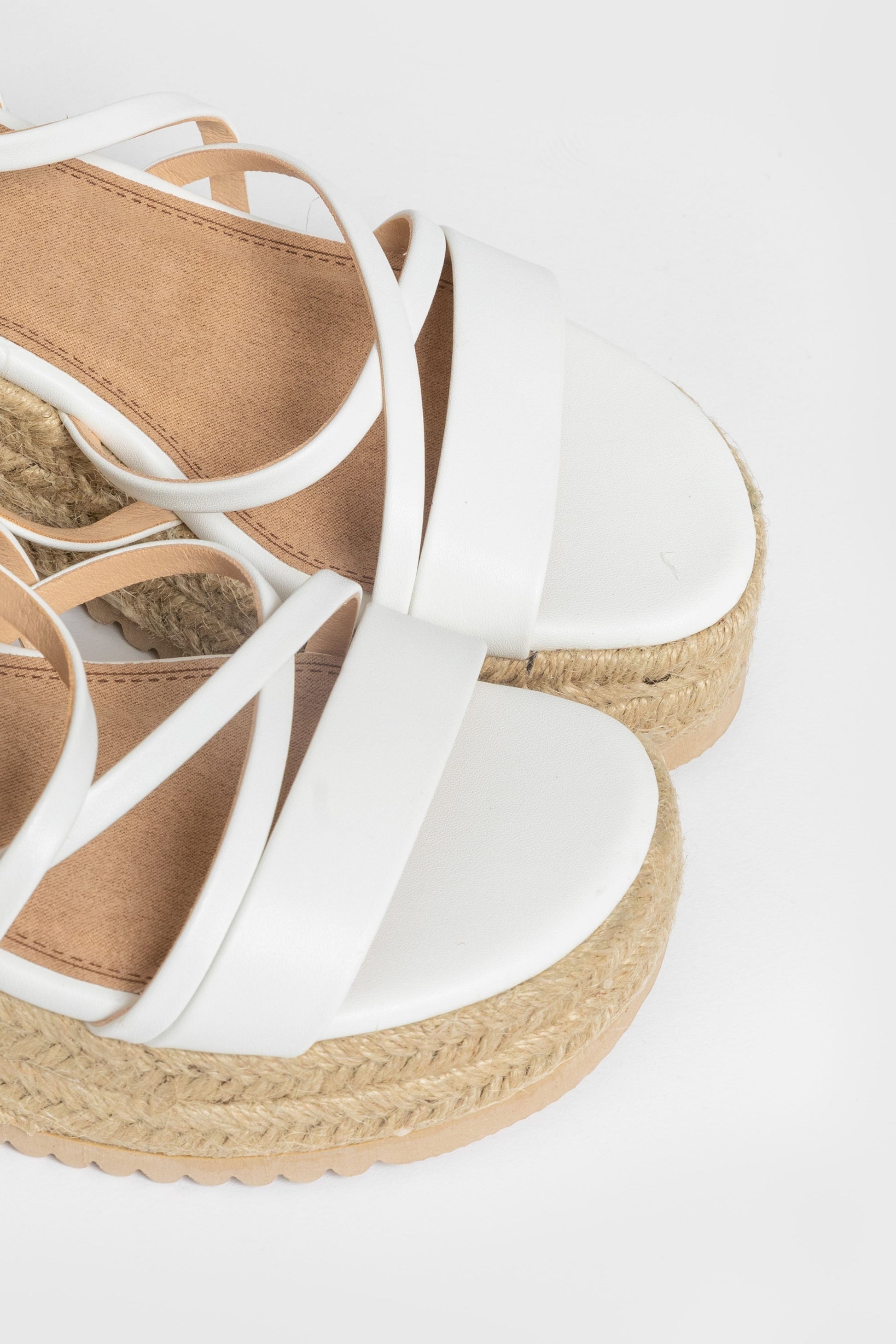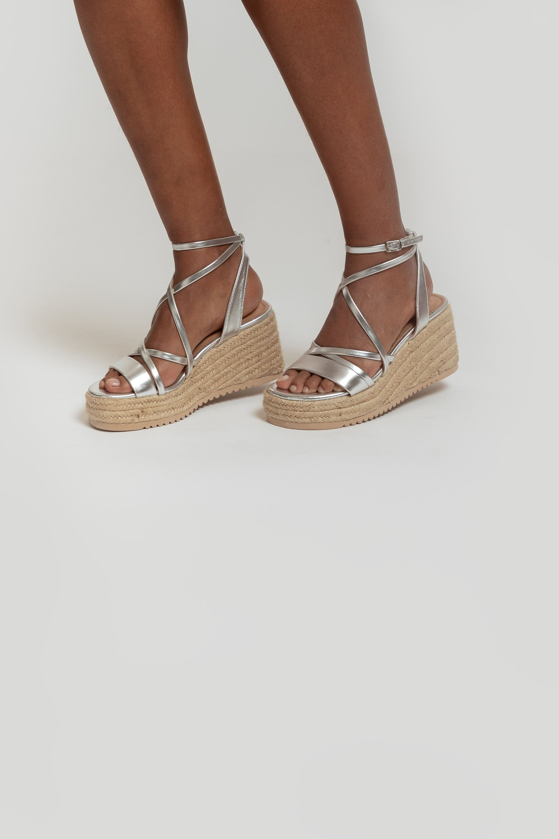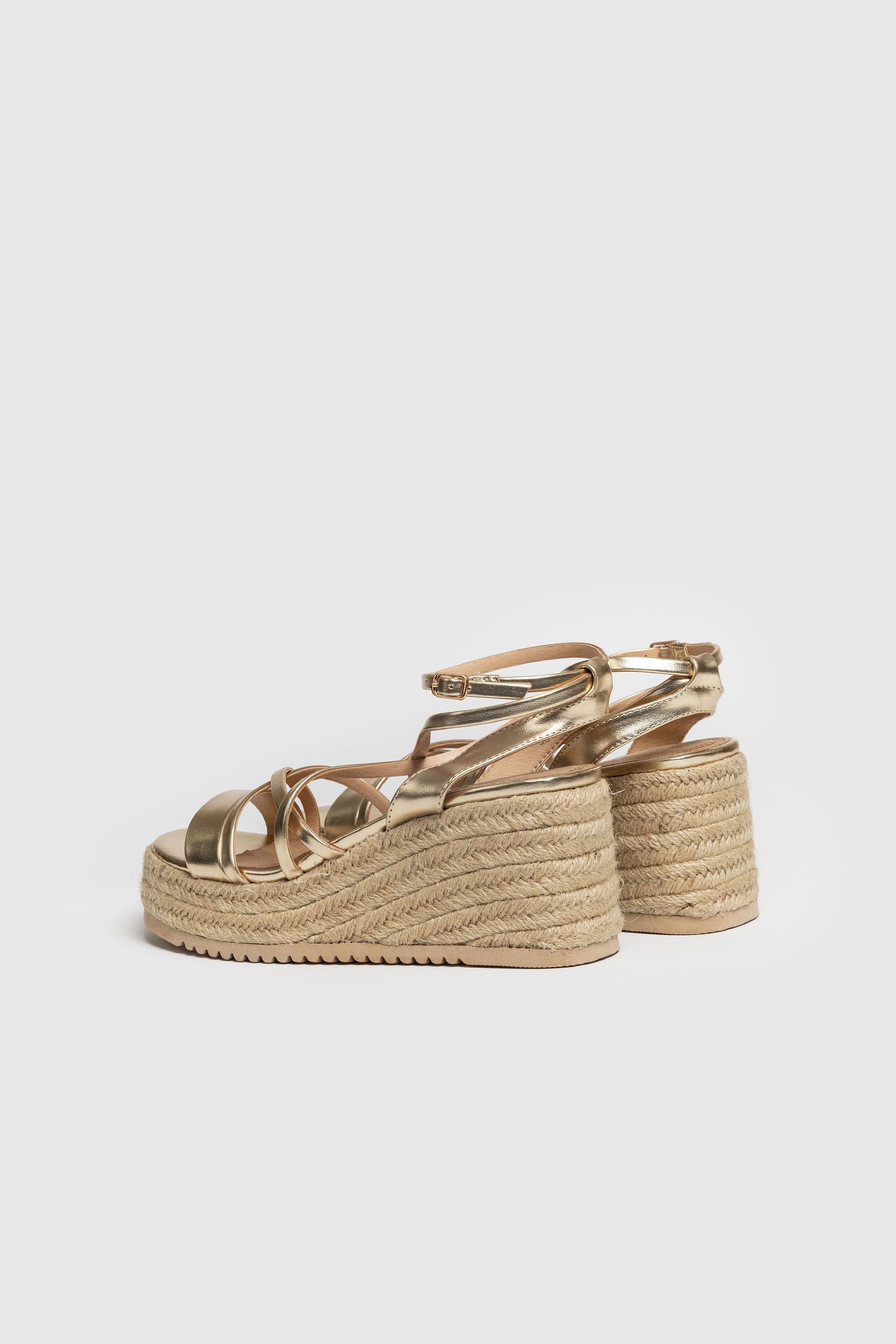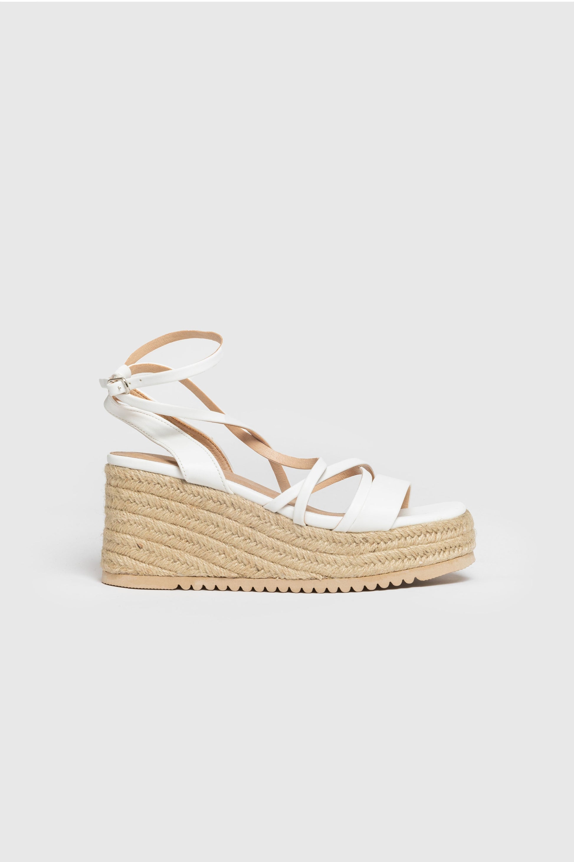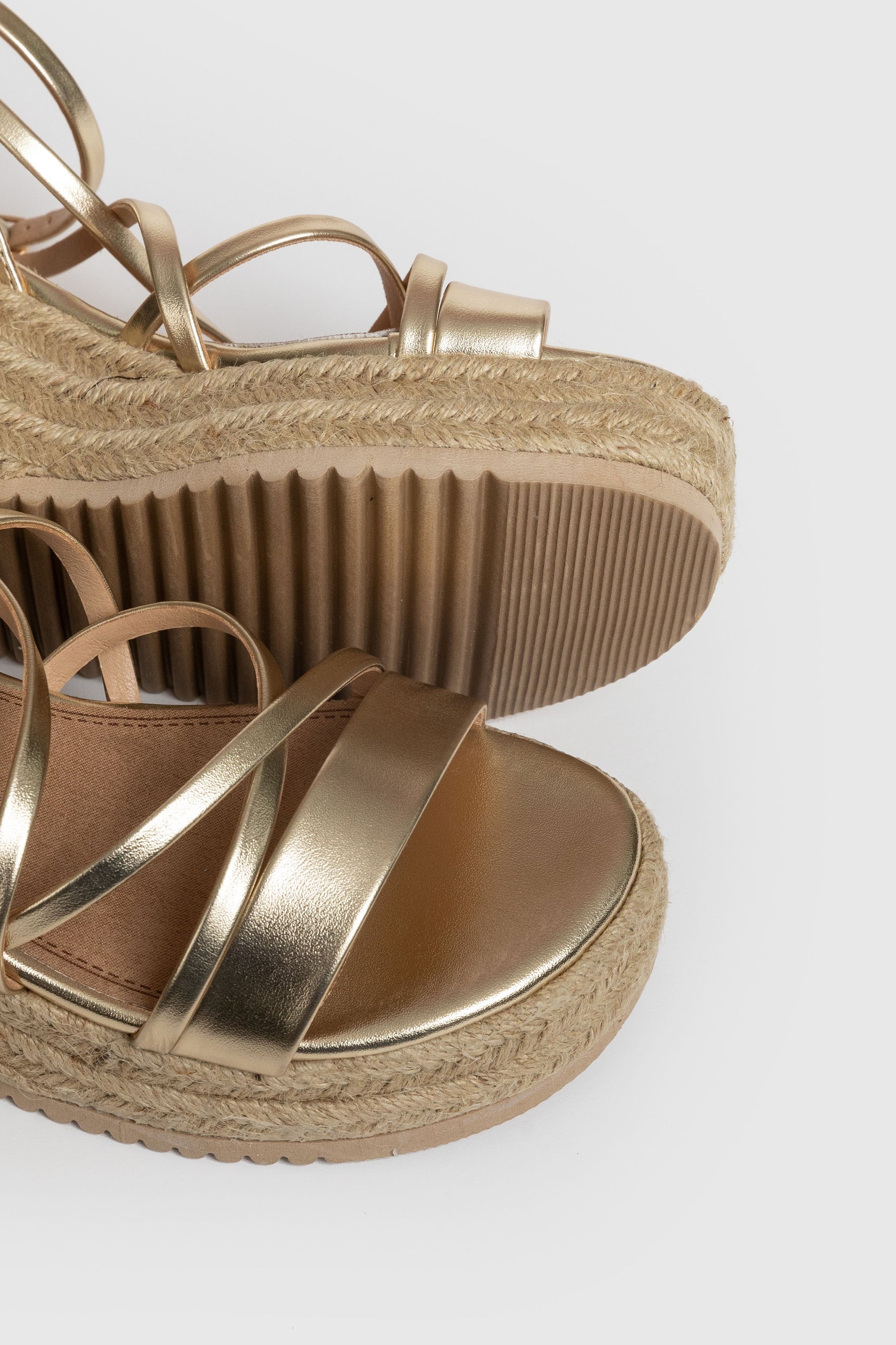 Sandalia cuña. Tejido combinado. Diseño tiras. Diseño cruzado. Punta redondeada. Cierre de correa atada al tobillo. Suela de contacto antideslizante. Altura cuña: 8.0 cm