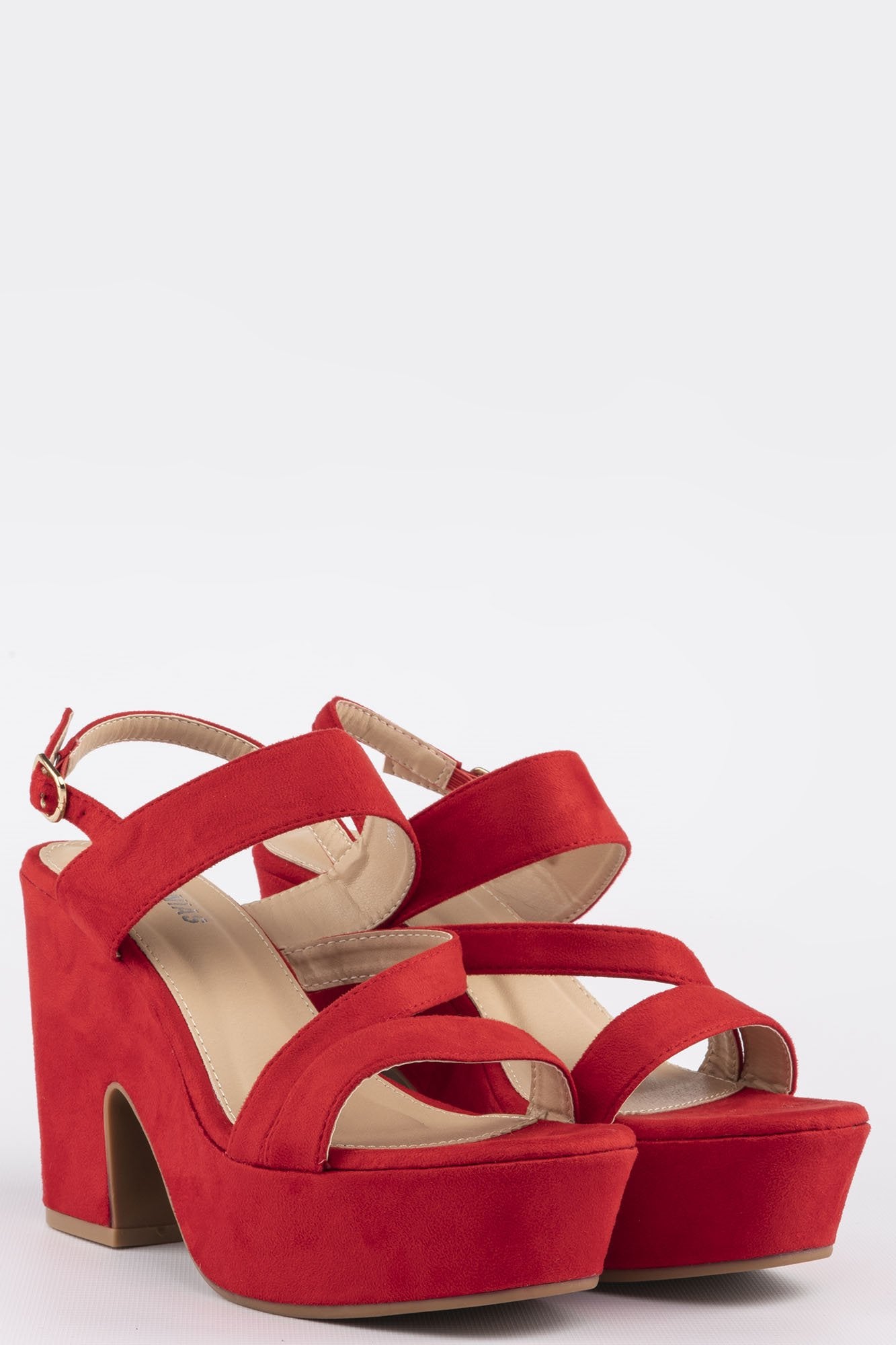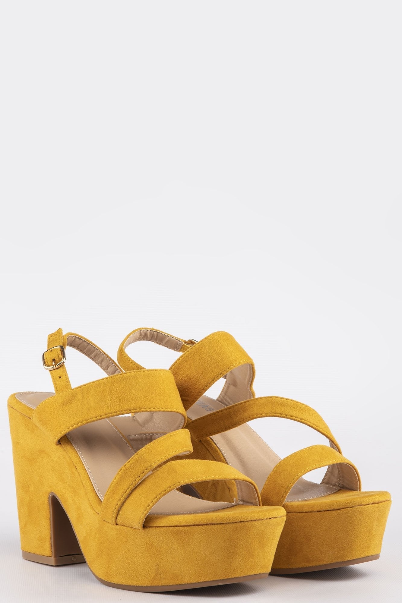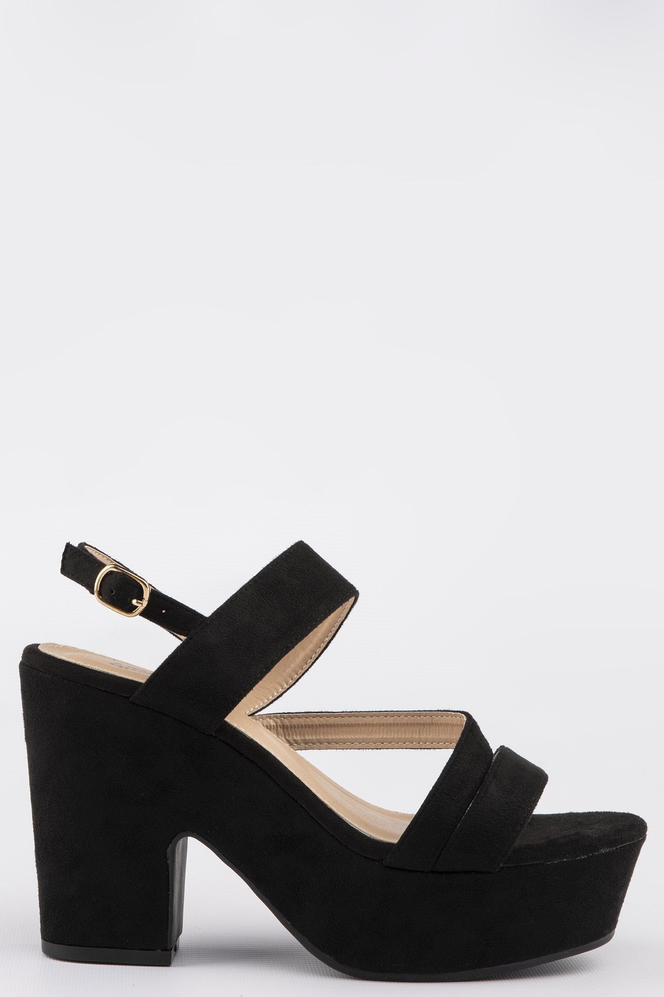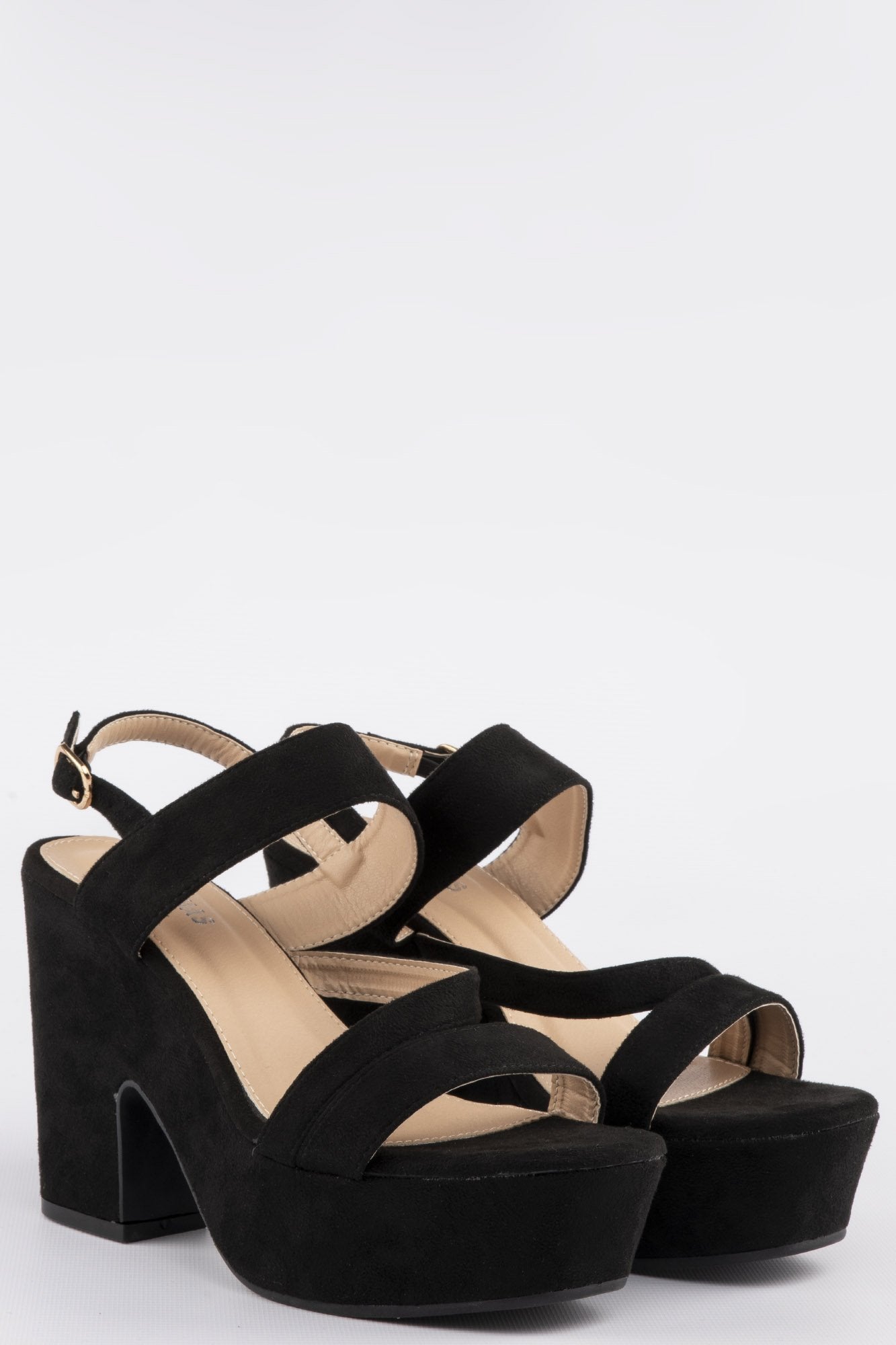 Sandalias con plataforma de tejido de ante, cierre de hebilla, destalonado. Altura tacón delantero: 4,5 cm. Altura tacón trasero: 11,5 cm.