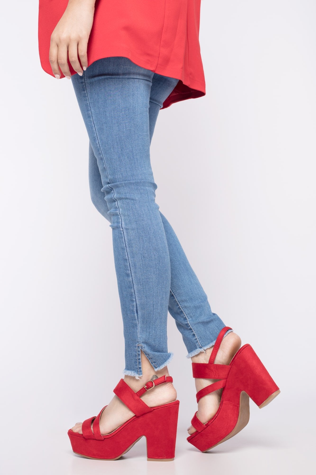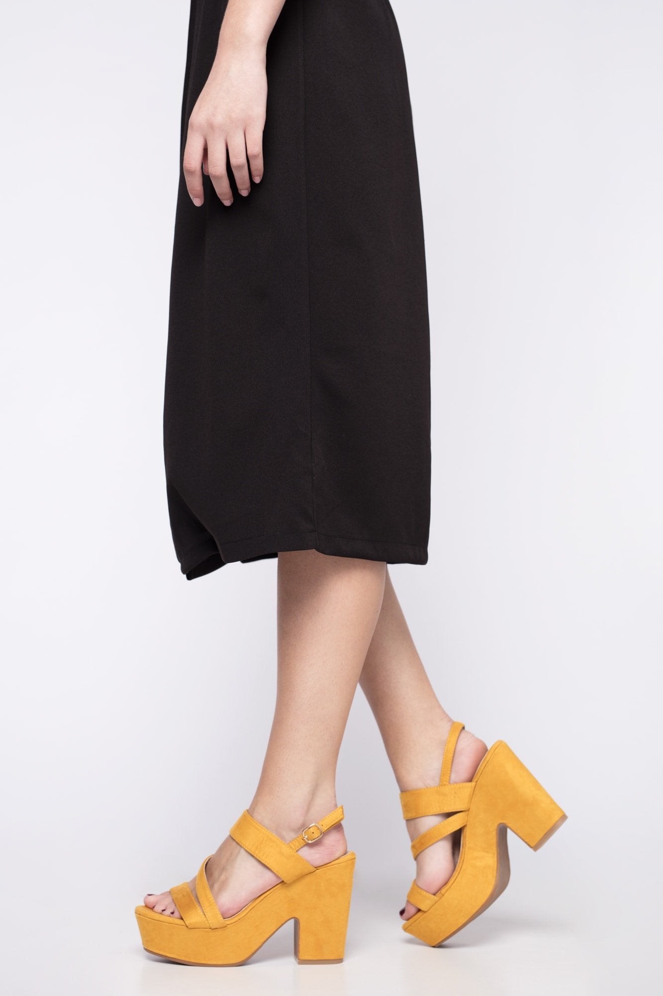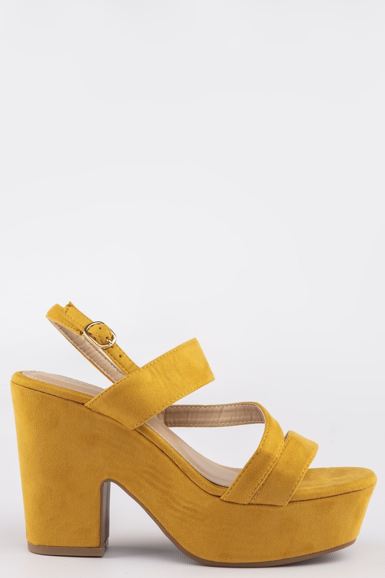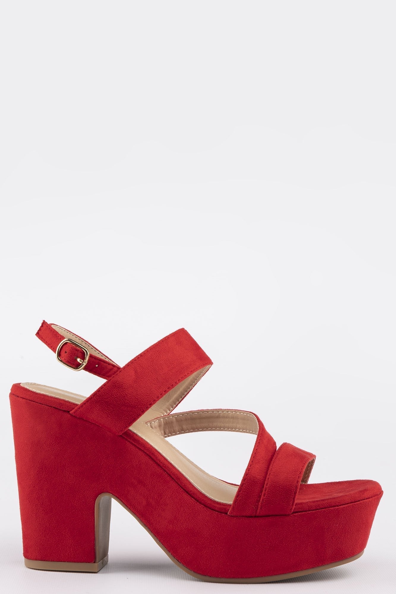 Sandalias con plataforma de tejido de ante, cierre de hebilla, destalonado. Altura tacón delantero: 4,5 cm. Altura tacón trasero: 11,5 cm.
