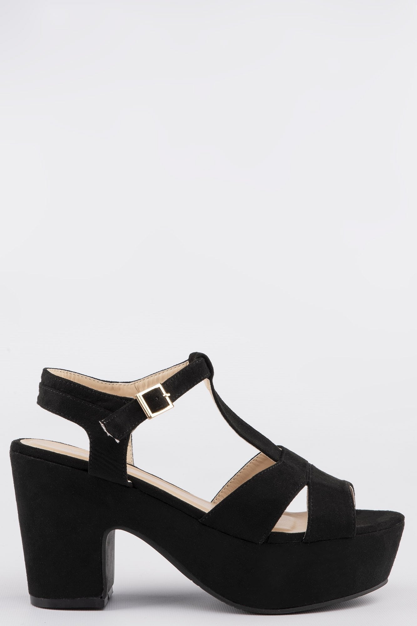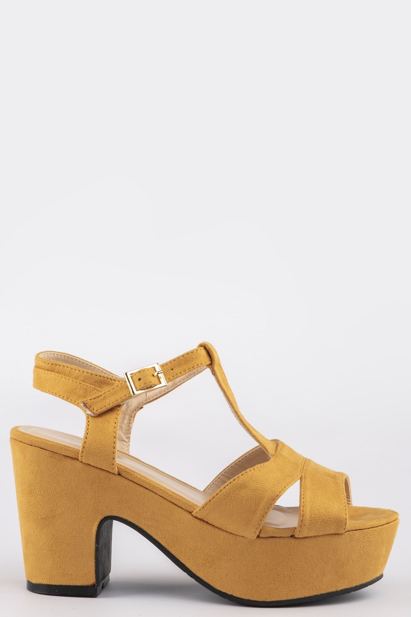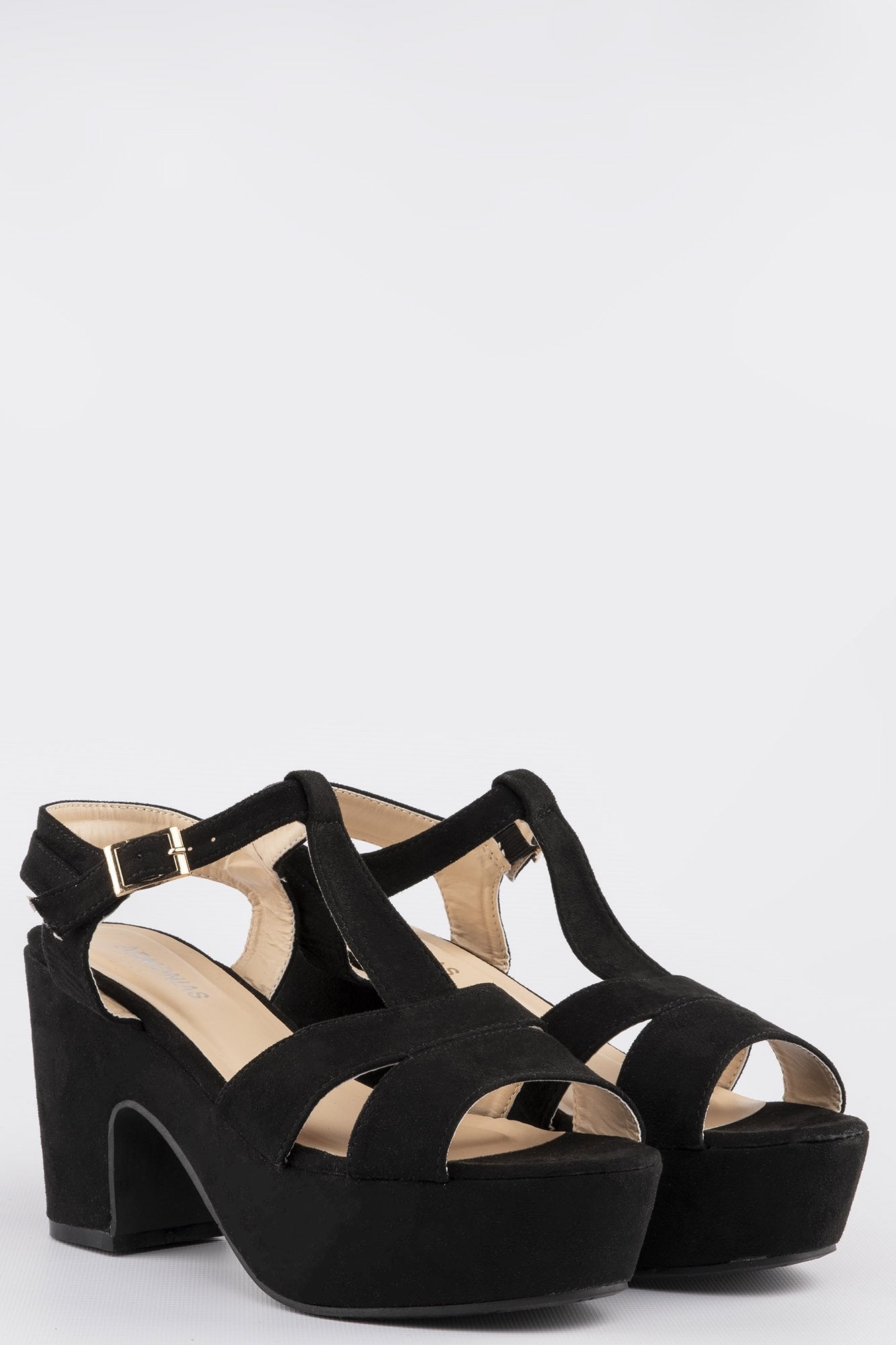 Sandalias de plataforma y tacón ancho de tejido ante, tirantes cruzados, cierre de hebilla. Altura tacón 10 cm, Altura plataforma: 4 cm