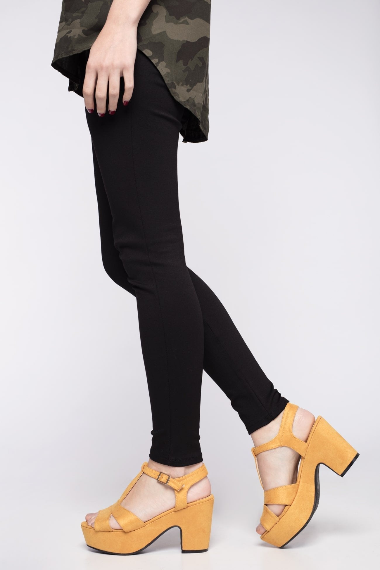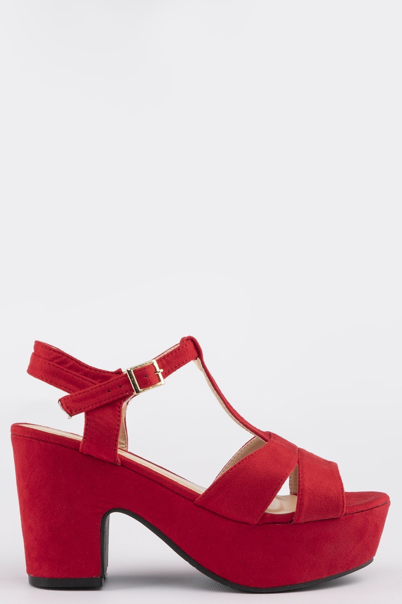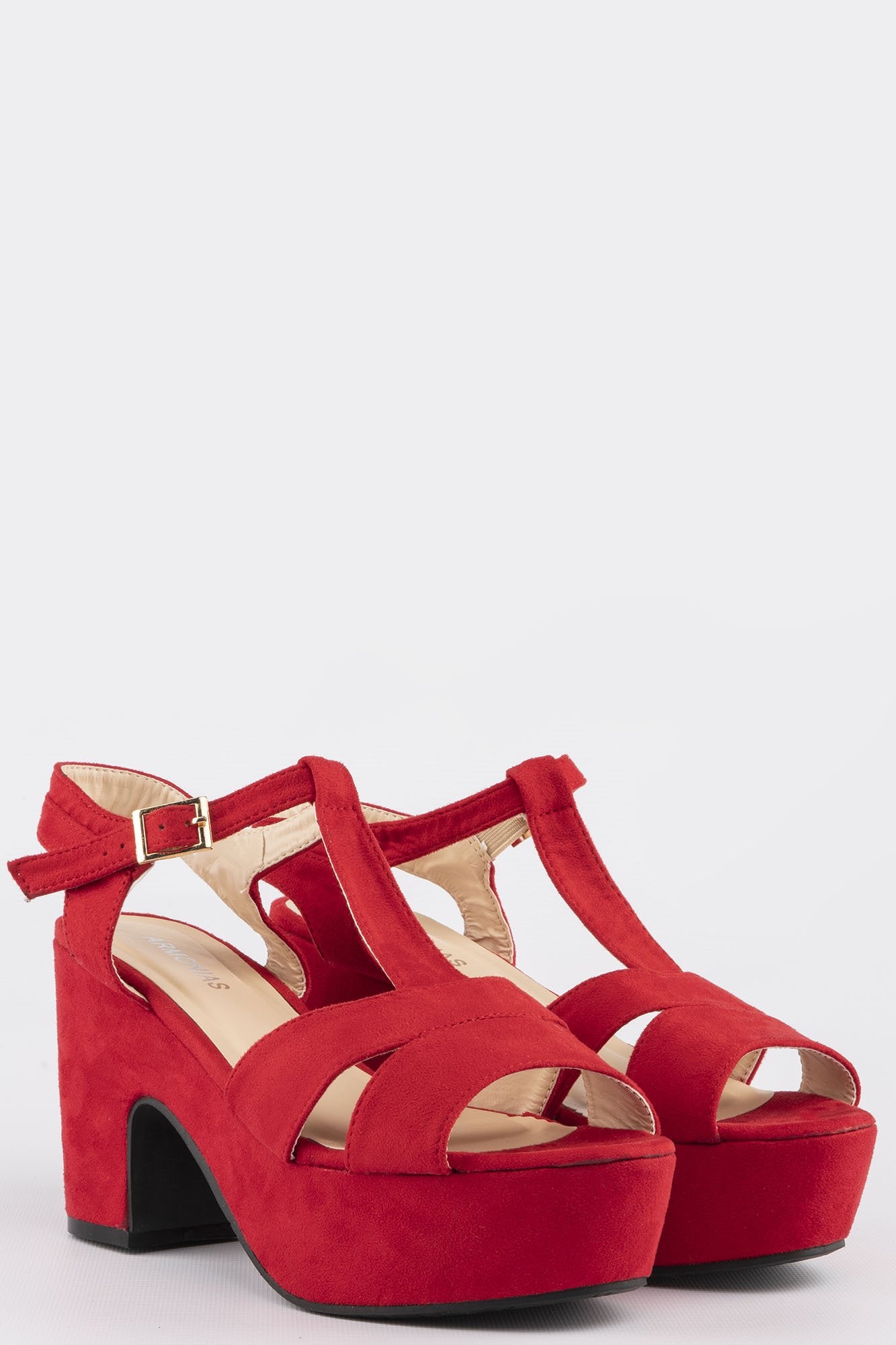 Sandalias de plataforma y tacón ancho de tejido ante, tirantes cruzados, cierre de hebilla. Altura tacón 10 cm, Altura plataforma: 4 cm