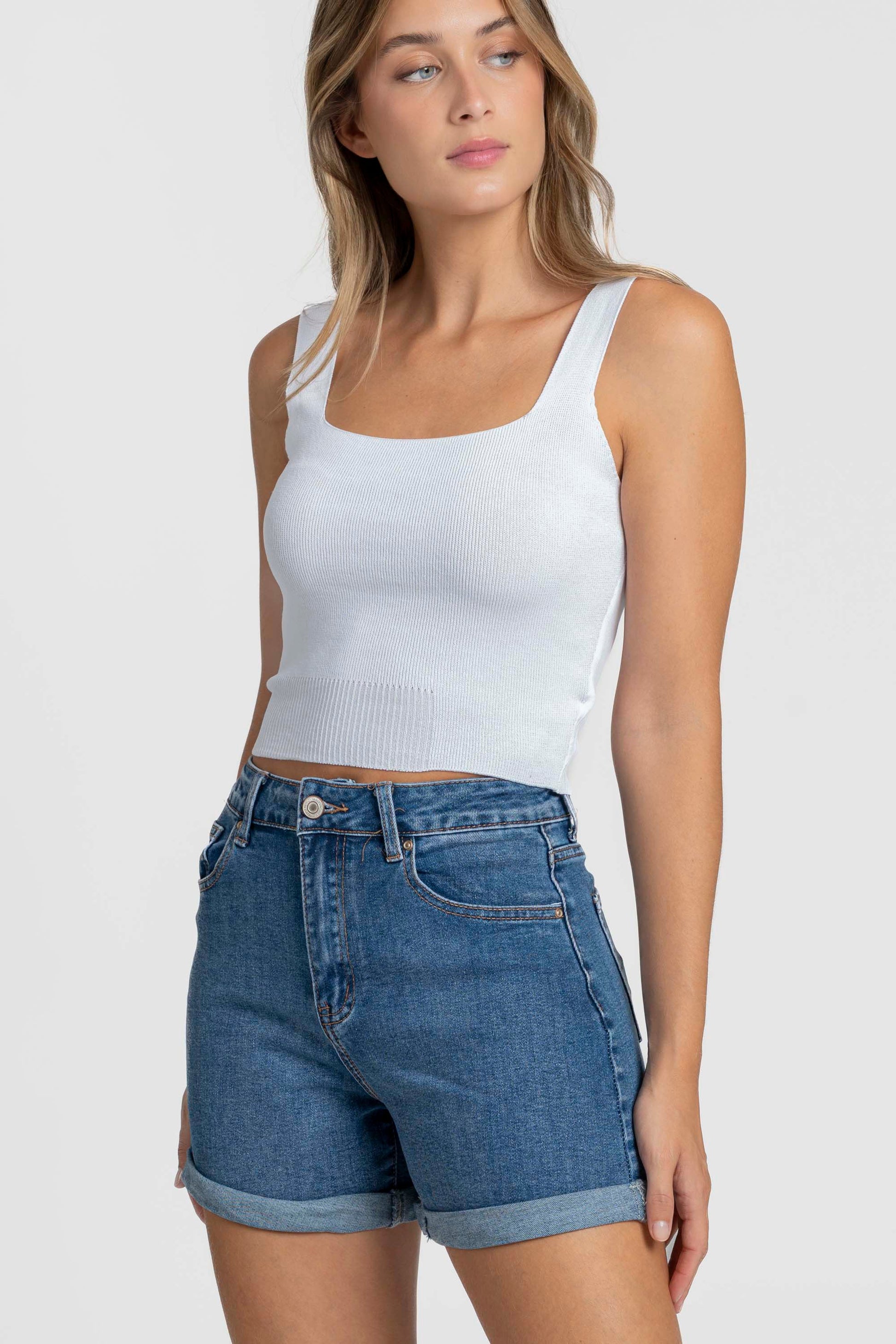 Tejido mezcla de algodón. Tejido tejano vaquero. Tiro medio. Diseño corto. Cinco bolsillos. Cierre de cremallera y botón. Trabillas. Bajo con doblez.