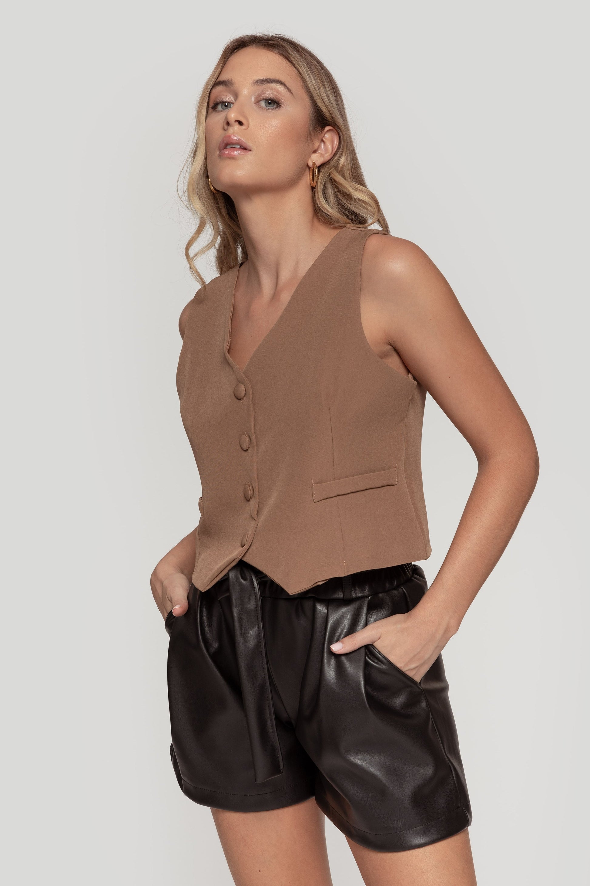 Tejido efecto piel. Diseño mini. Talle alto. Cintura paperbag. Cintura elástica. Bolsillo laterales. Cinturón a contraste. Talla modelo: S. Altura modelo 1,66 m.