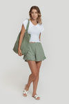 Tejido mezcla lino. Diseño corto. Tiro alto. Cintura elástica. Bajo volante. Talla modelo: S. Altura modelo 1,70 m.