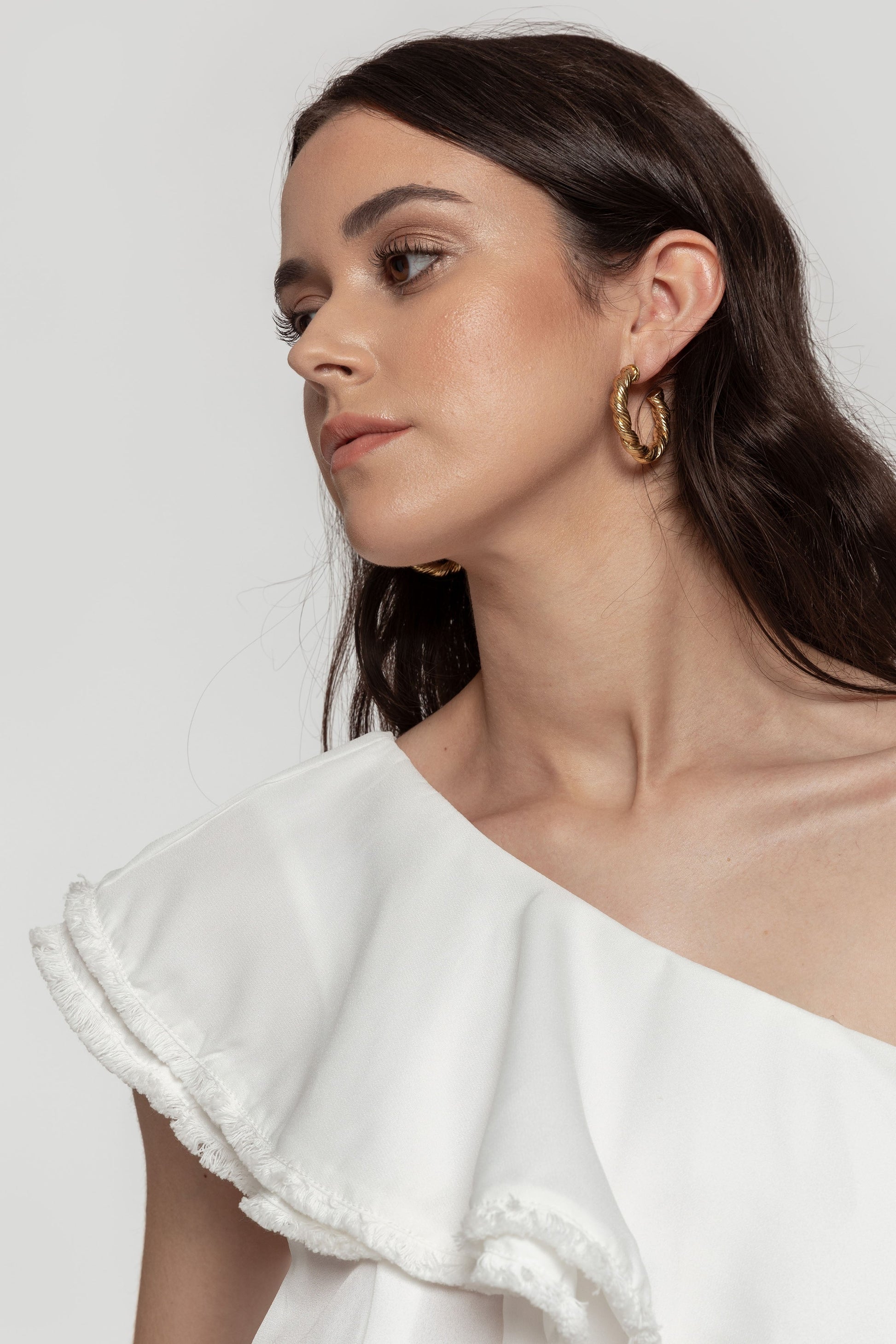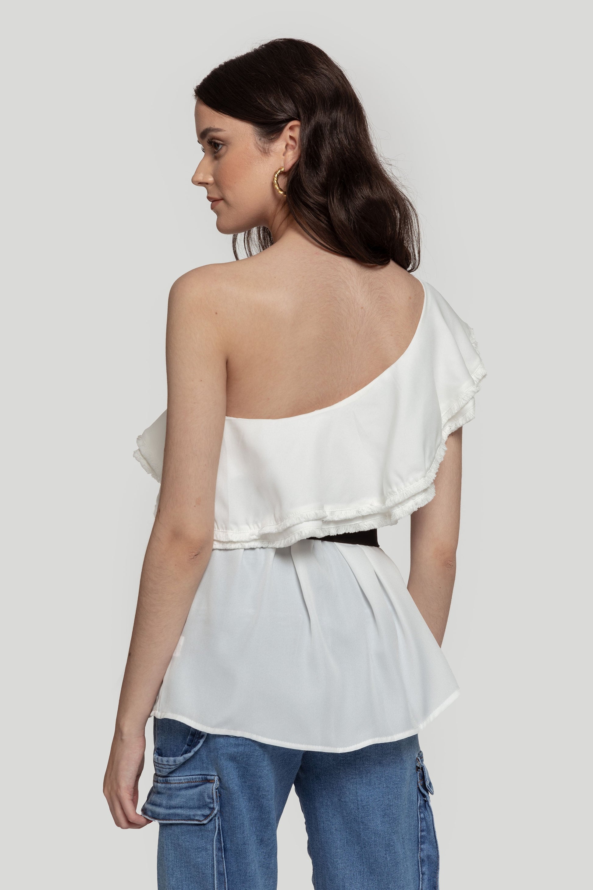 Top fluido. Tejido de gasa. Diseño amplio. Cuello asimétrico. Sin mangas. Detalle volante. Talla modelo: S. Altura modelo: 1,67 m.