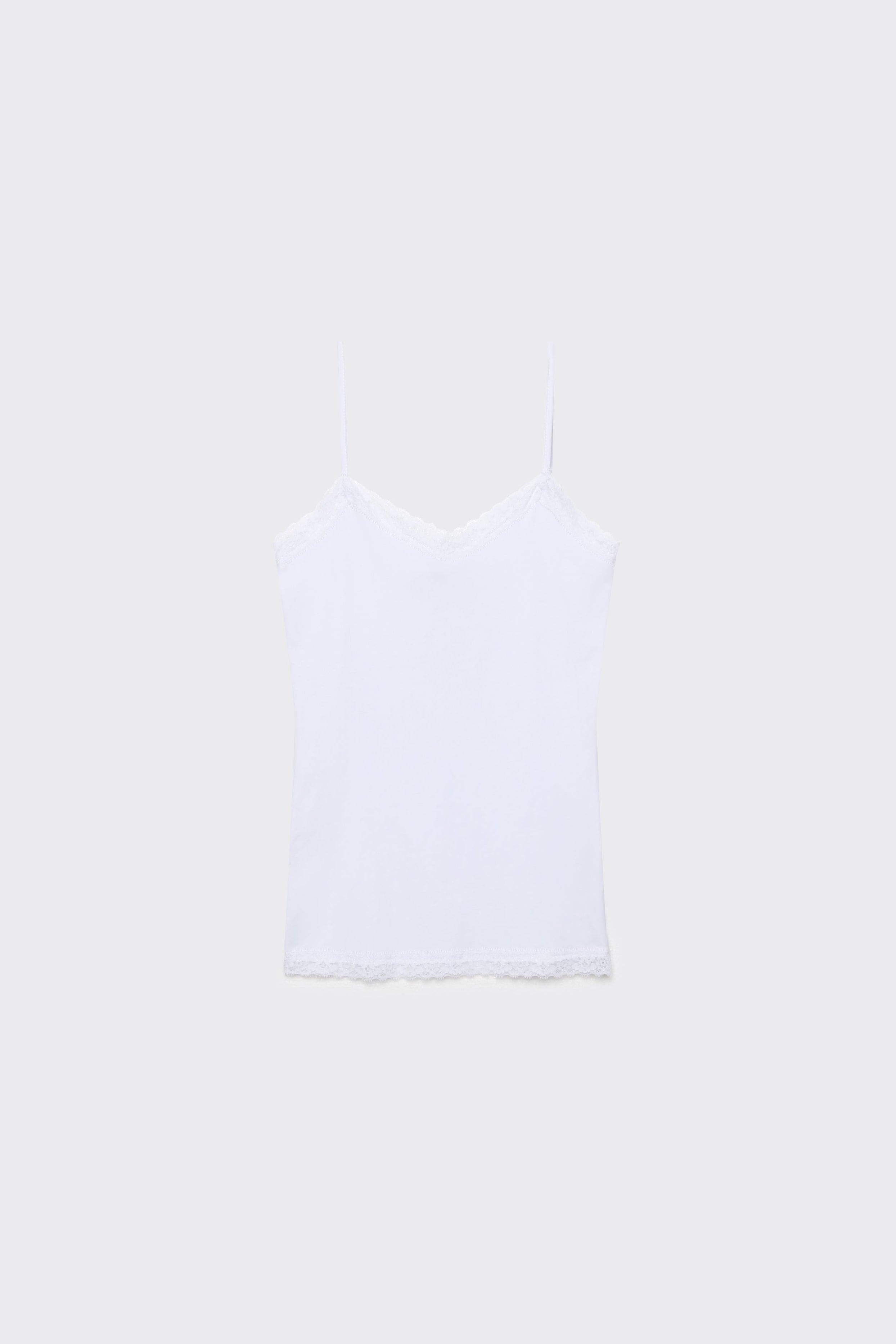 Tejido mezcla de algodón. Diseño recto. Diseño básico. Diseño ajustado. Tirantes finos. Acabados con encaje. Talla modelo: S. Altura modelo 1,65 m.