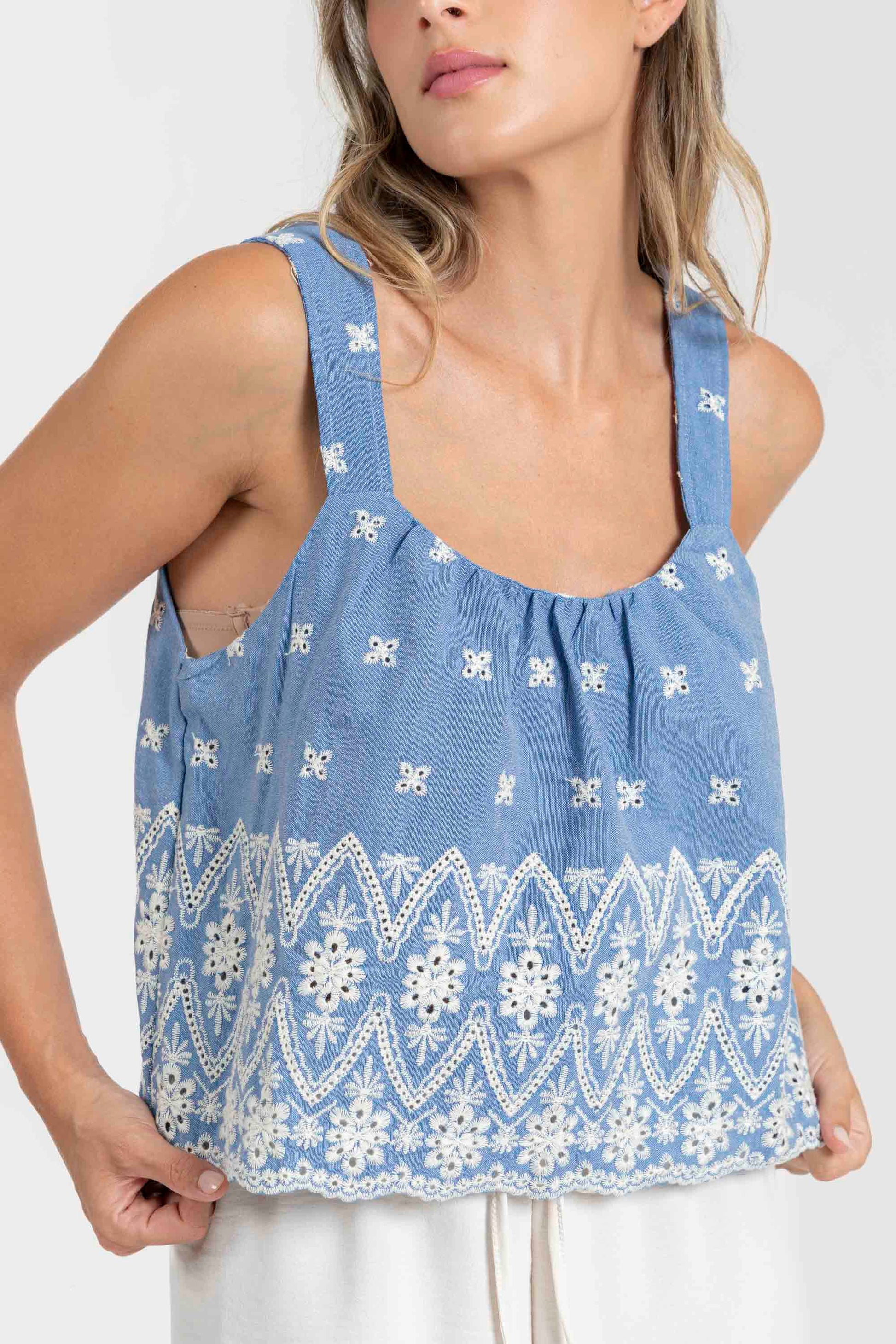 Tejido mezcla algodón. Cuello redondo. Tirantes anchos. Detalle bordados.