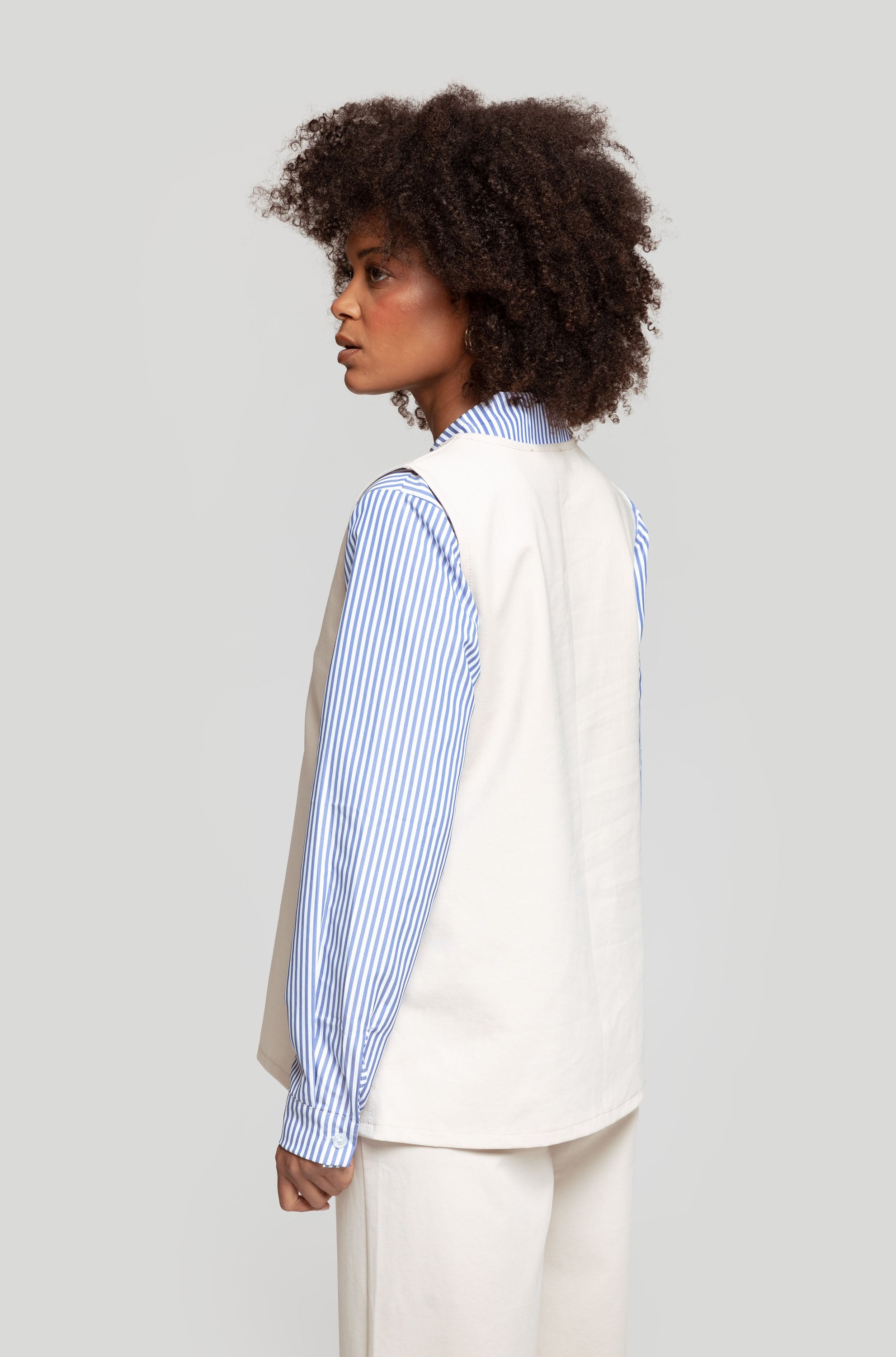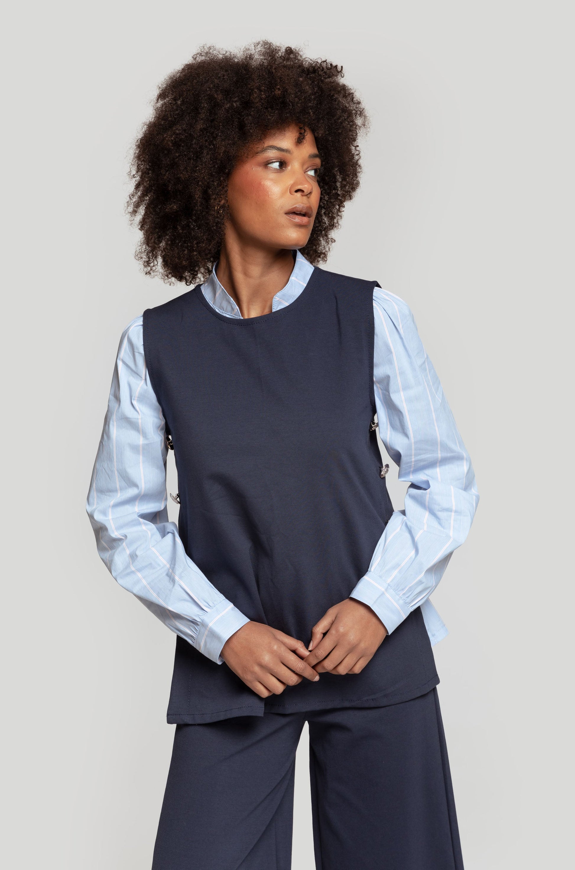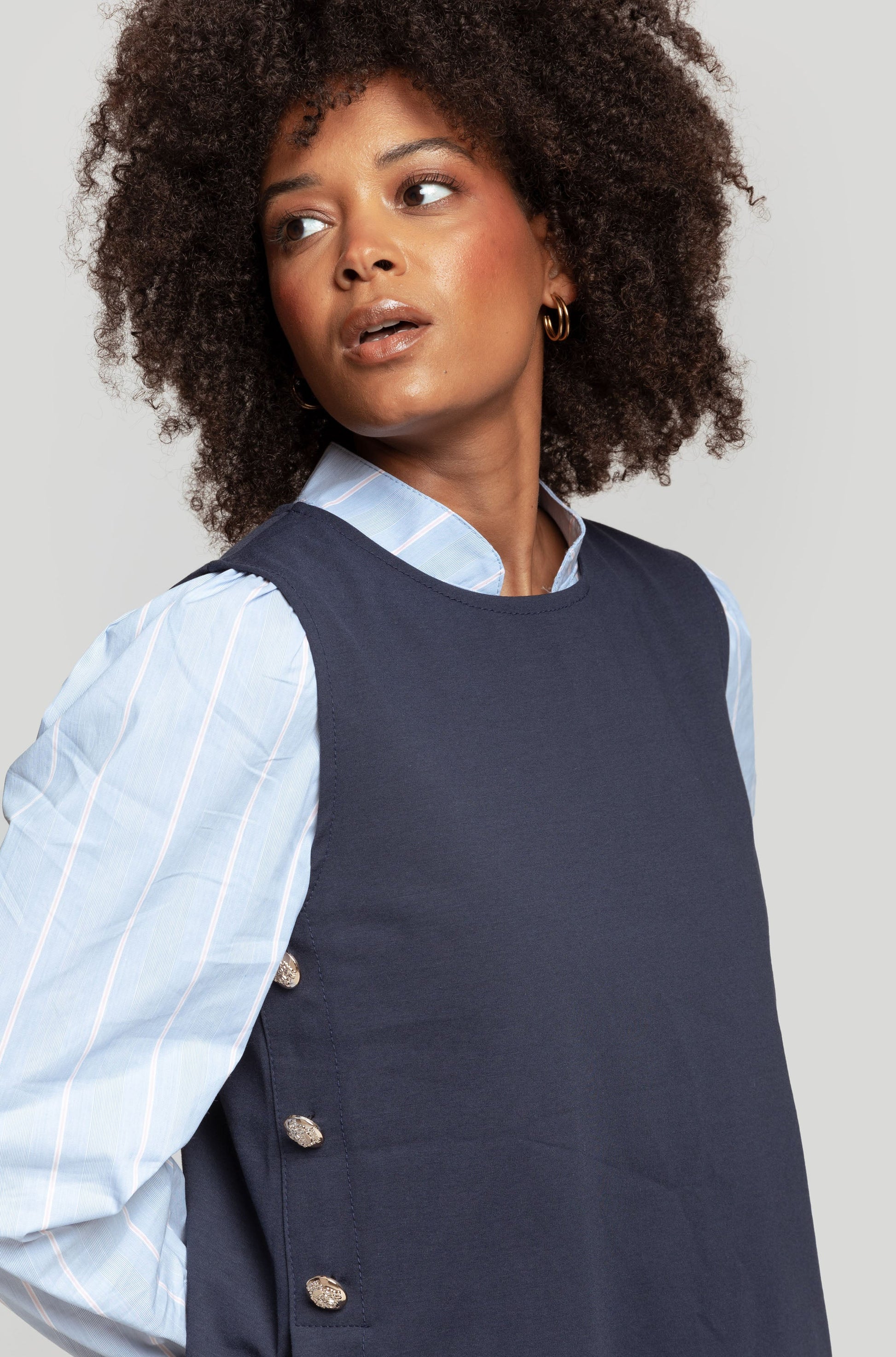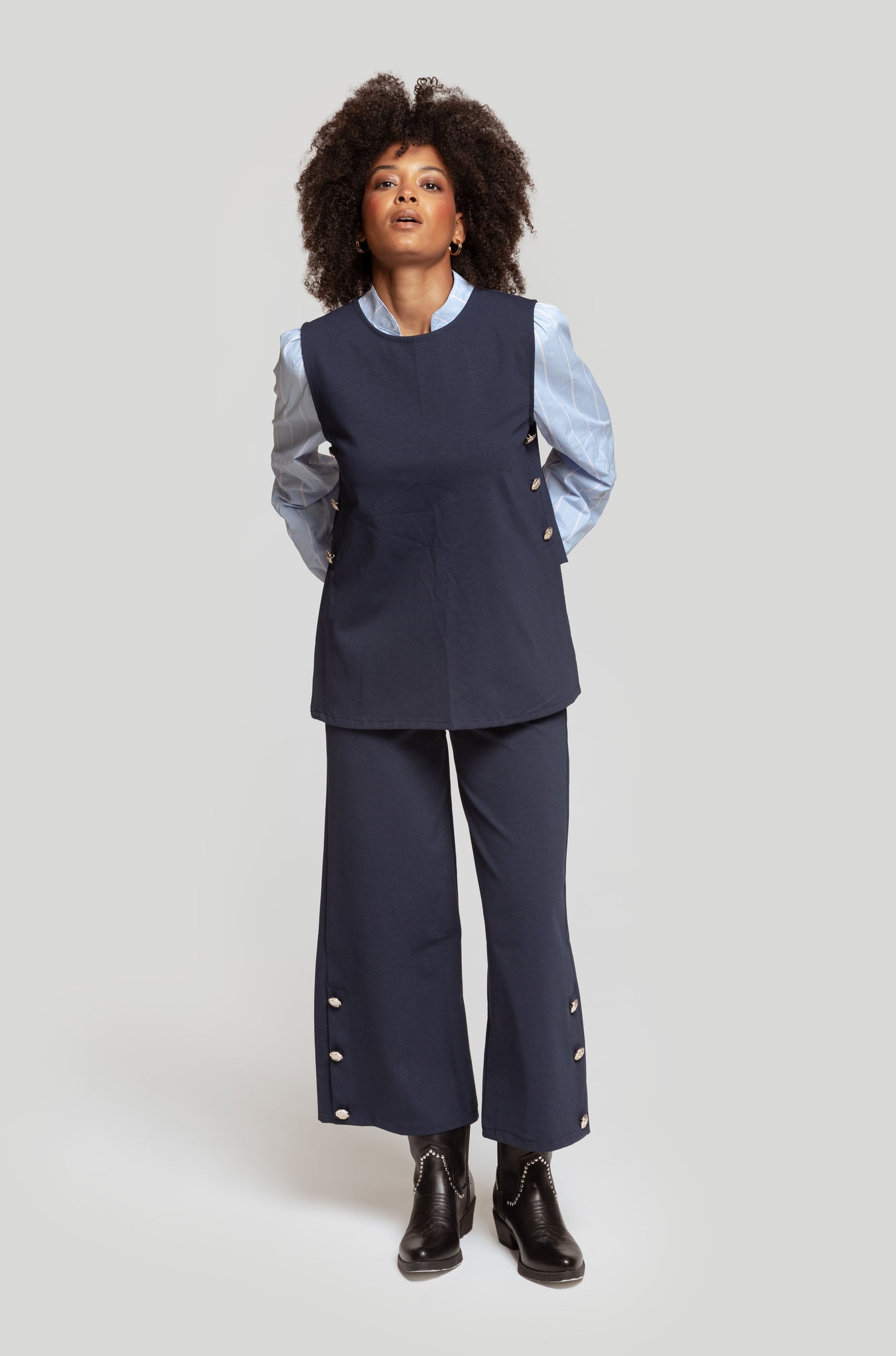 Tejido mezcla de algodón. Diseño largo. Diseño fluido. Cuello redondo. Manga sisa. Botones decorativos. Talla modelo: S. Altura modelo: 1.65 m.