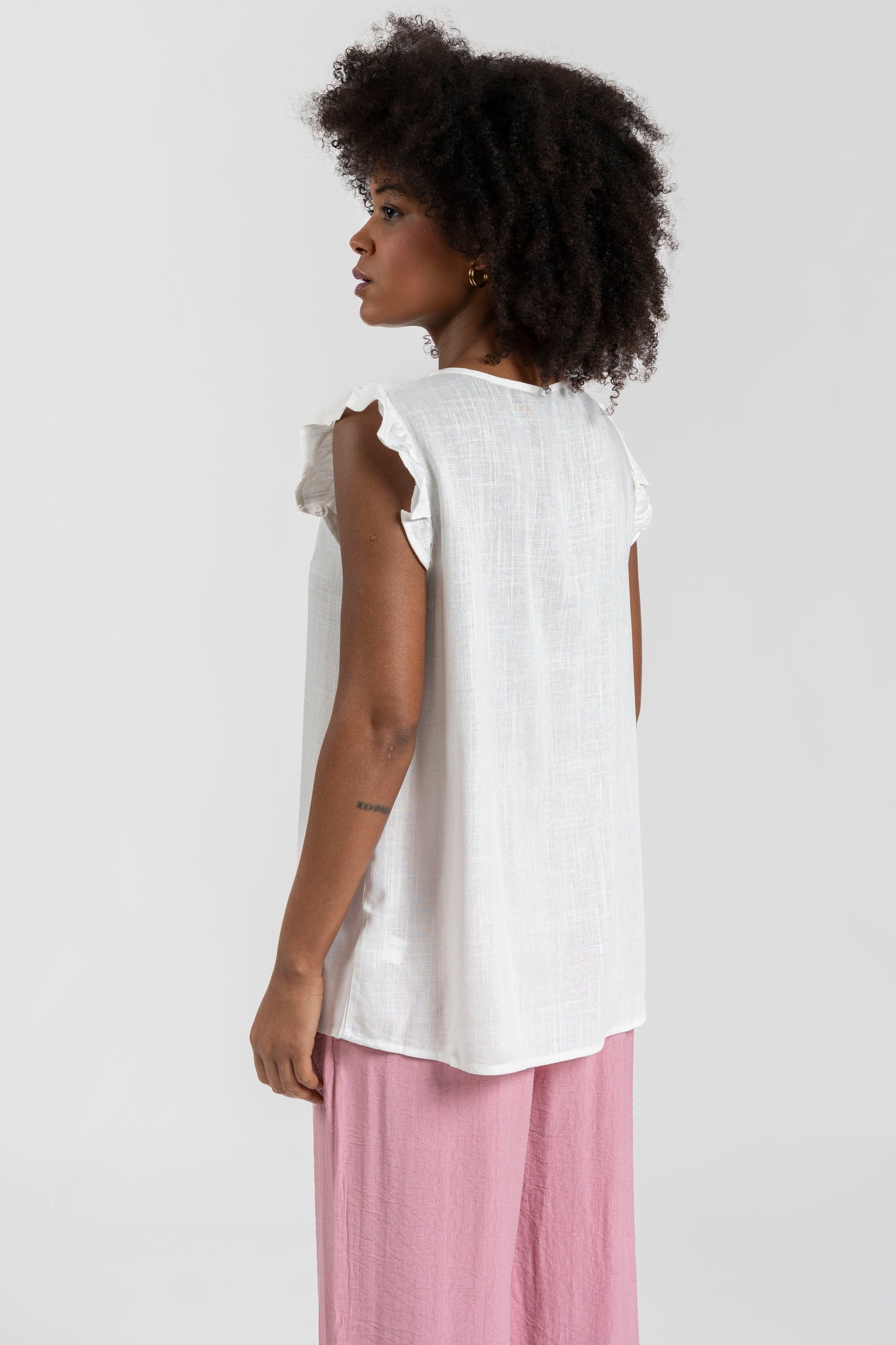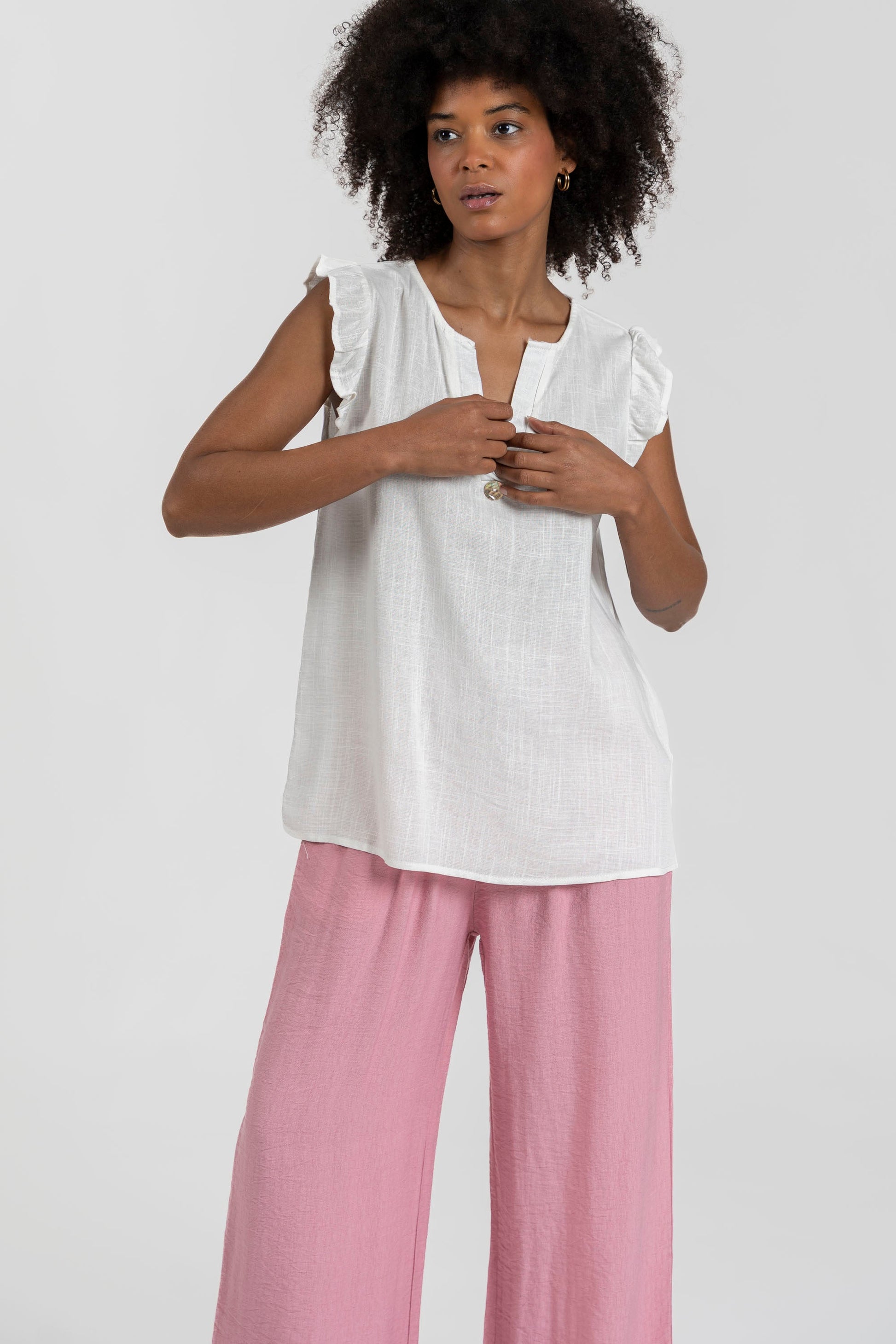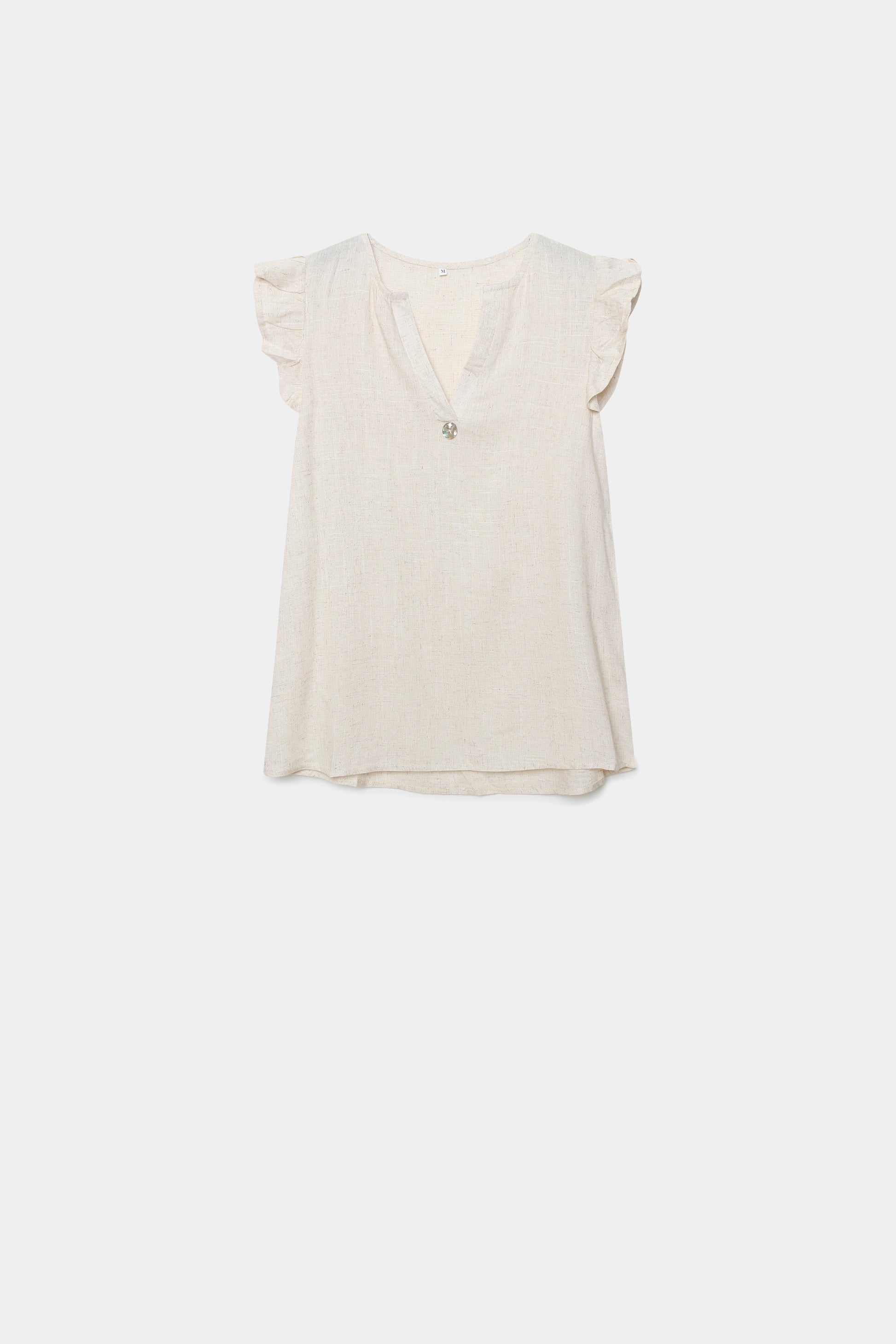Tejido de algodón. Diseño recto. Cuello pico. Manga sisa. Detalle botón. Talla modelo: S. Altura modelo: 1,65 m.
