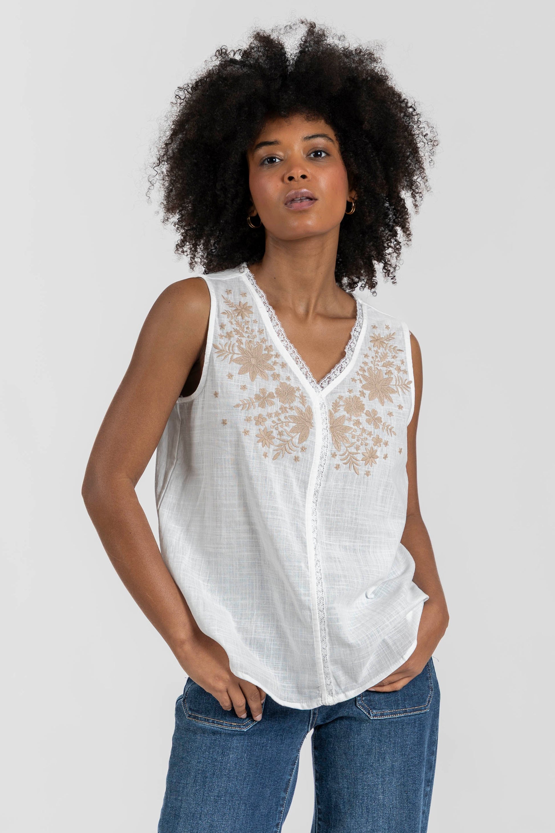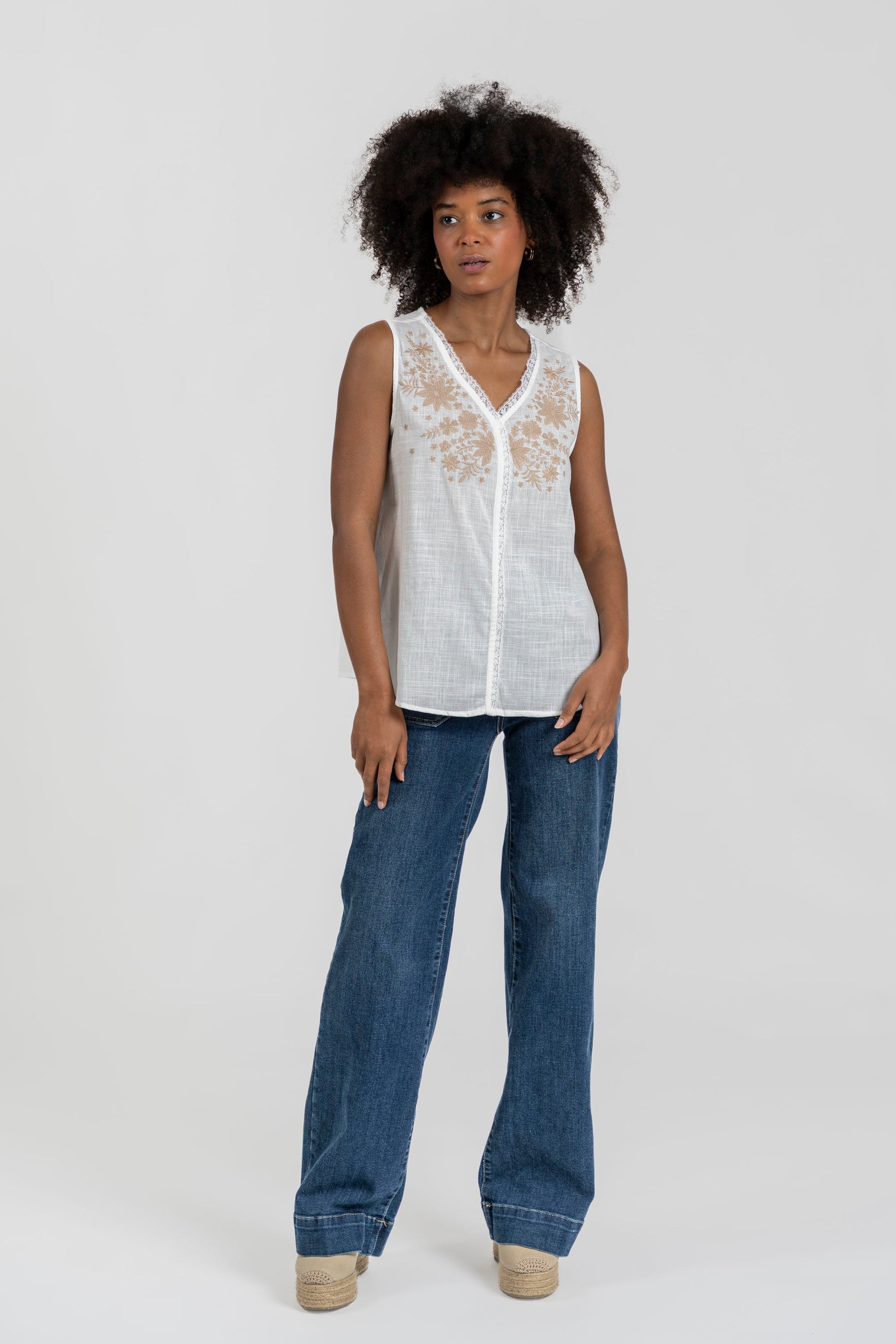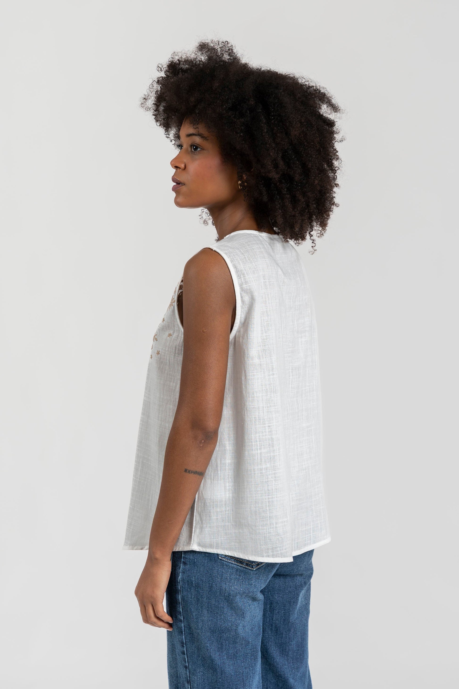 Tejido de algodón. Diseño recto. Cuello pico. Manga sisa. Detalle botón. Talla modelo: M. Altura modelo: 1,65 m.