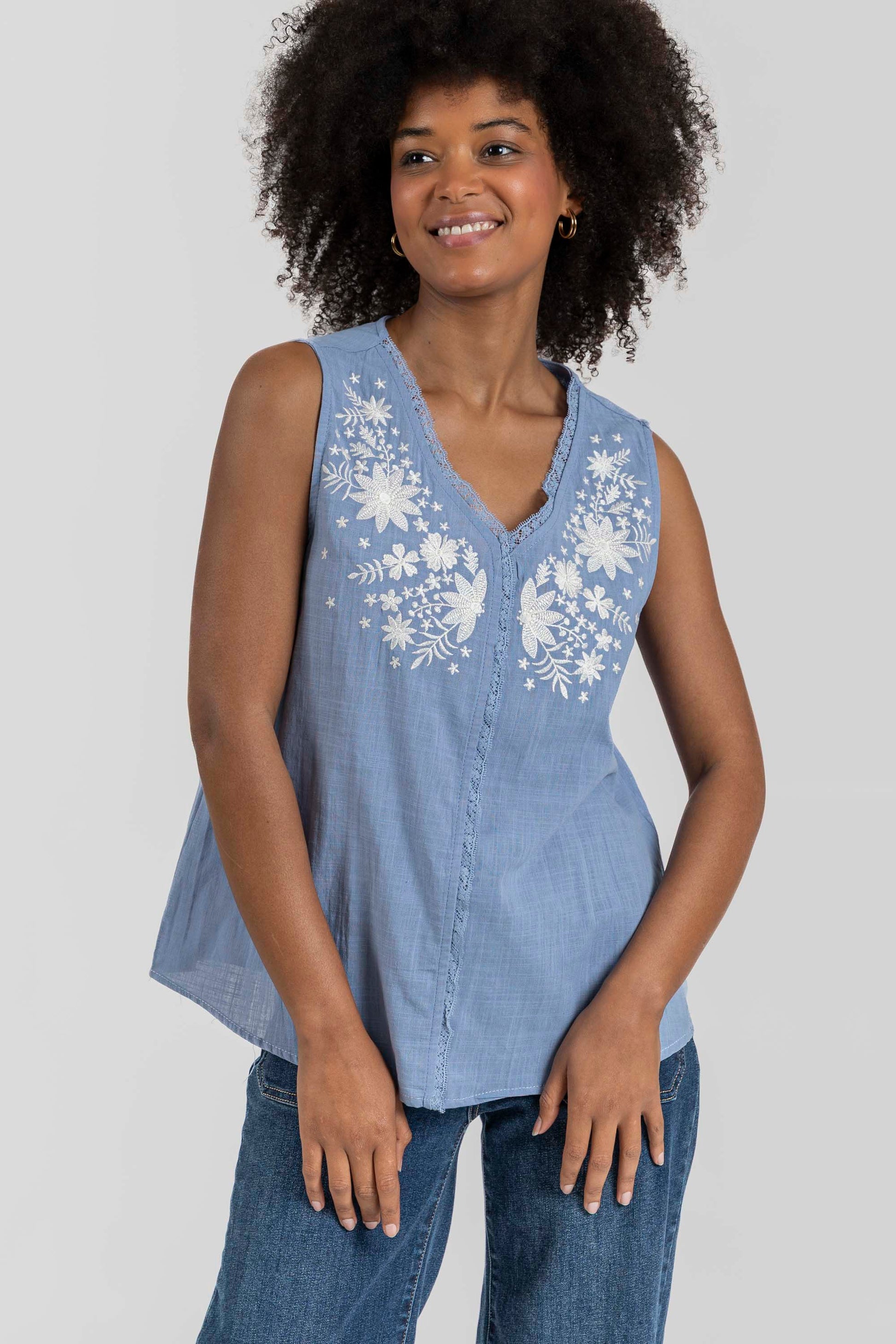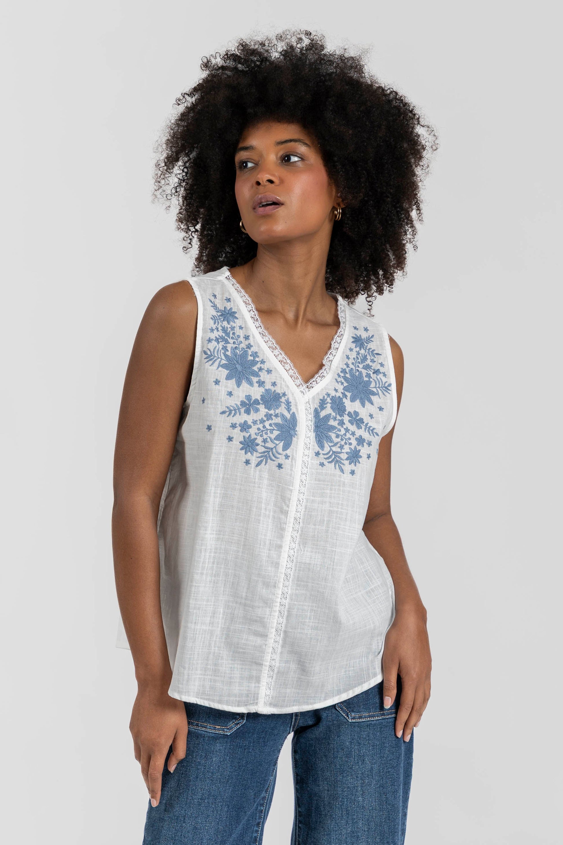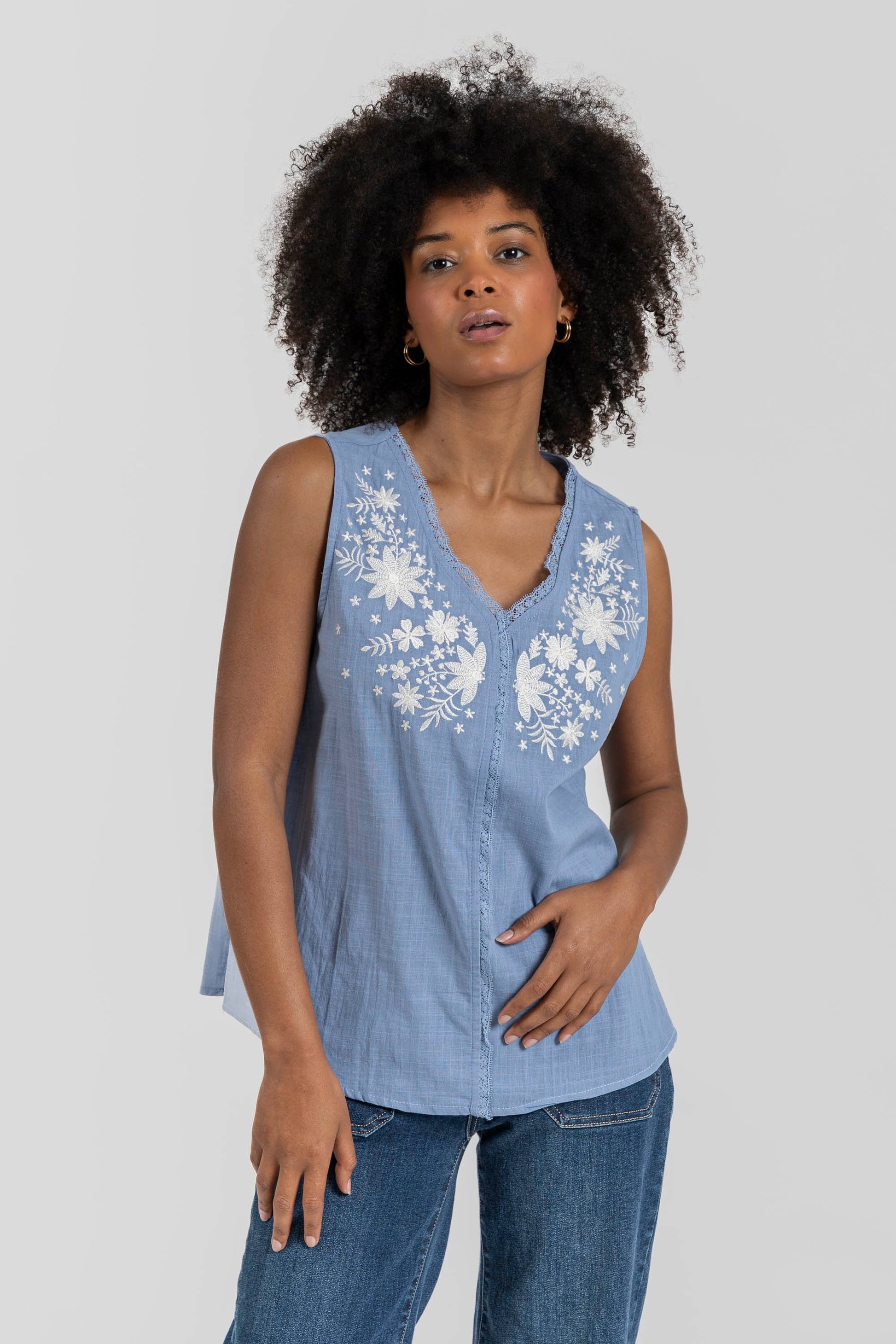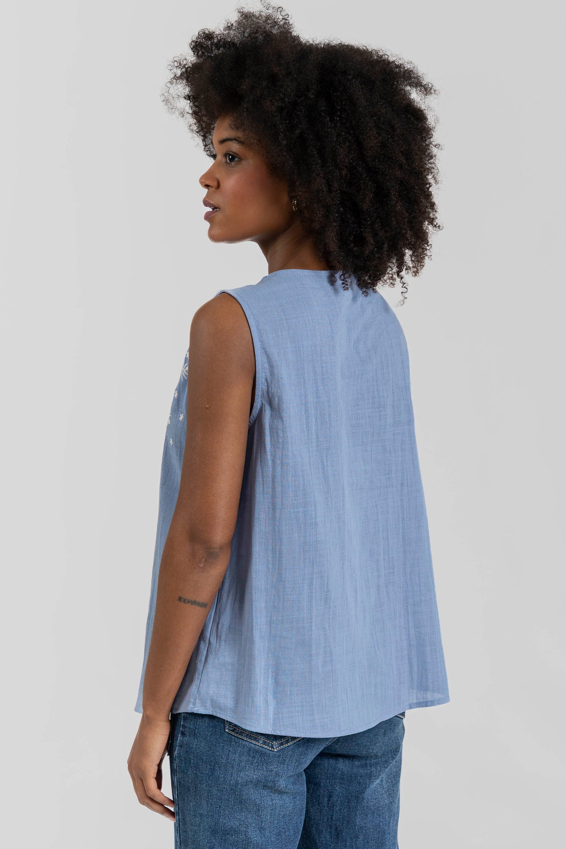 Tejido de algodón. Diseño recto. Cuello pico. Manga sisa. Detalle botón. Talla modelo: M. Altura modelo: 1,65 m.
