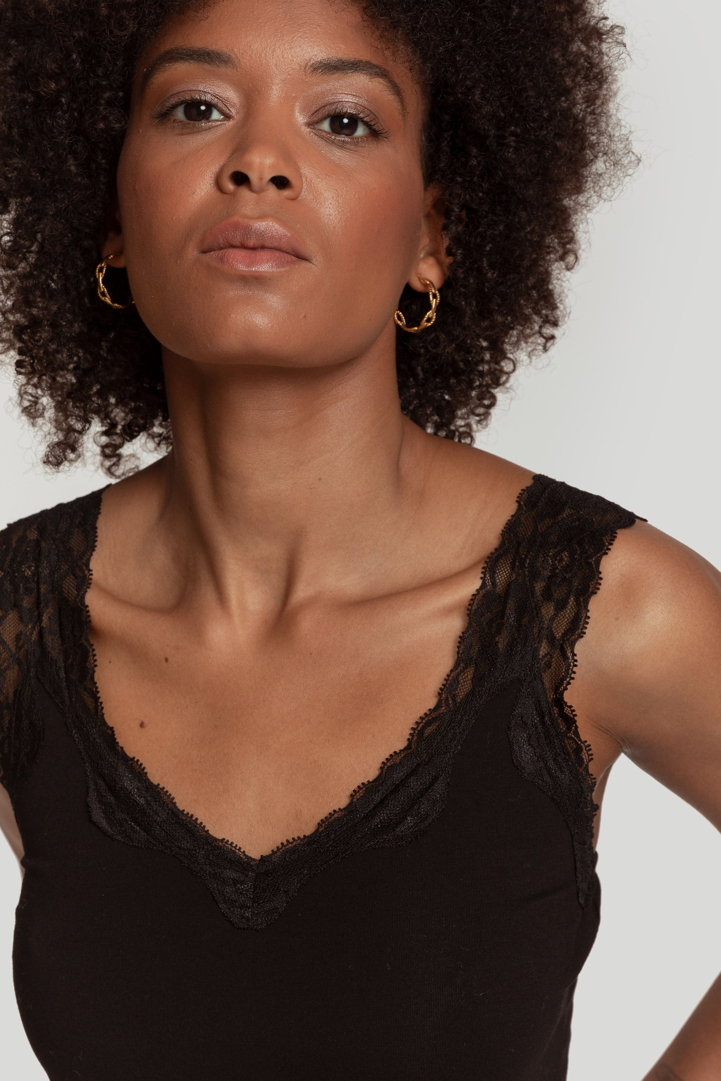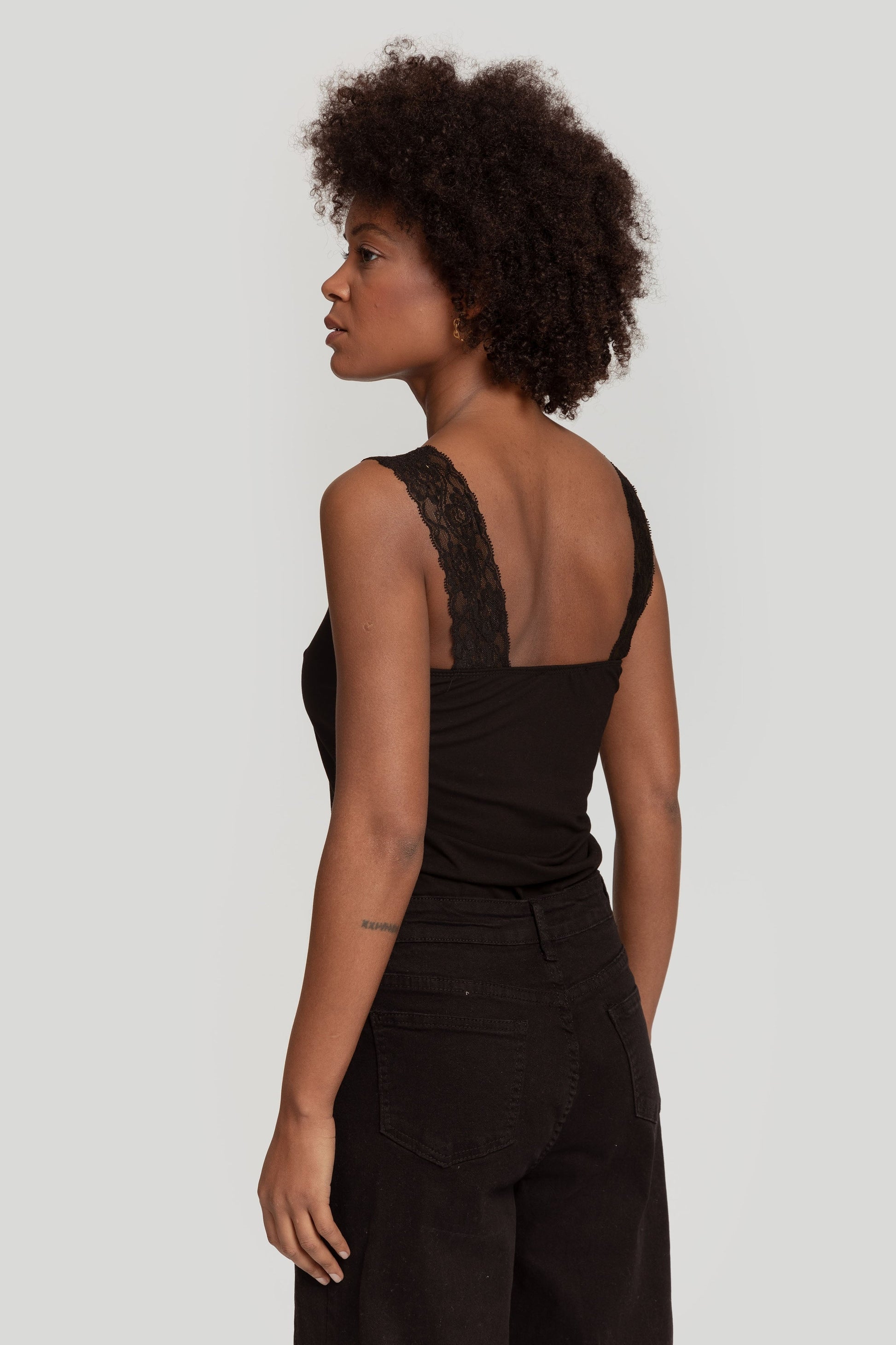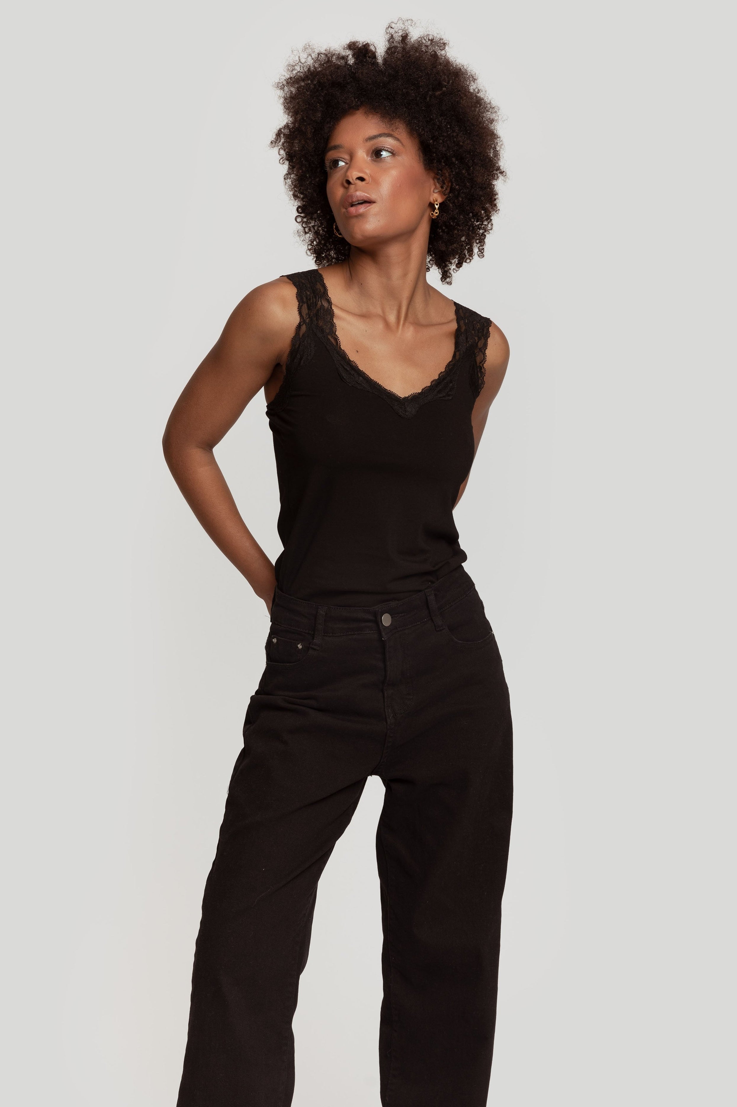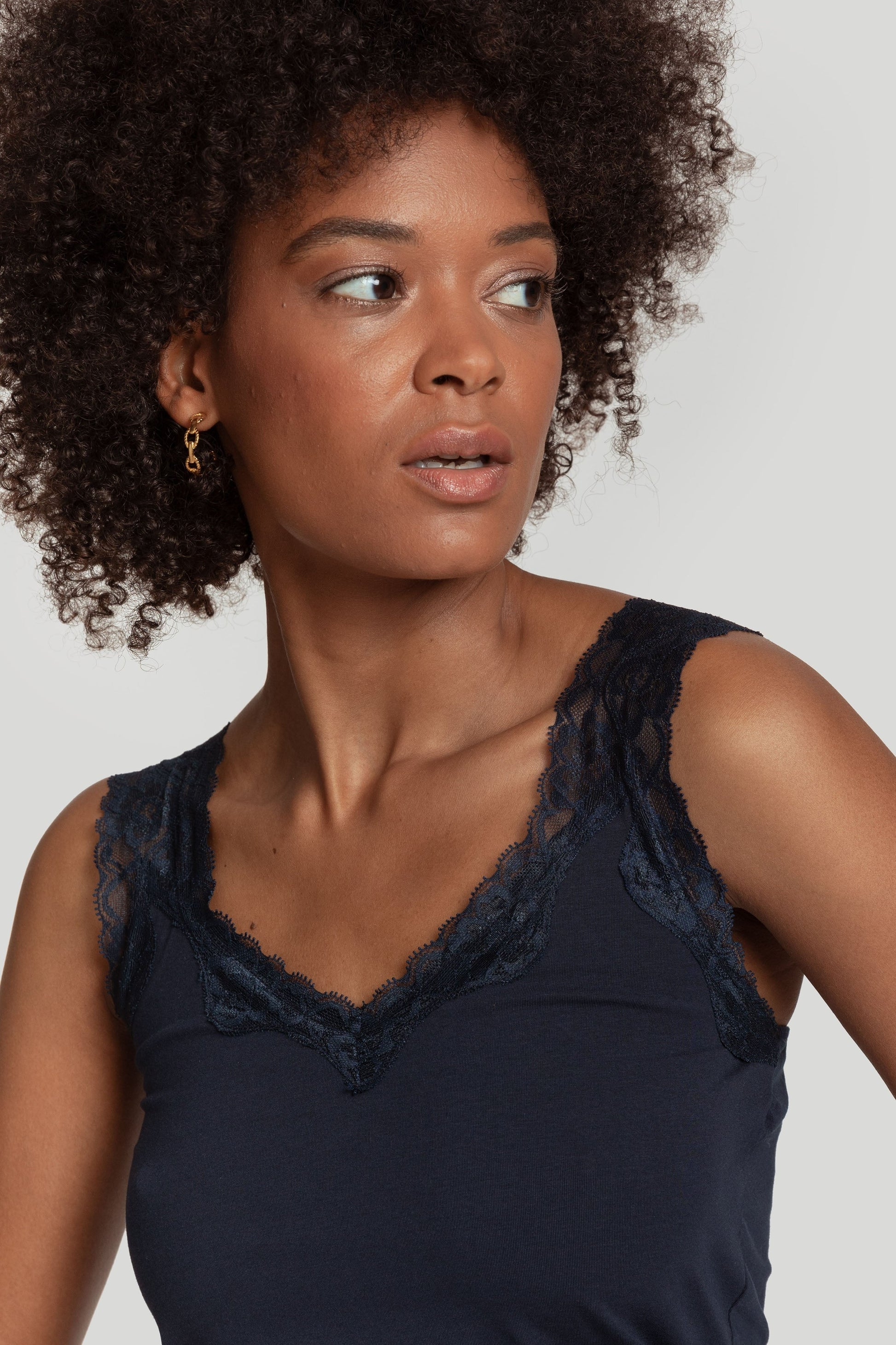 Tejido mezcla de algodón. Diseño recto. Diseño básico. Diseño ajustado. Tirantes anchos. Detalles con encaje. Talla modelo: S. Altura modelo 1,65 m.