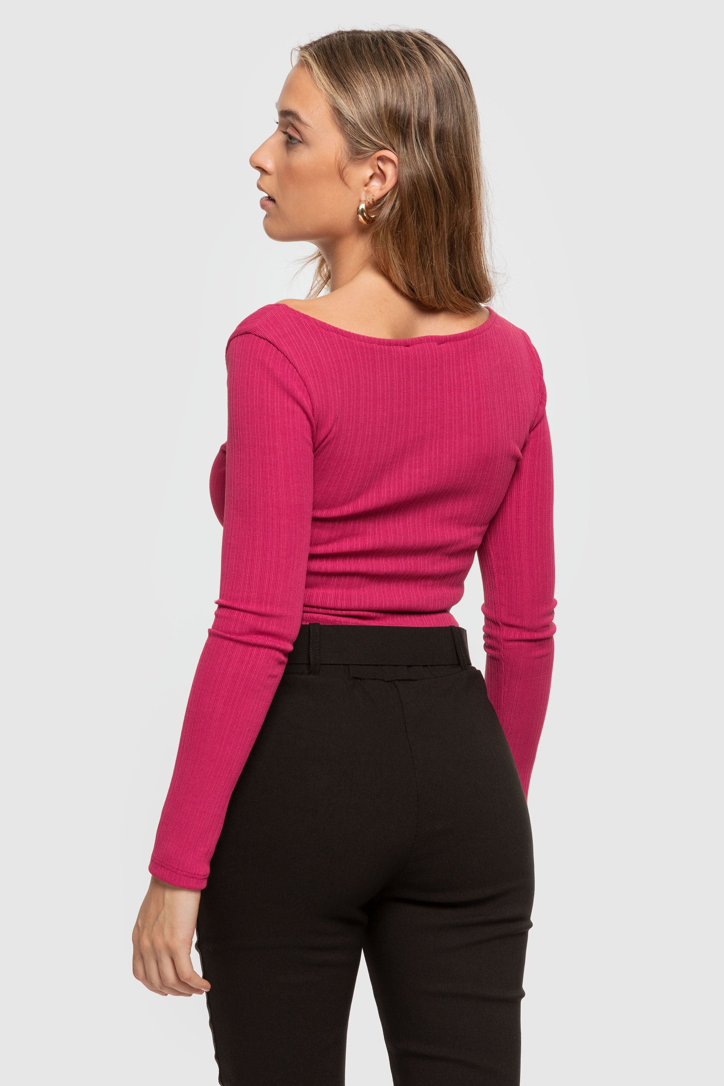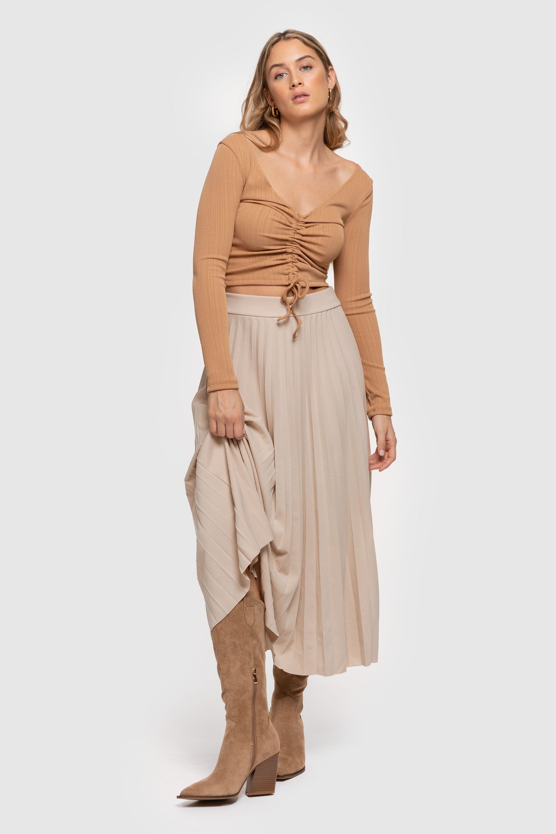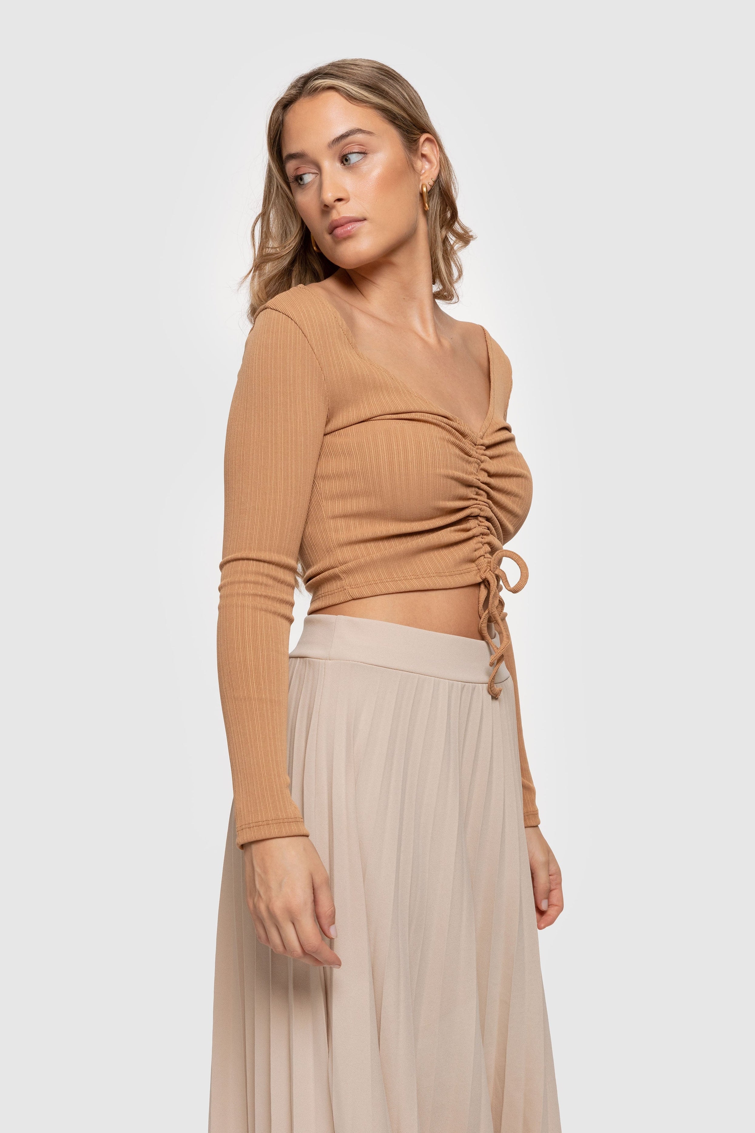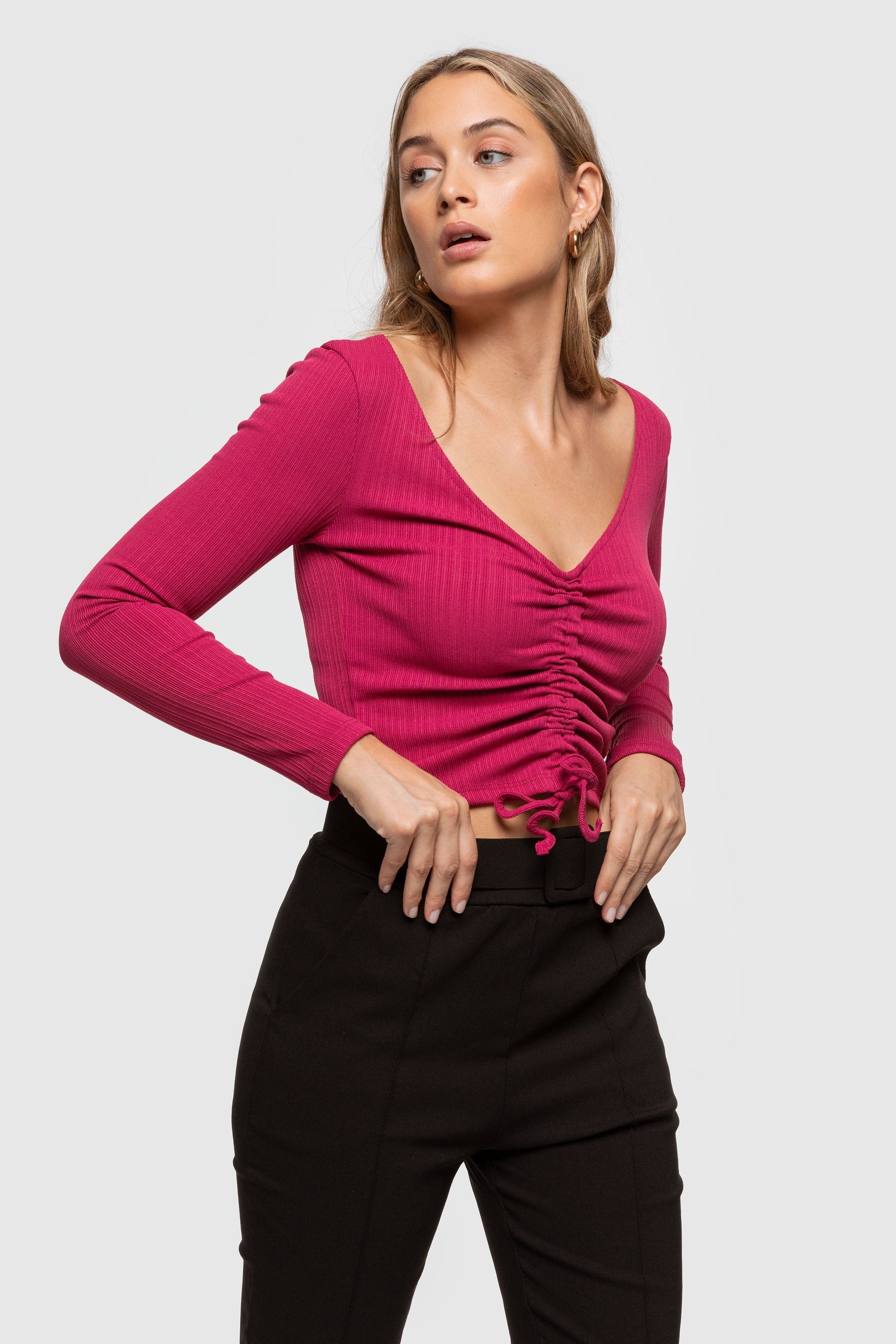 Top de ajustado. Tejido acabado con textura. Diseño corto. Diseño ajustado. Cuello pico. Manga larga. Cuerpo frunce. Talla modelo: S. Altura modelo 1,66 m.