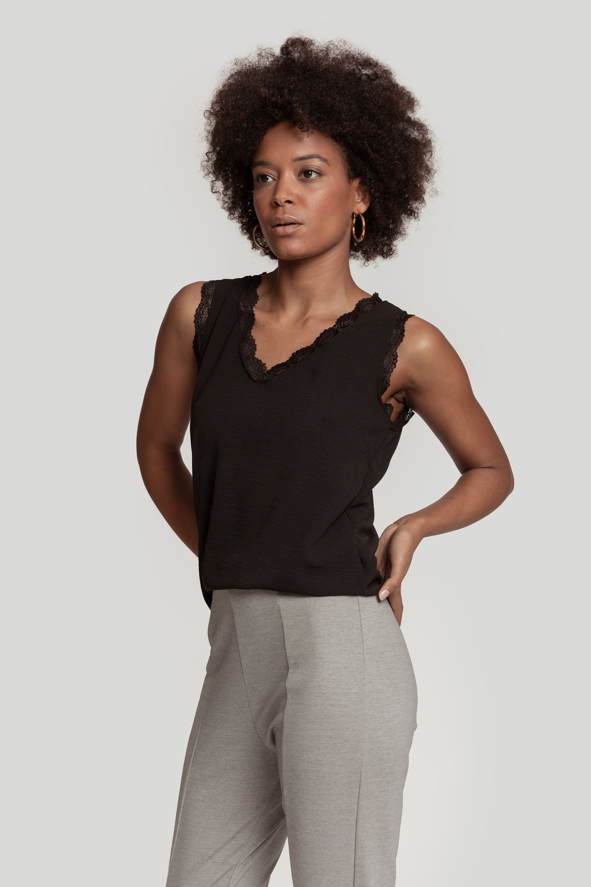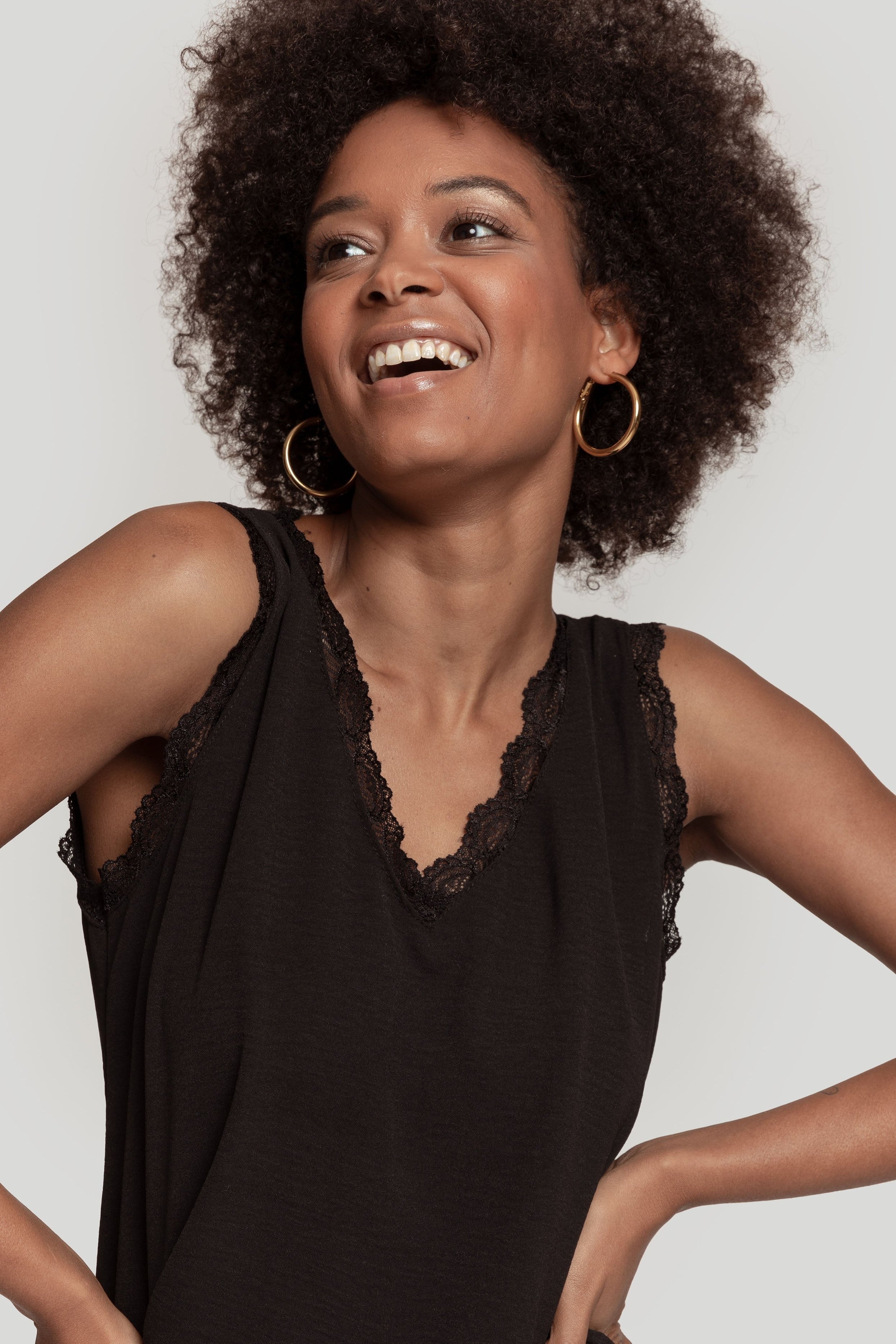Tejido de gasa. Diseño recto. Cuello pico. Manga sisa. Detalles encaja. Talla modelo: S. Altura modelo: 1,65 m.