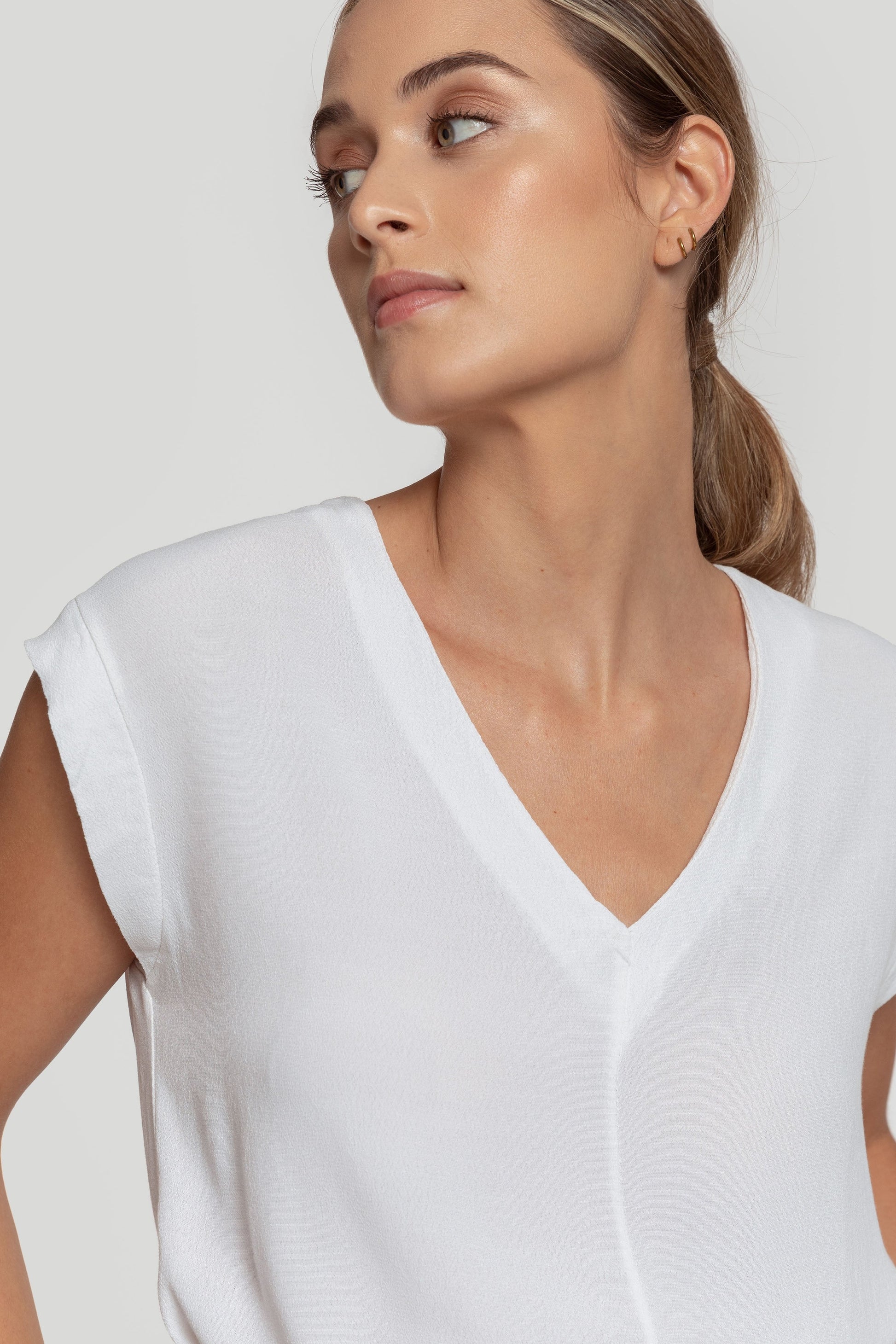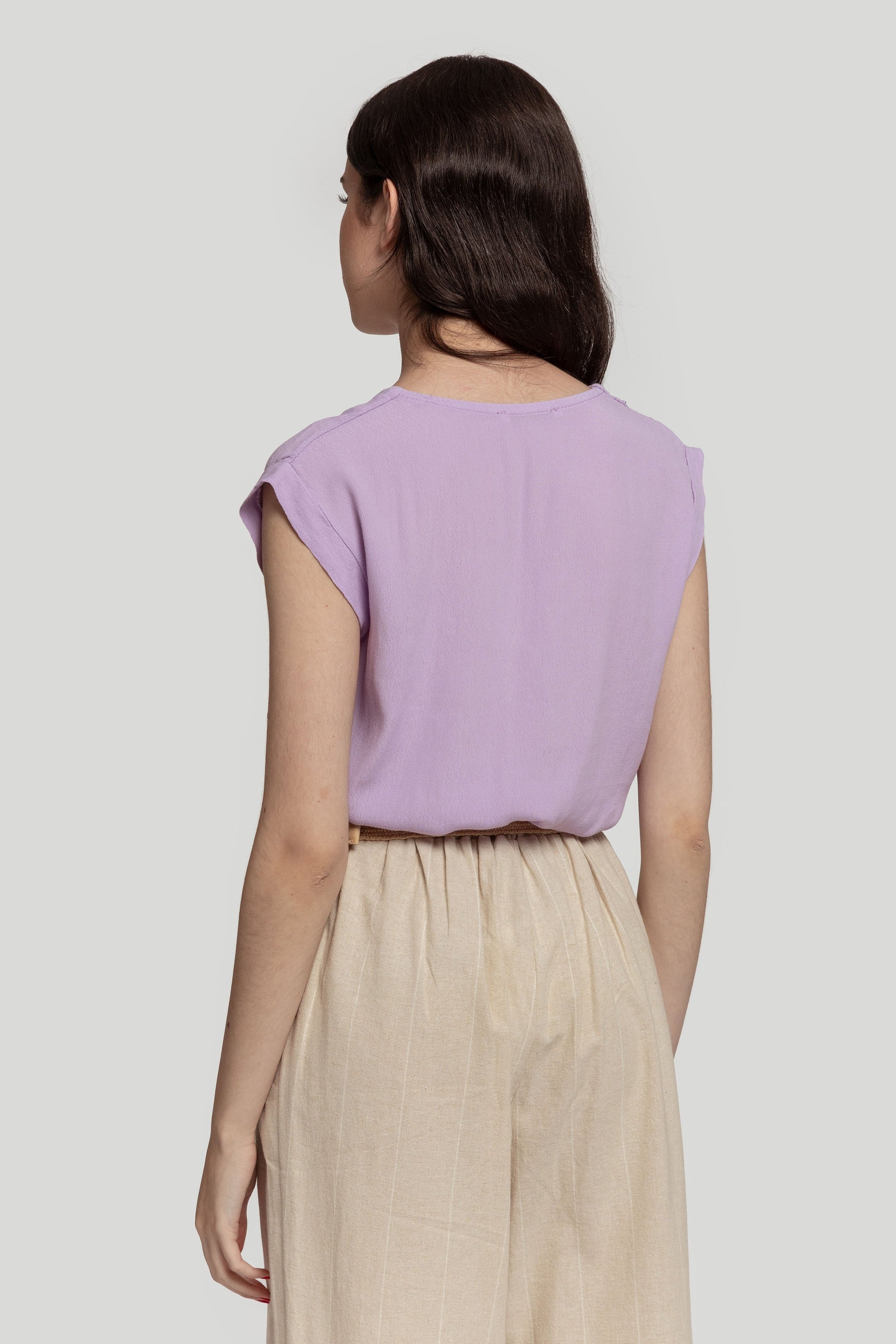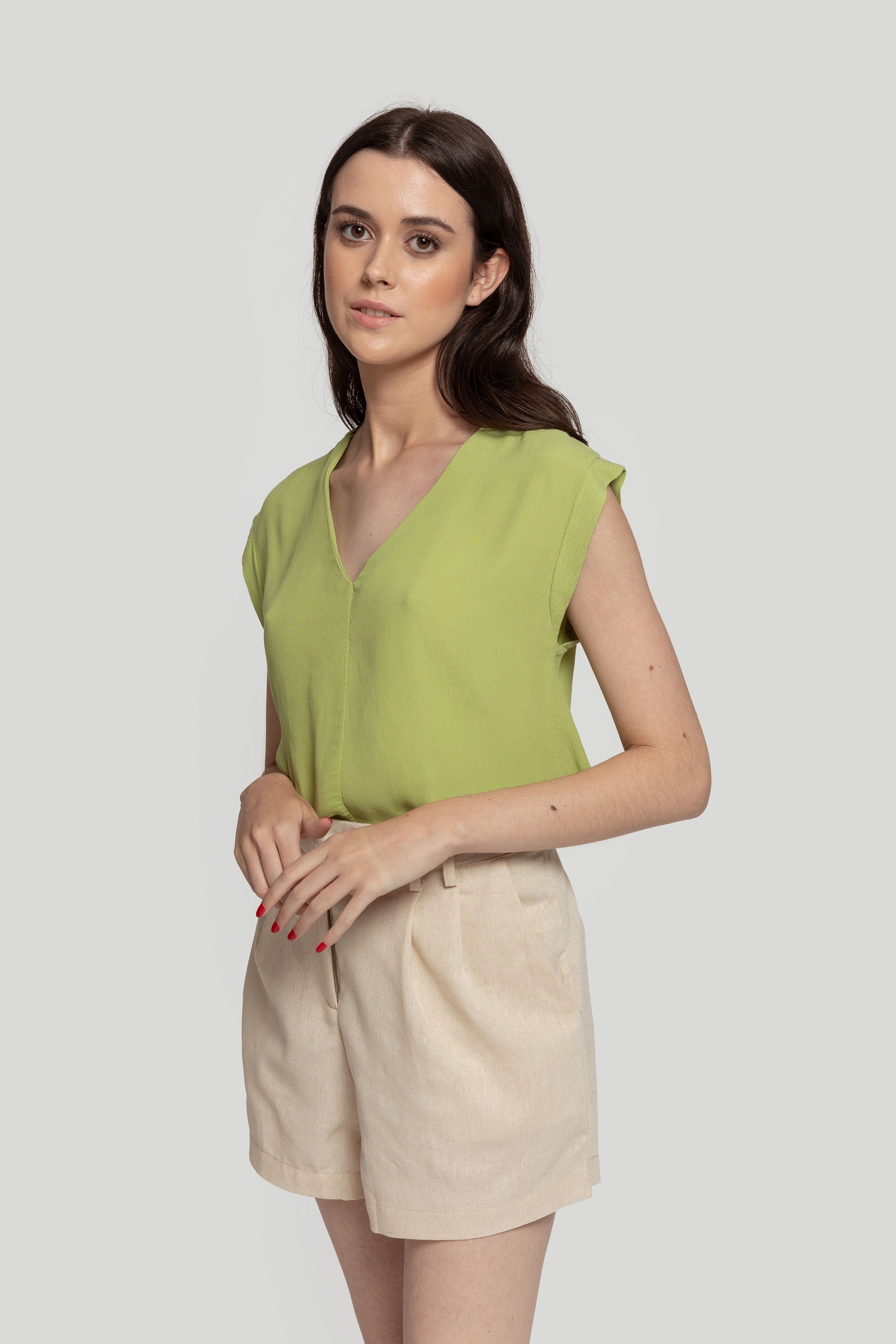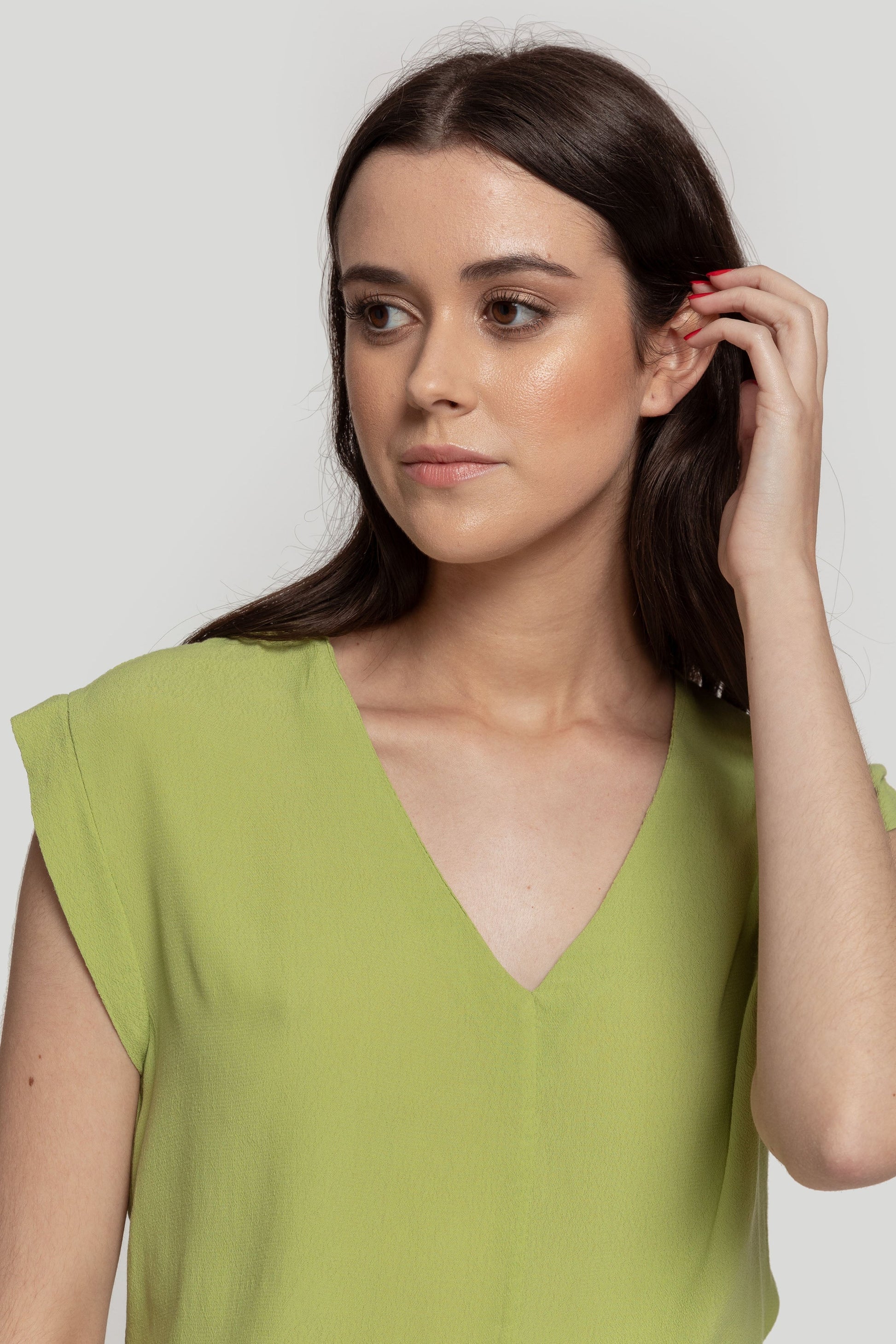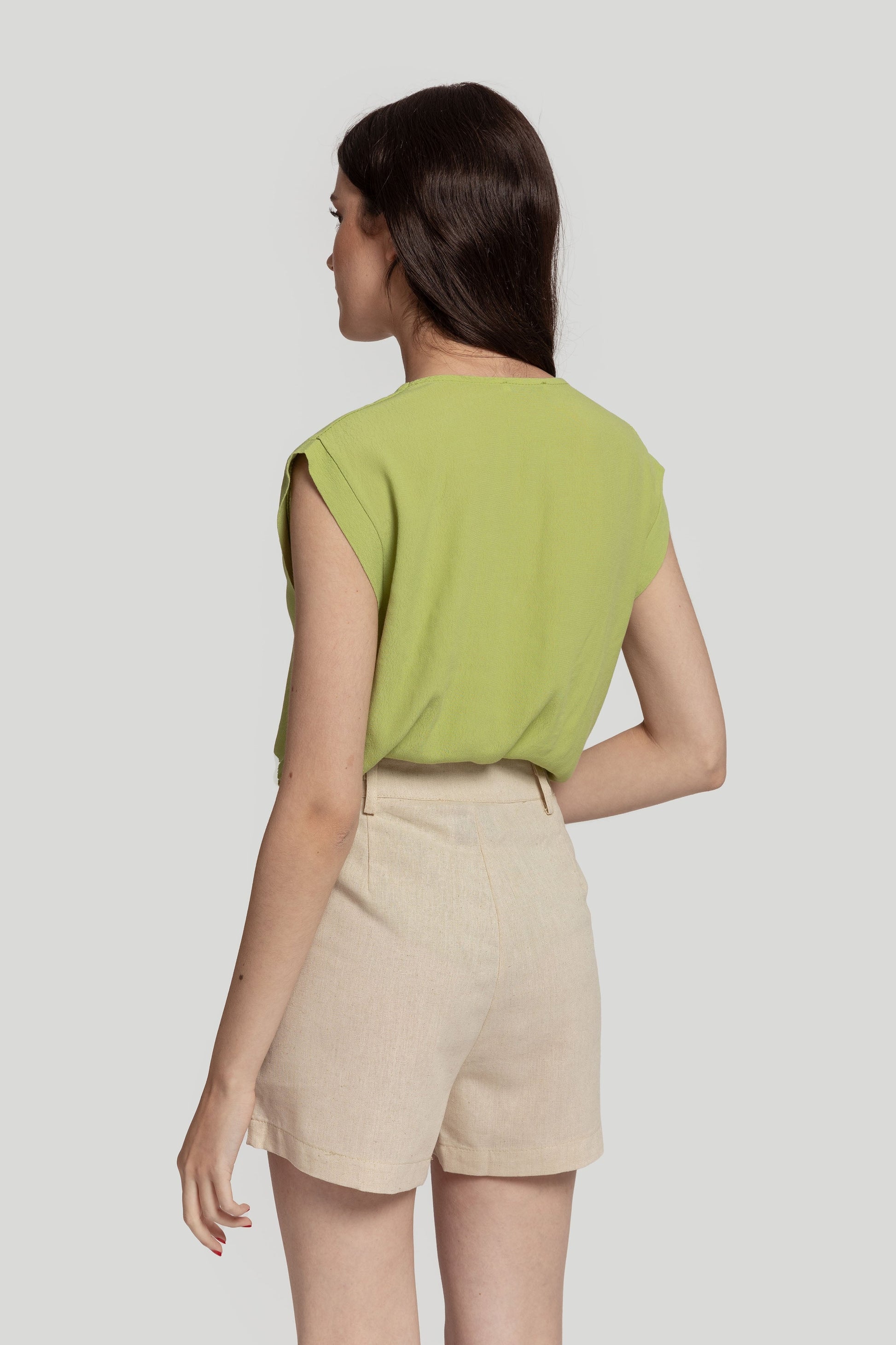 Tejido de gasa. Diseño recto. Diseño amplio. Cuello pico. Sin mangas. Costura frontal. Talla modelo: S. Altura modelo 1,66 m.