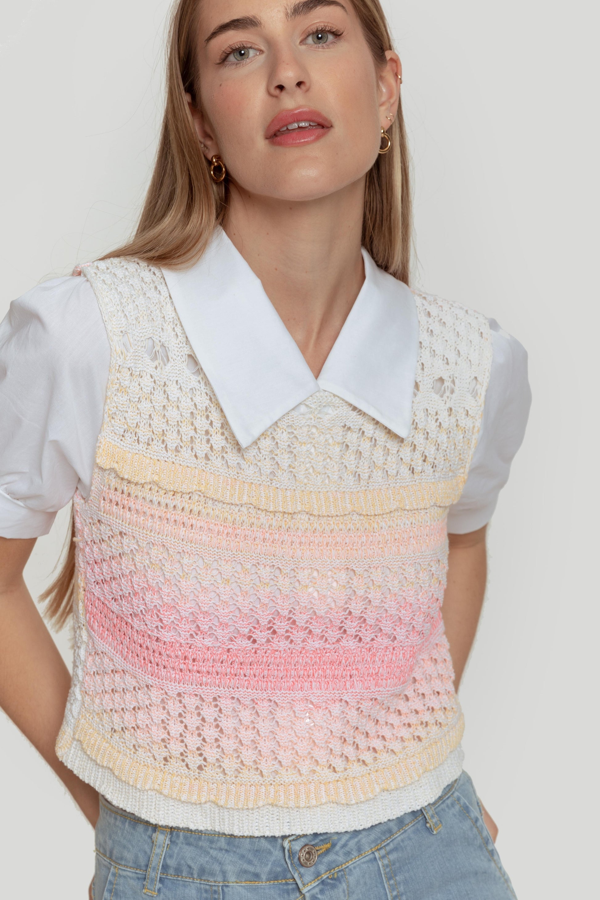 Tejido de punto. Tejido mezcla de algodón. Tejido calado. Diseño trenzado. Diseño estampado multicolor. Diseño recto. Cuello U. Manga sisa. Terminaciones en rib. Talla modelo: S. Altura modelo 1,65 m.