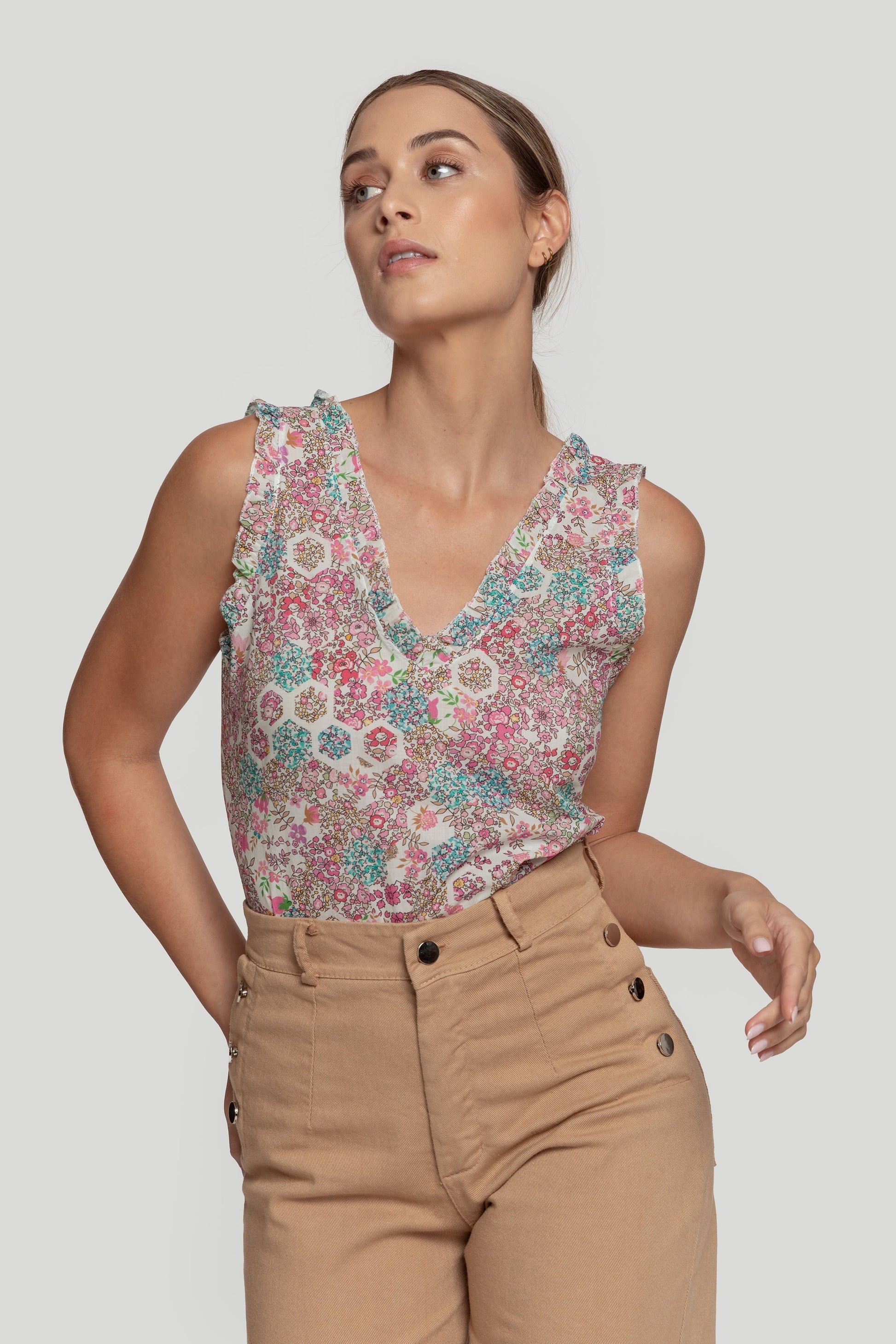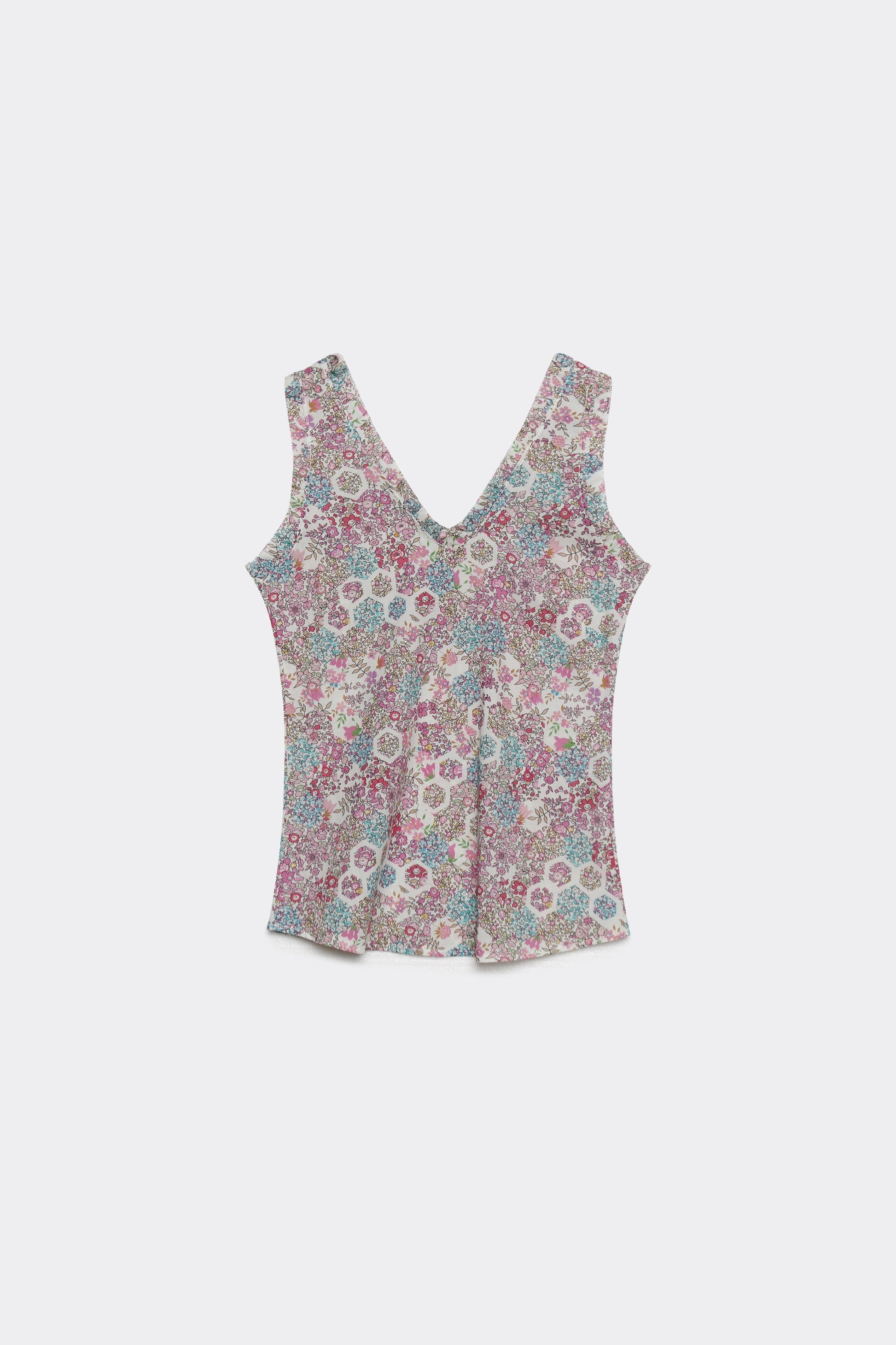 Tejido de acabado suave. Tejido de algodón. Estampado flores. Diseño recto. Cuello pico. Manga sisa. Bajo asimétrico. Talla modelo: S. Altura modelo 1,66 m. MODELO DE TALLAJE PEQUEÑO, ACONSEJAMOS UNA TALLA MÁS DE LO HABITUAL.