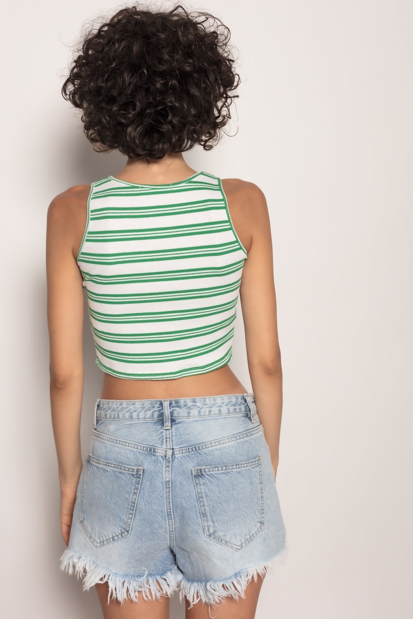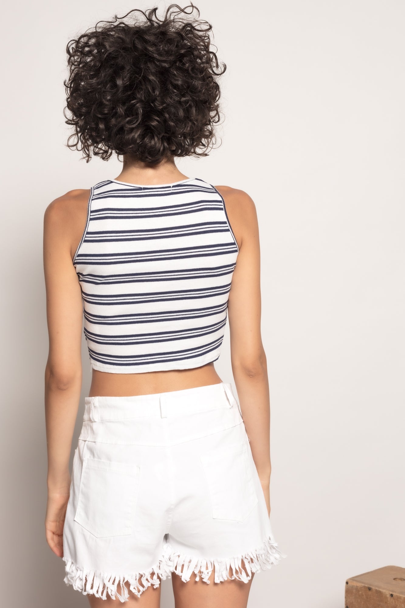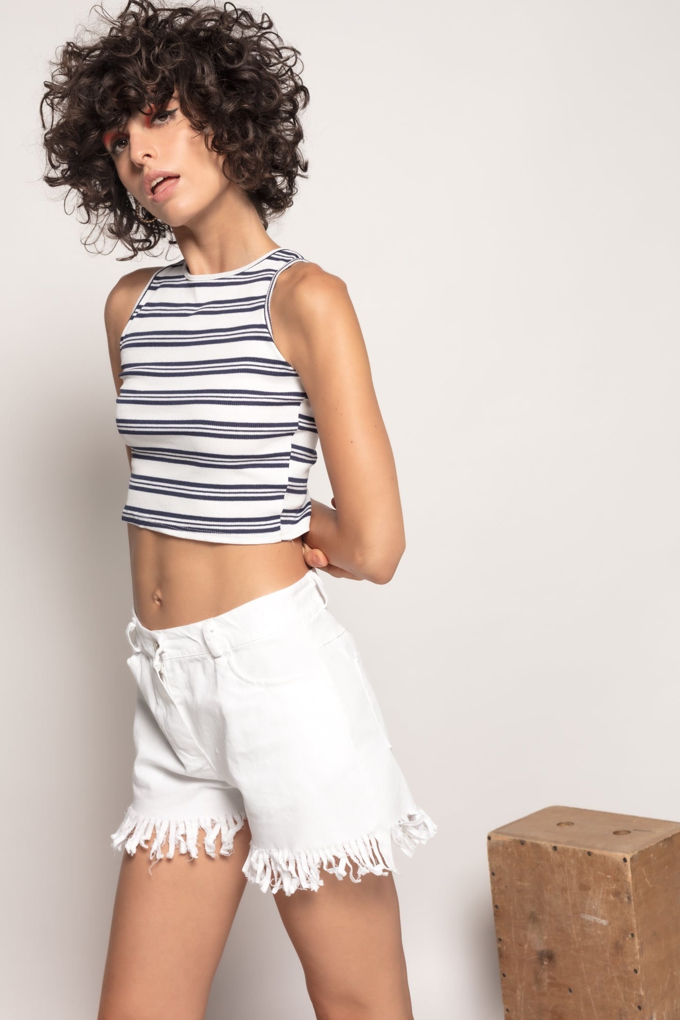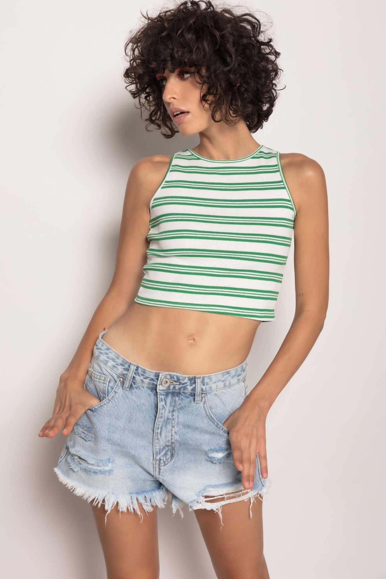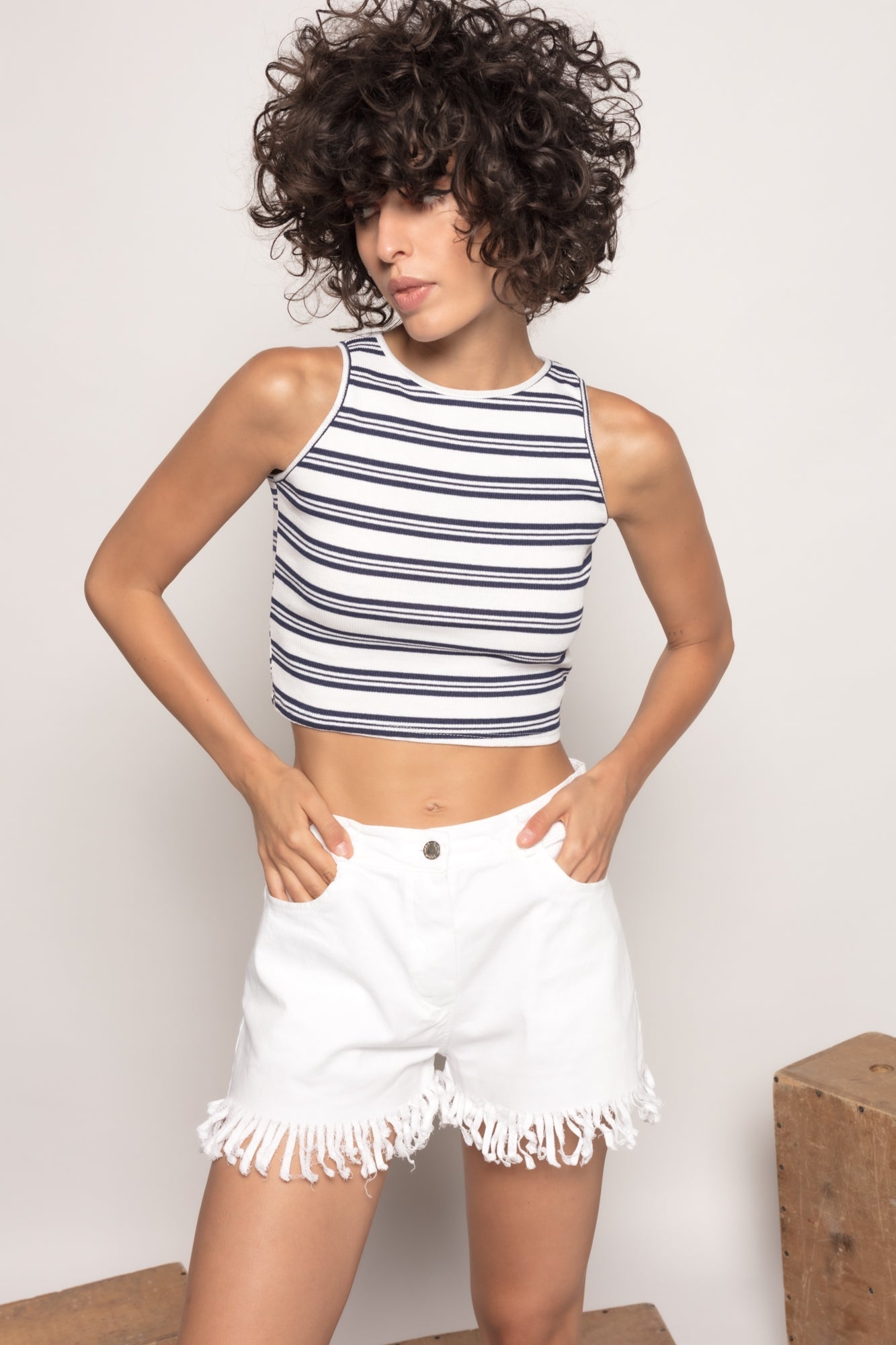 Top básico de canalé. Estampado de rayas. Cuello redondo y manga sisa. Ajustado. Talla modelo: S. Altura modelo: 1,75 m.
