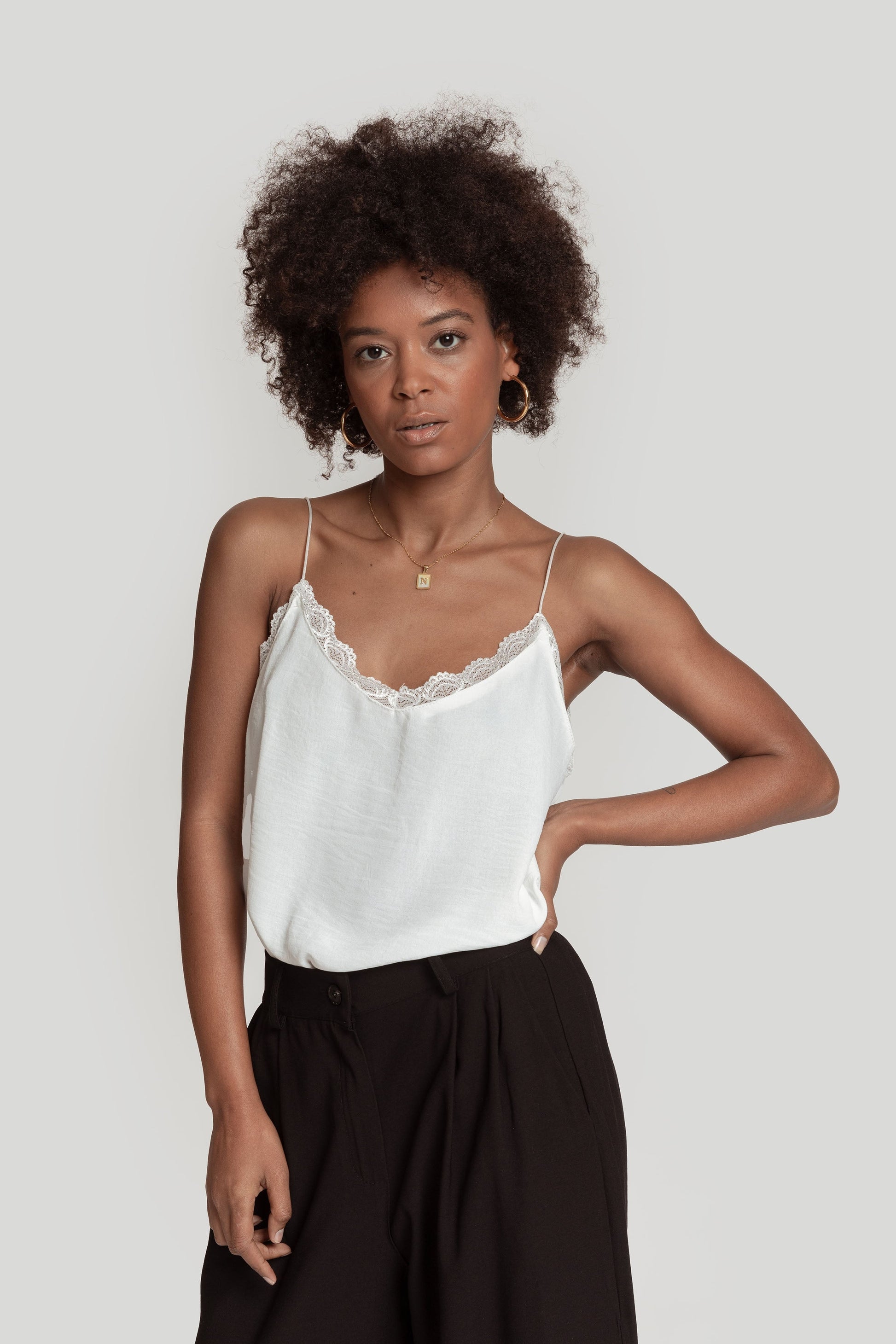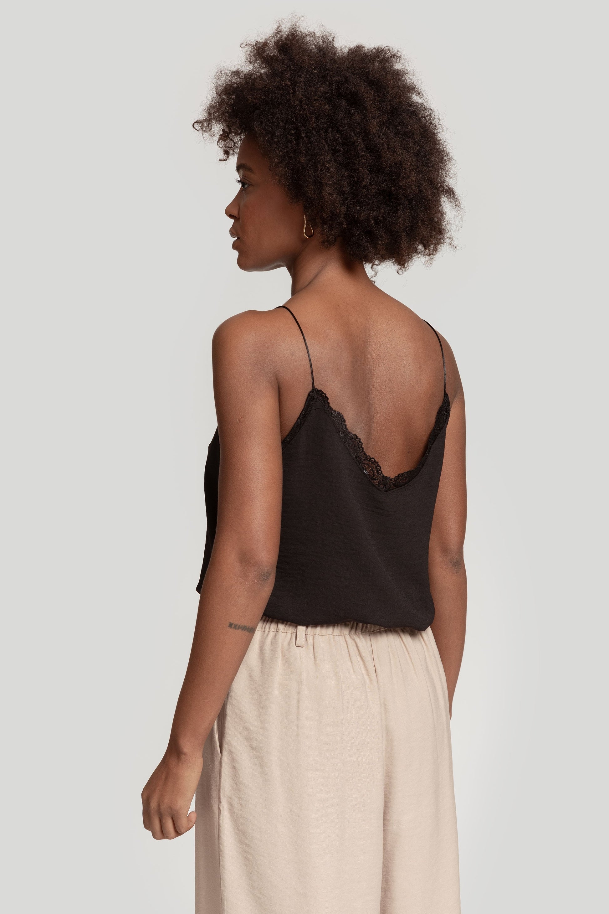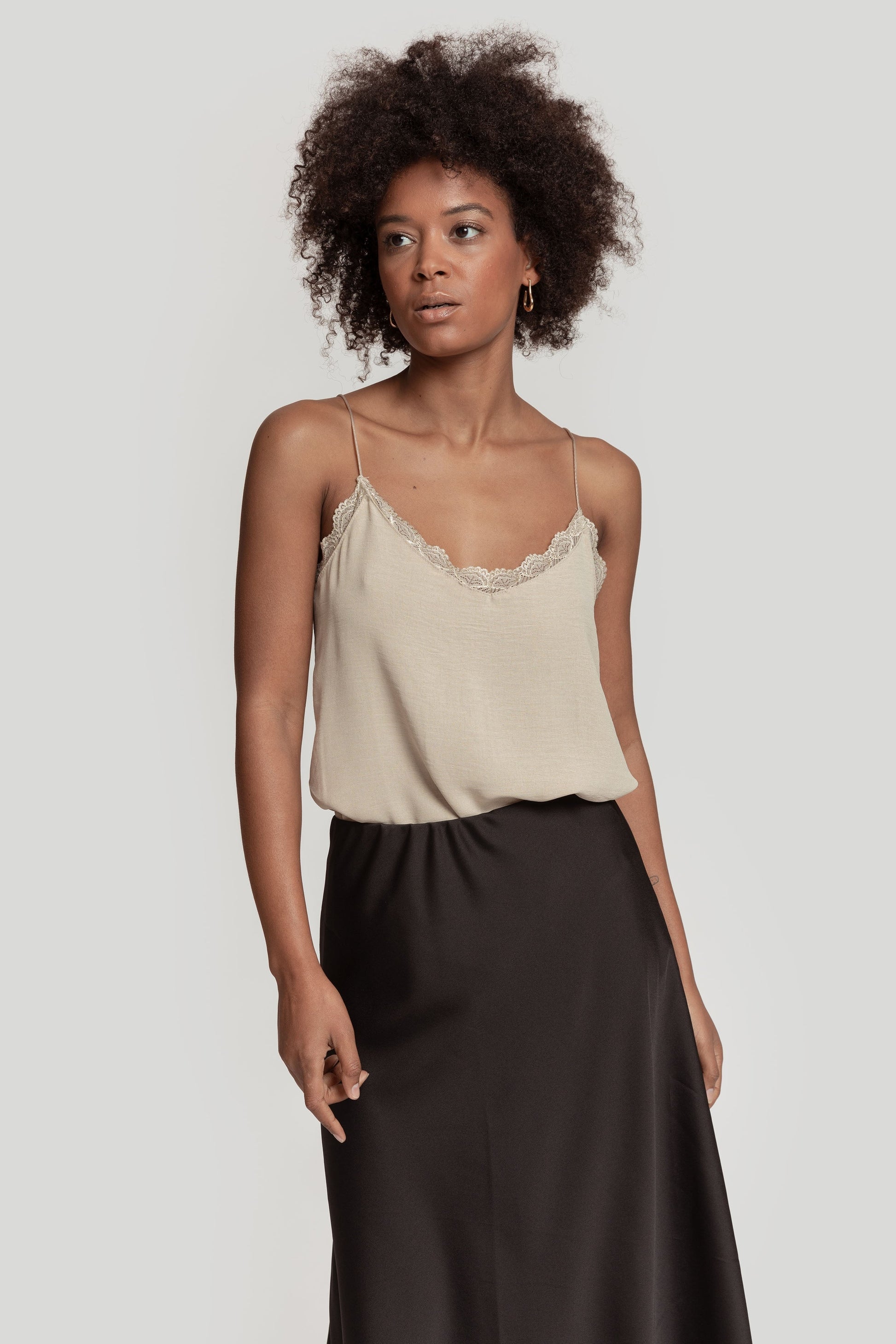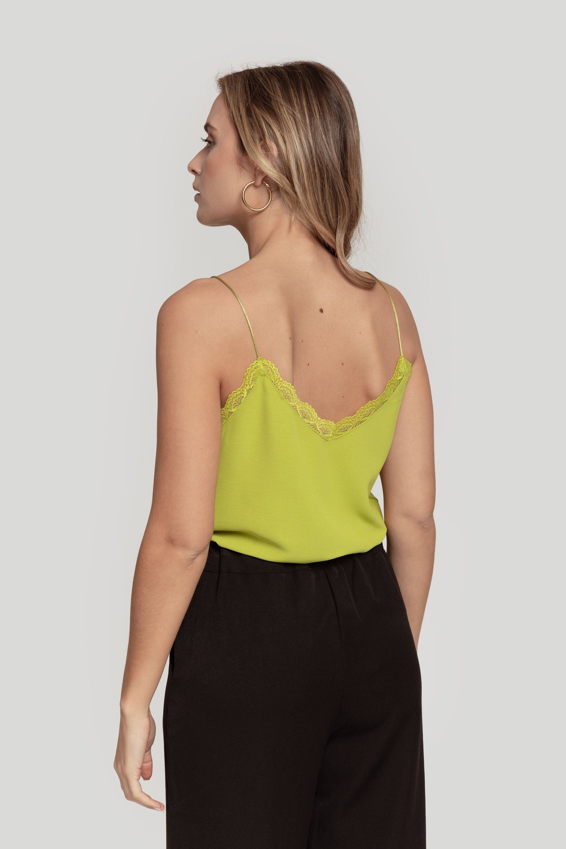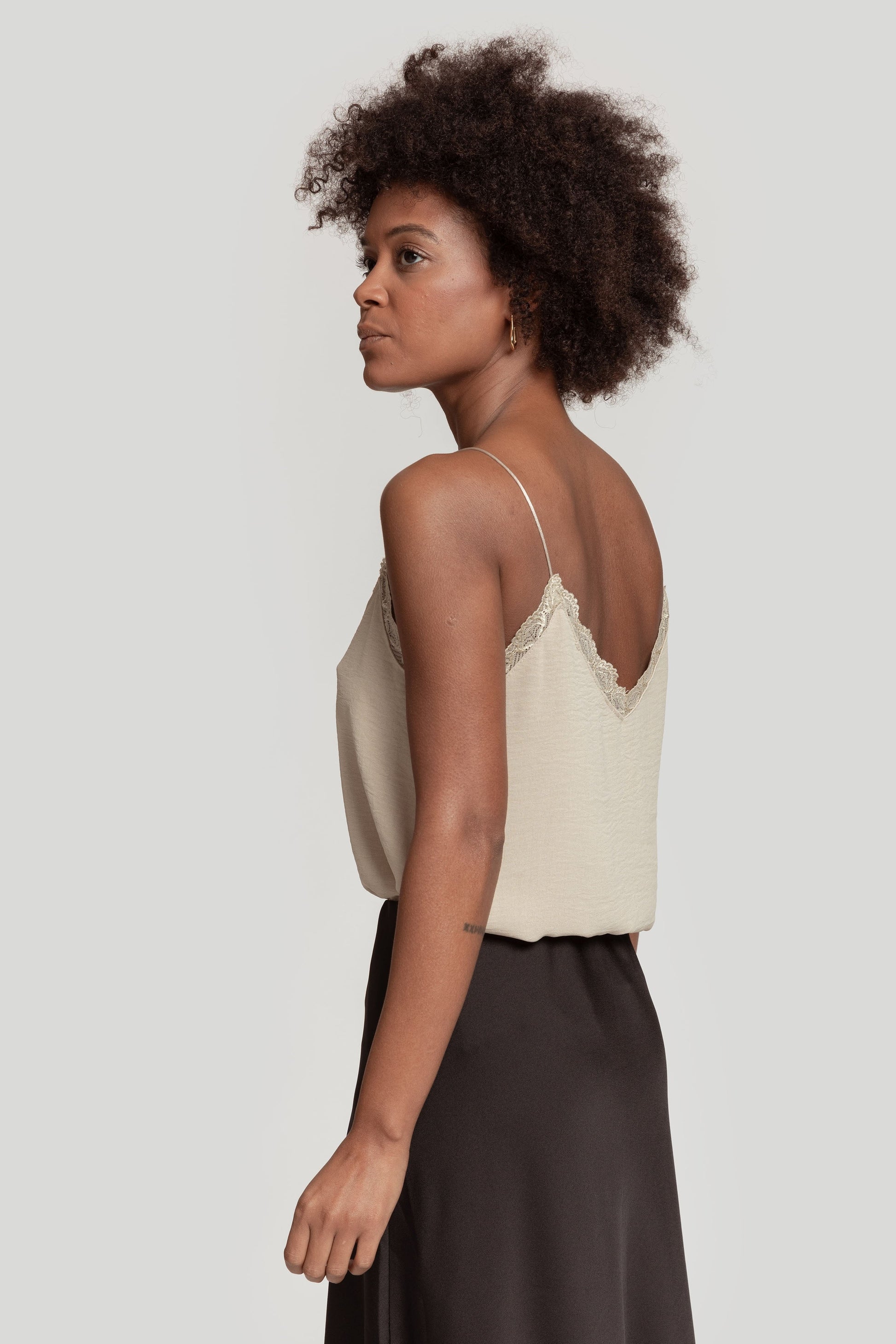 Tejido de gasa. Diseño fluido. Cuello amplio. Tirantes finos. Detalles encaje. Talla modelo: S. Altura modelo: 1,65 m.