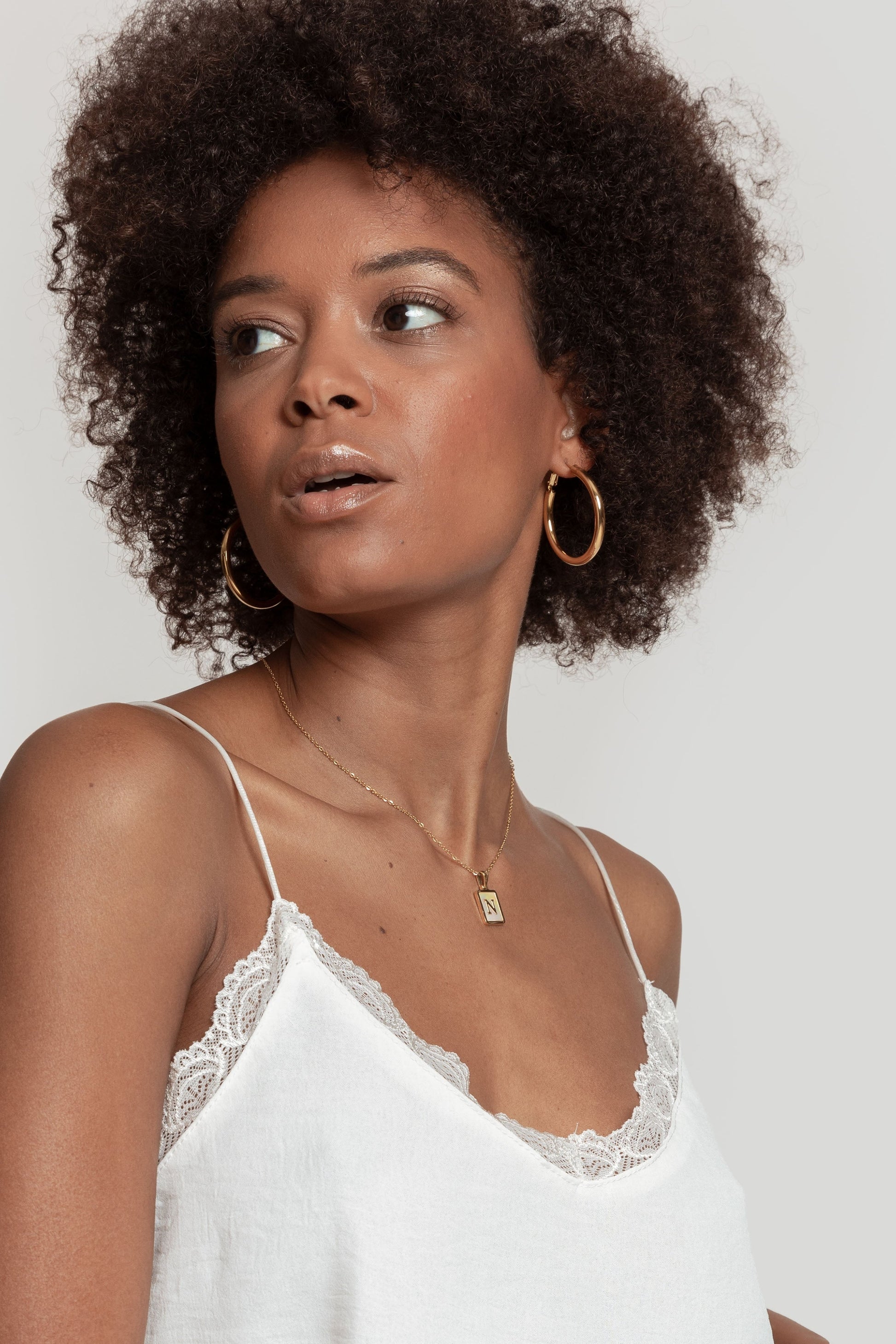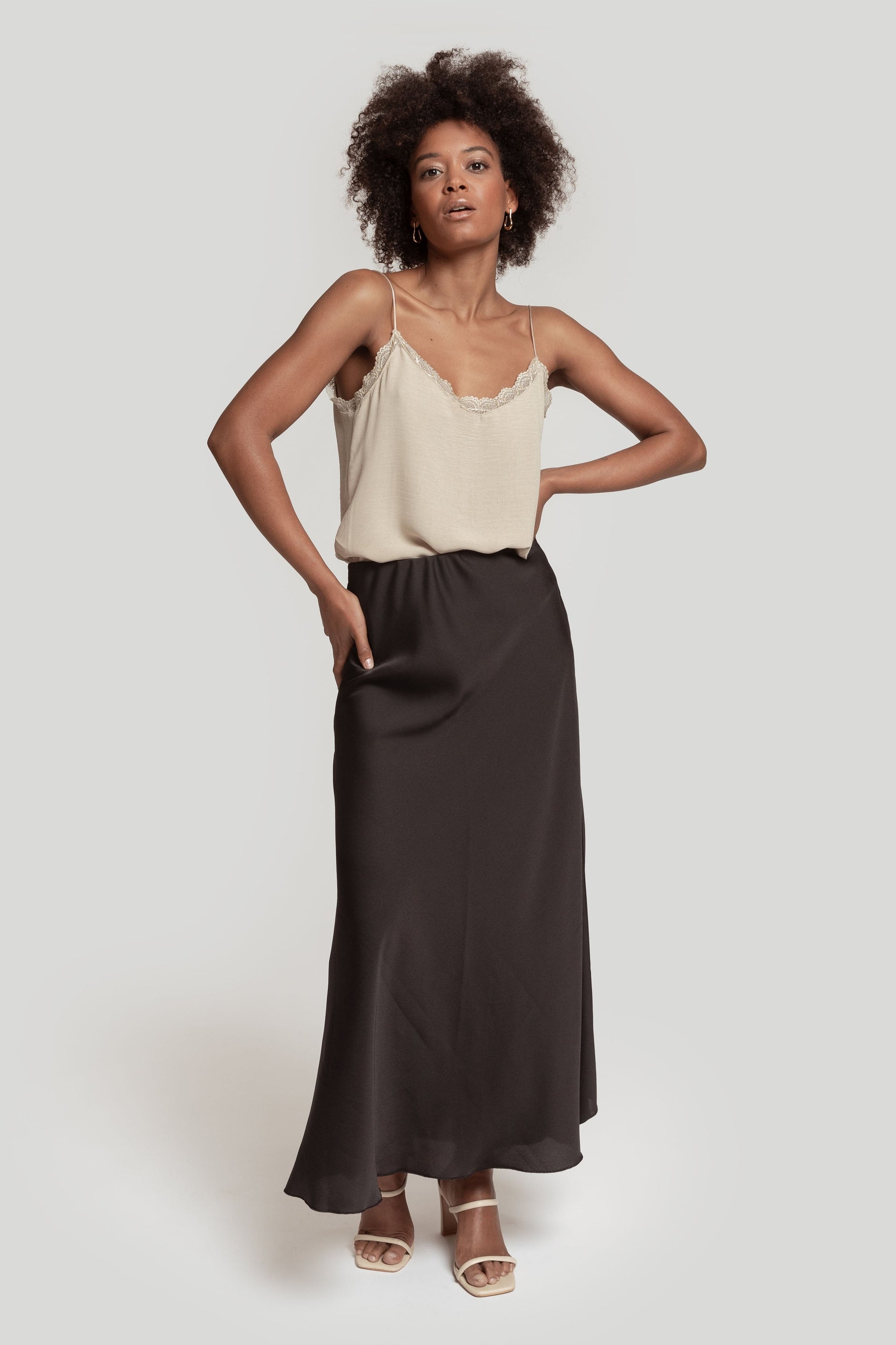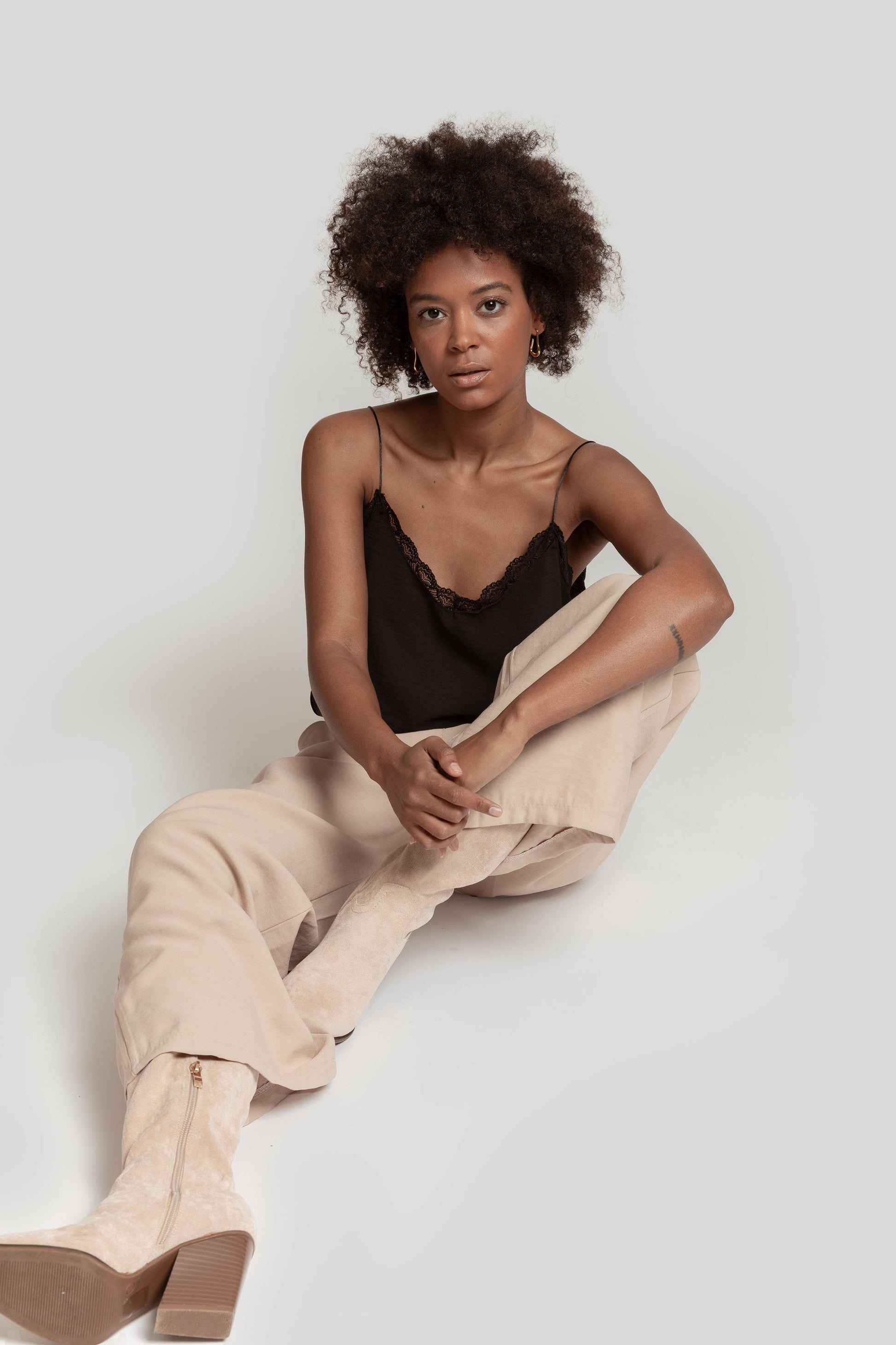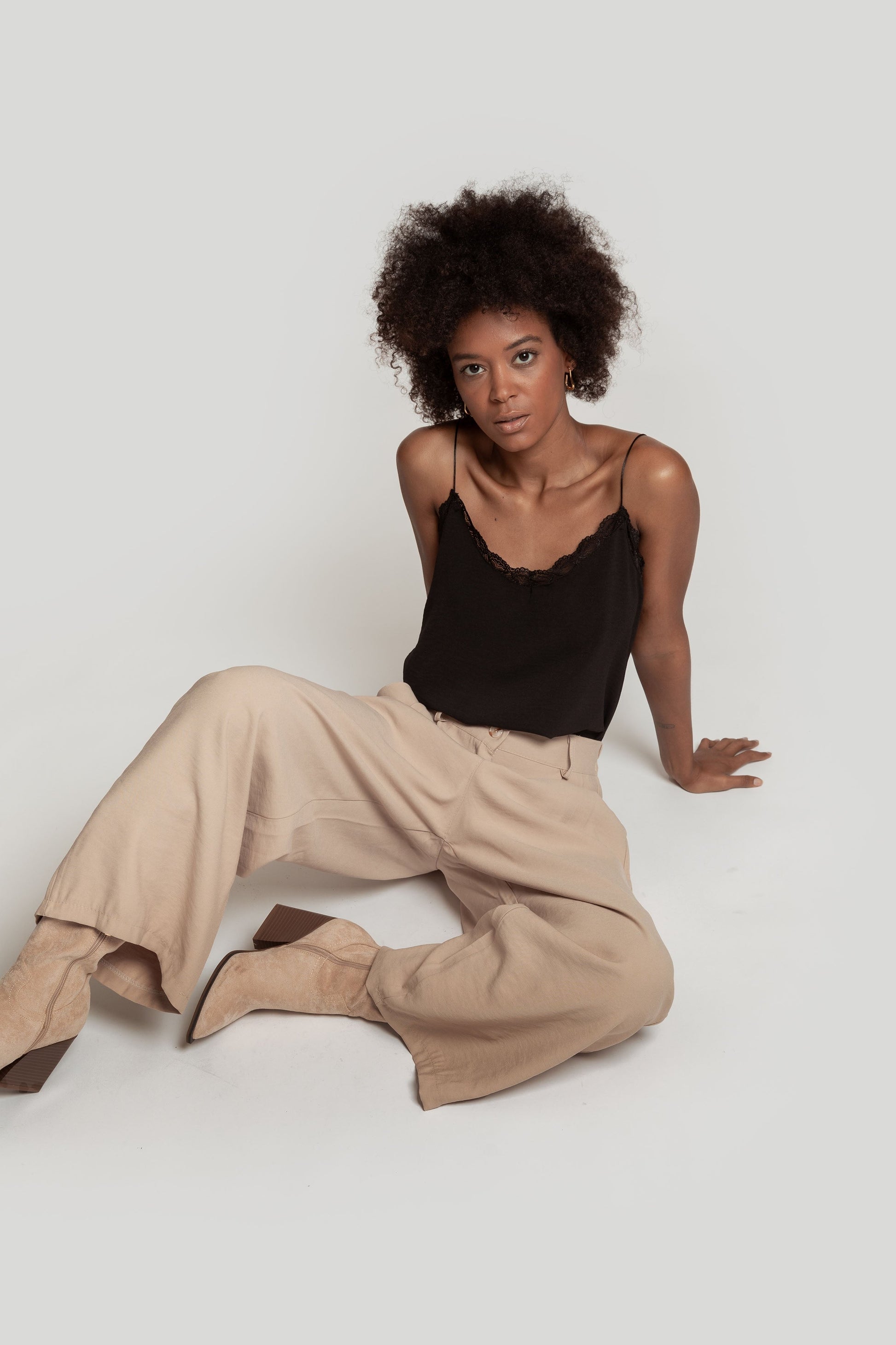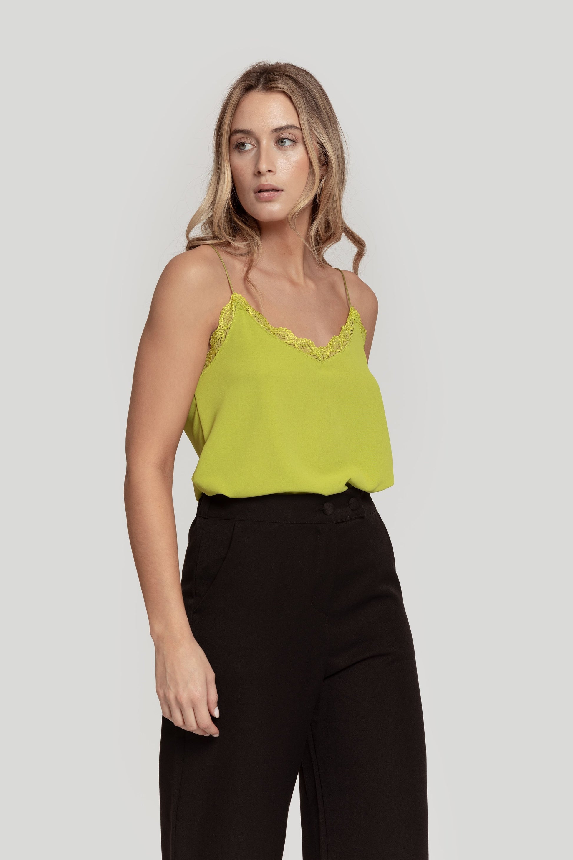 Tejido de gasa. Diseño fluido. Cuello amplio. Tirantes finos. Detalles encaje. Talla modelo: S. Altura modelo: 1,65 m.