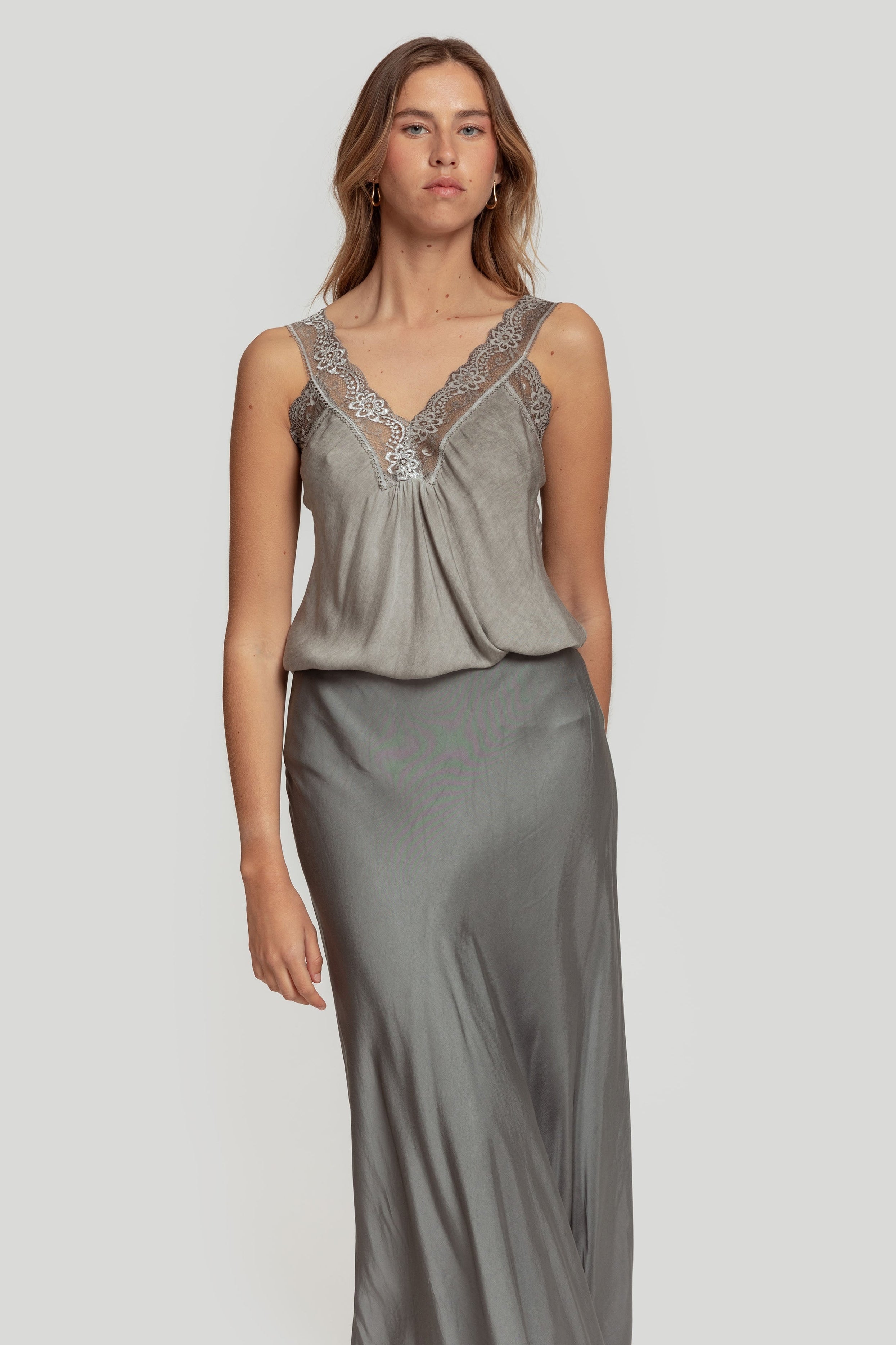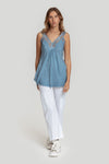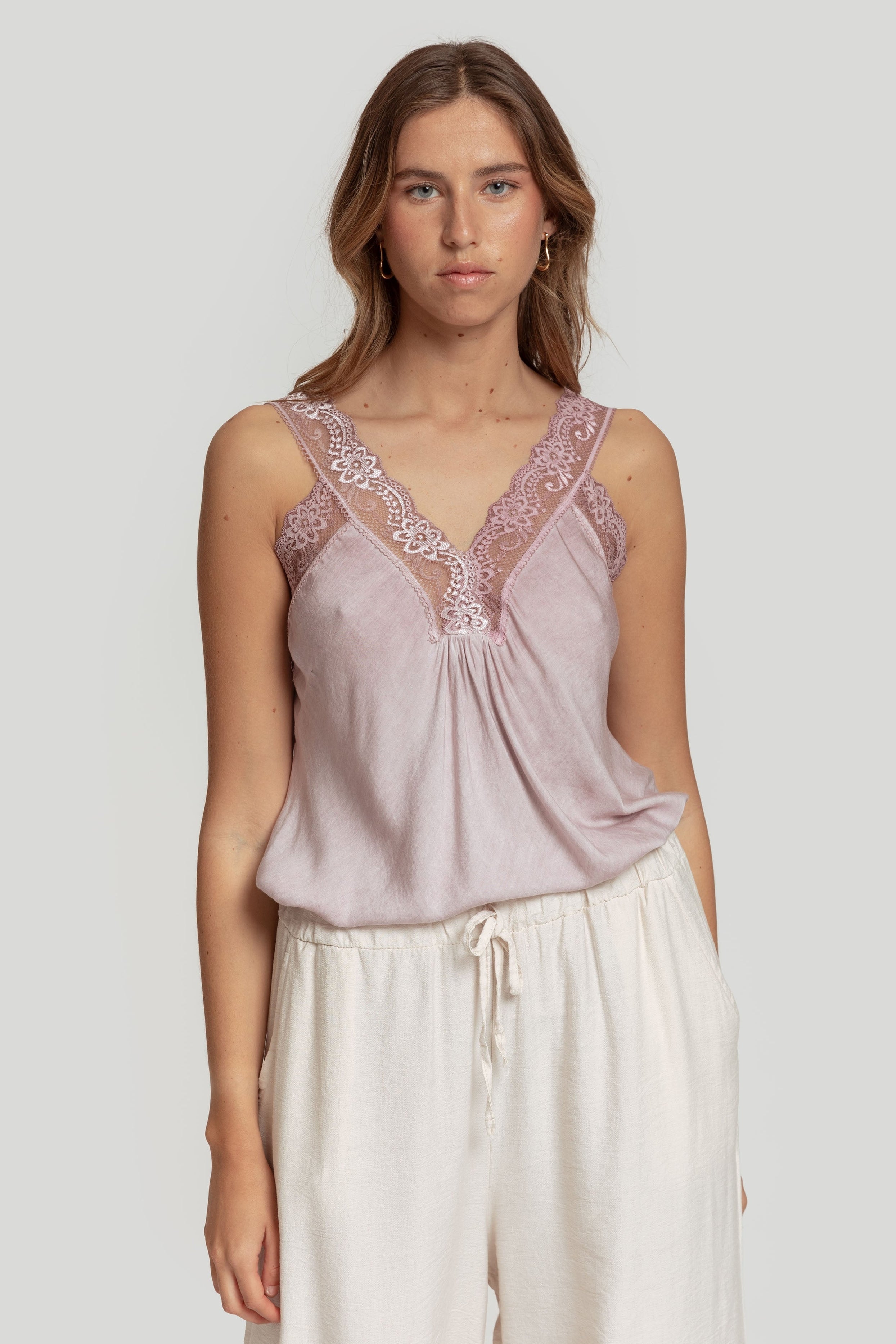 Tejido ligero. Tejido gastado. Diseño recto. Manga tirantes. Cuello y manga de encaje. Detalle costuras brillantes. Talla modelo: S. Altura modelo: 1,66 m.