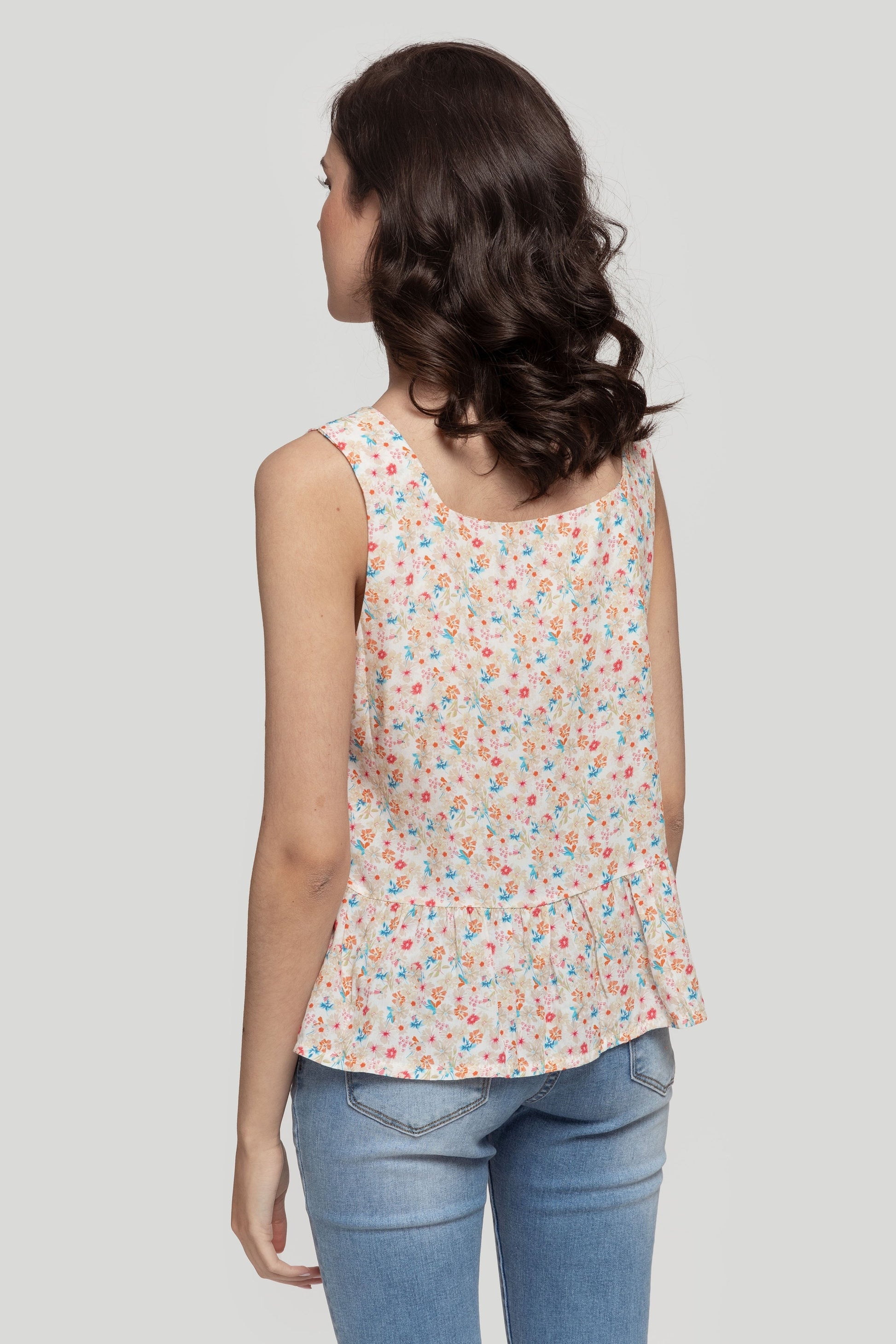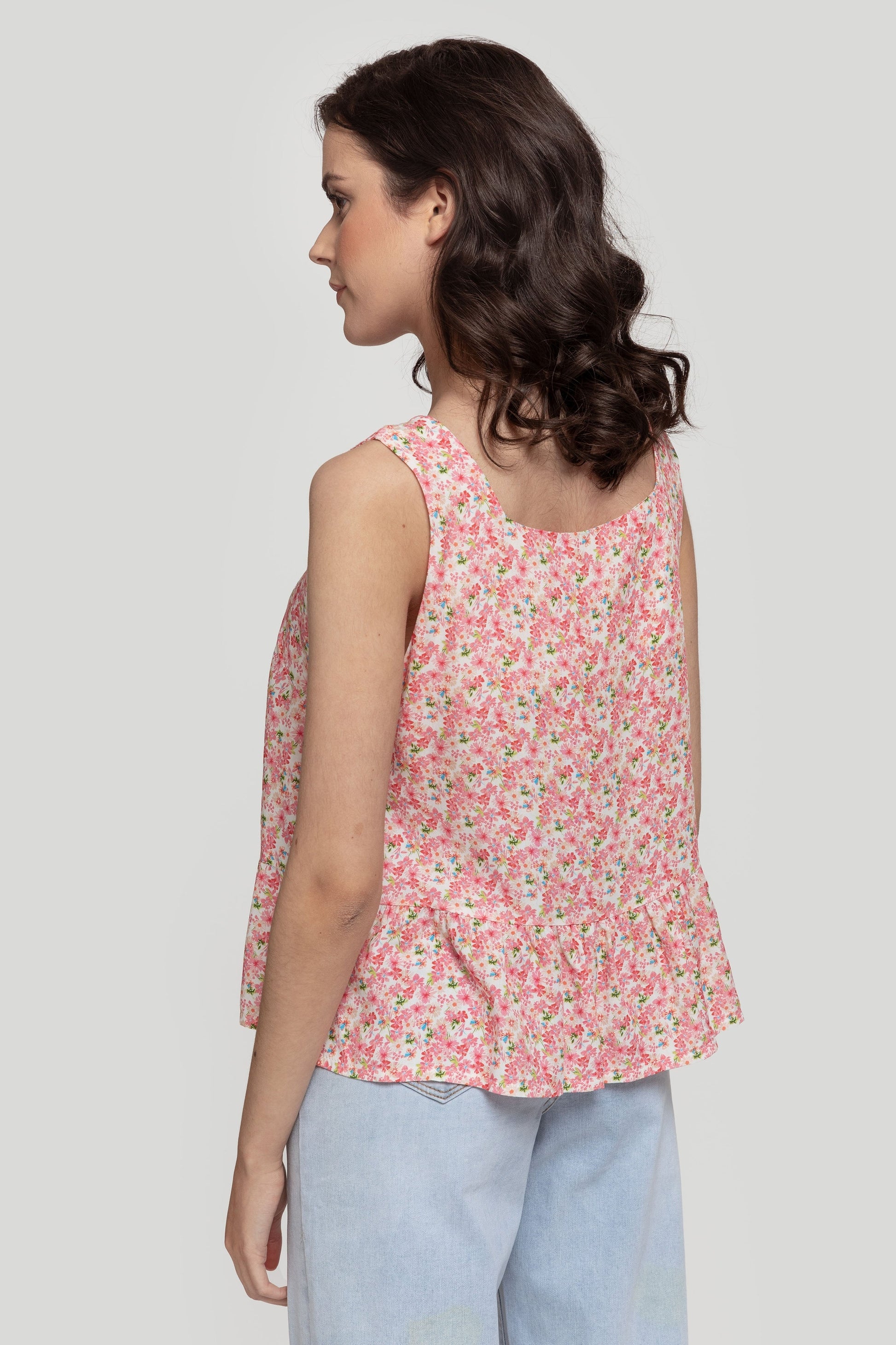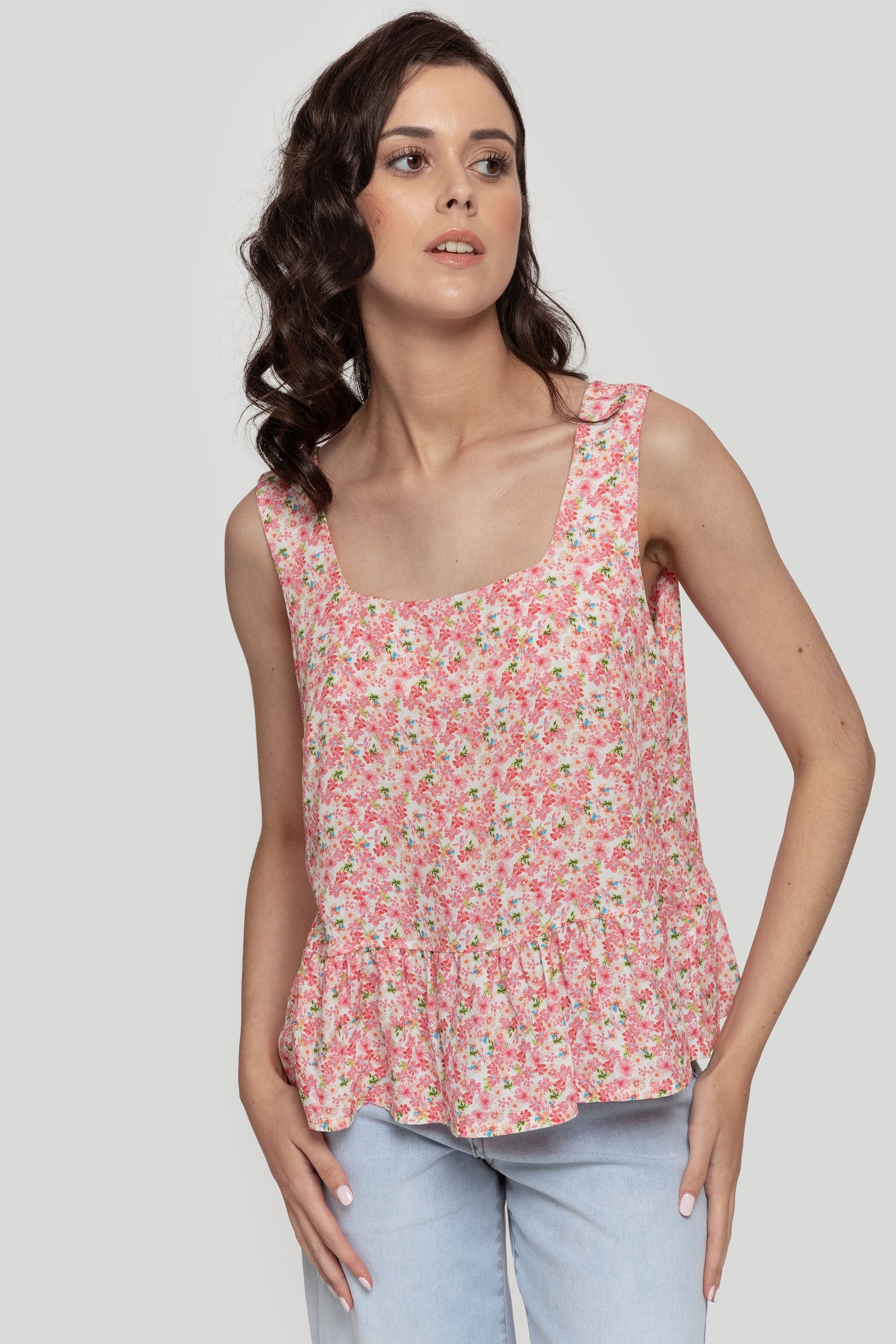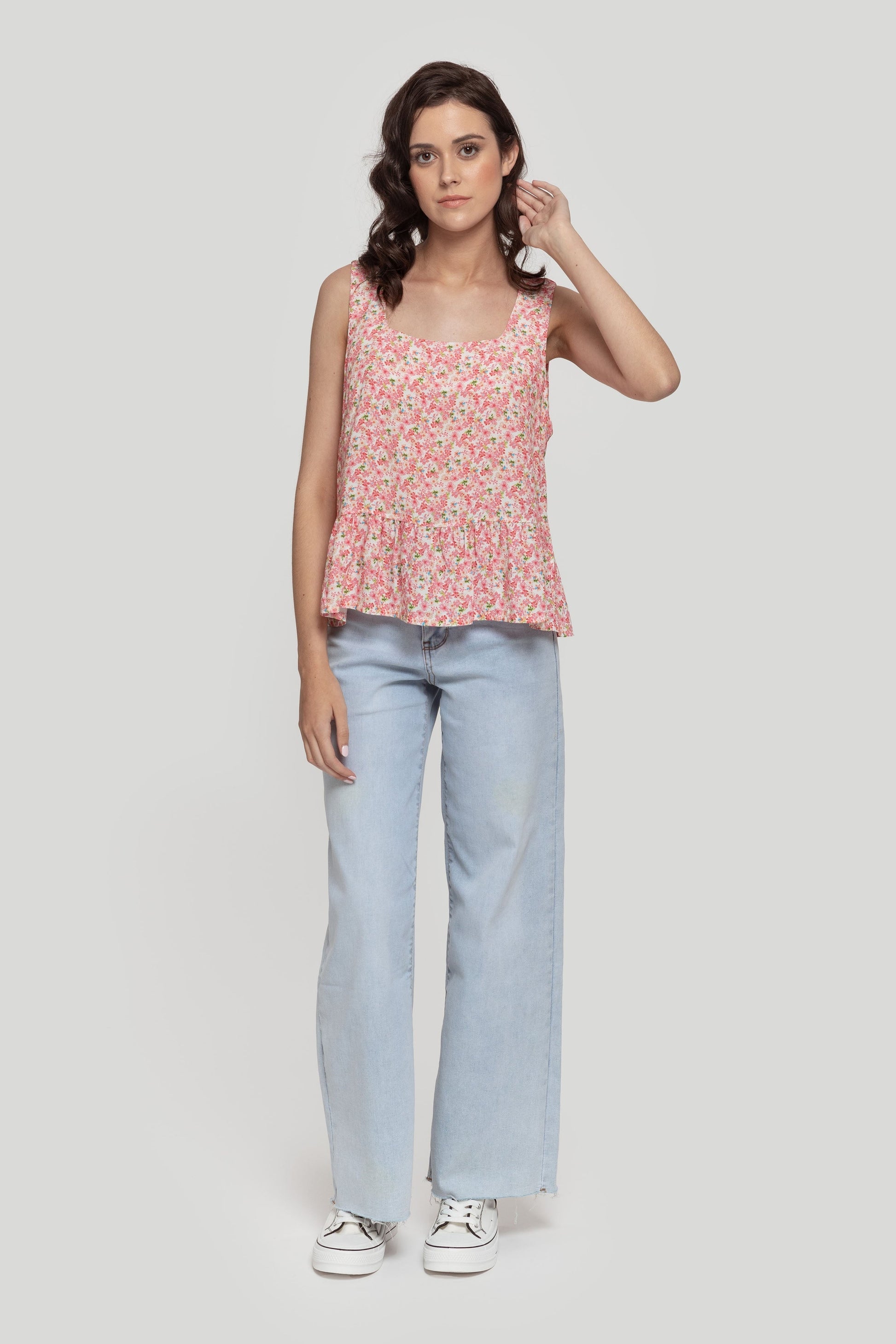 Top en tejido ligero. Diseño recto. Diseño estampado. Cuello a la caja. Manga tirantes anchos. Bajo volante.Talla modelo: S. Altura modelo 1,66 m.