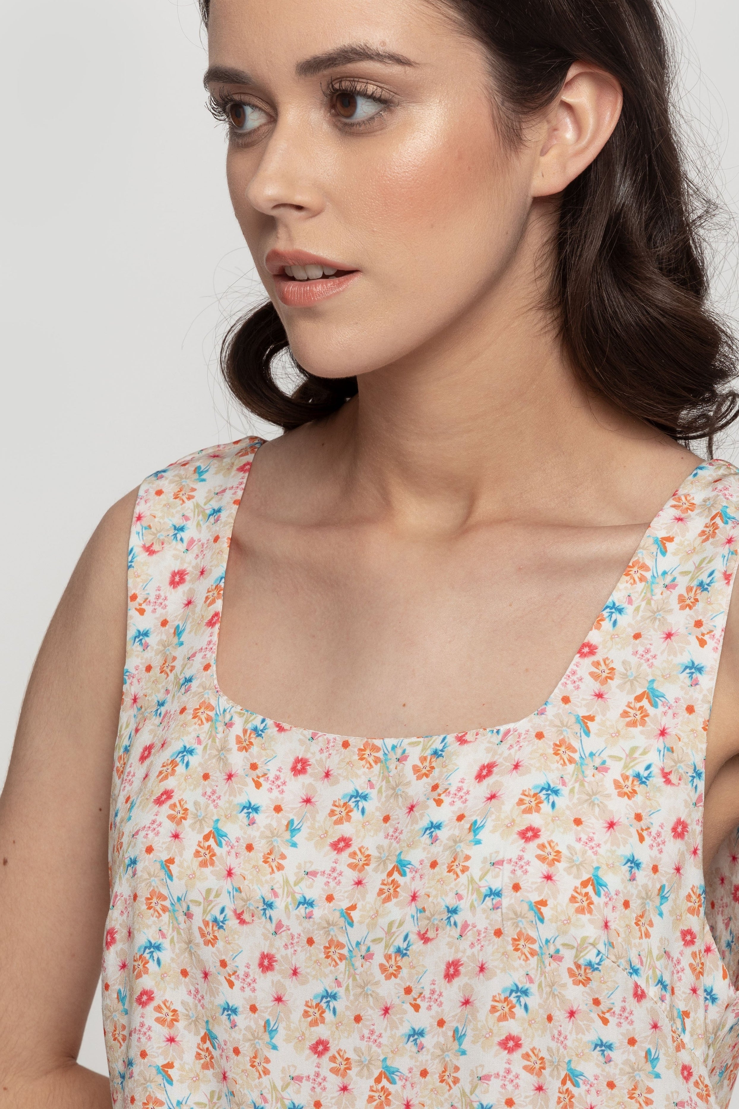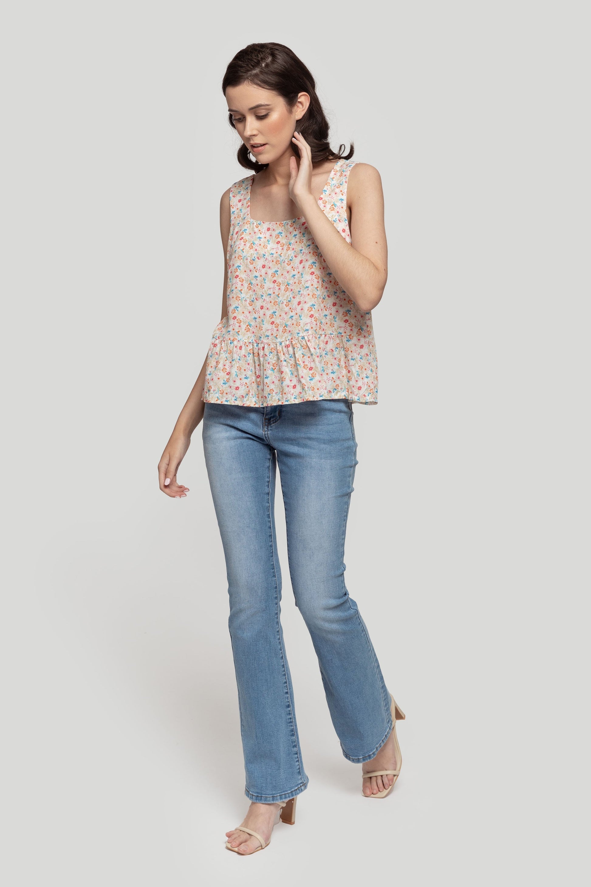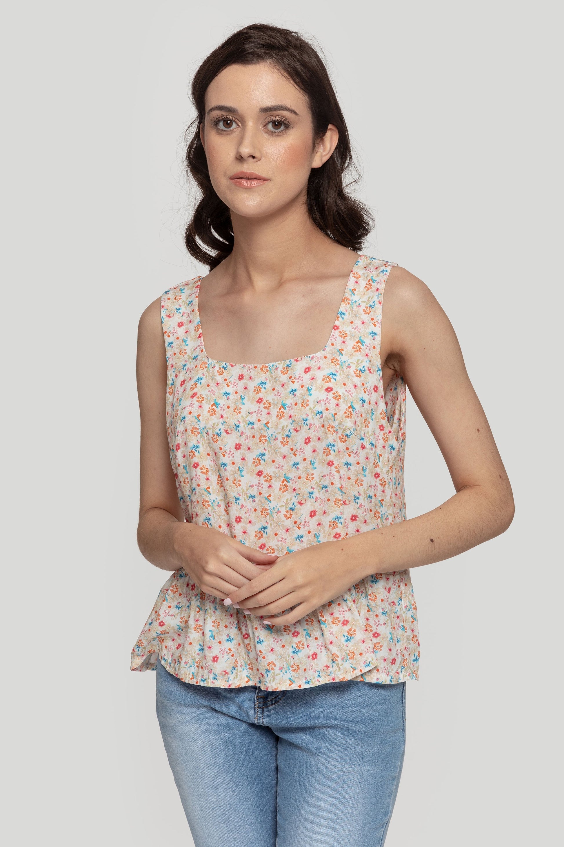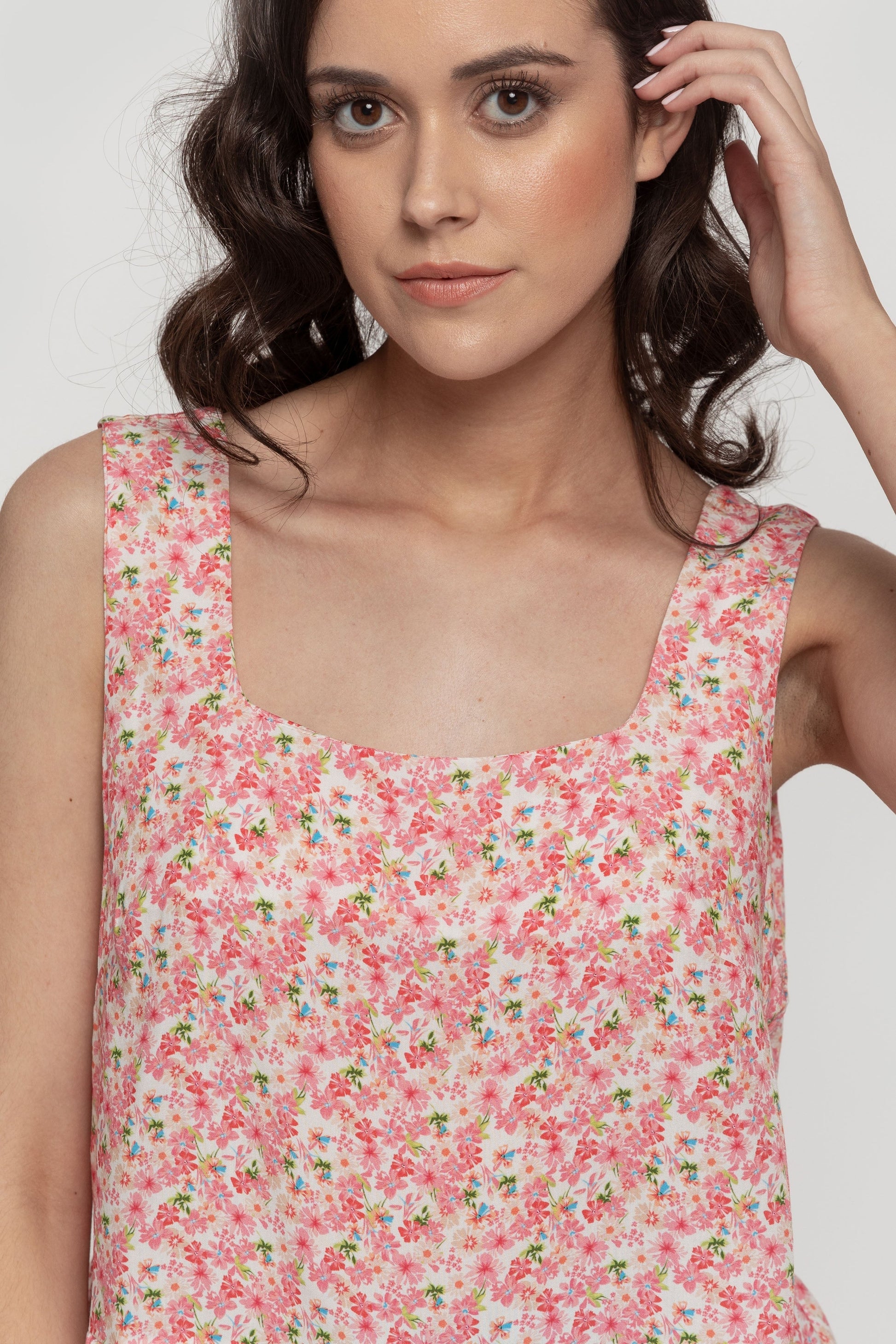 Top en tejido ligero. Diseño recto. Diseño estampado. Cuello a la caja. Manga tirantes anchos. Bajo volante.Talla modelo: S. Altura modelo 1,66 m.