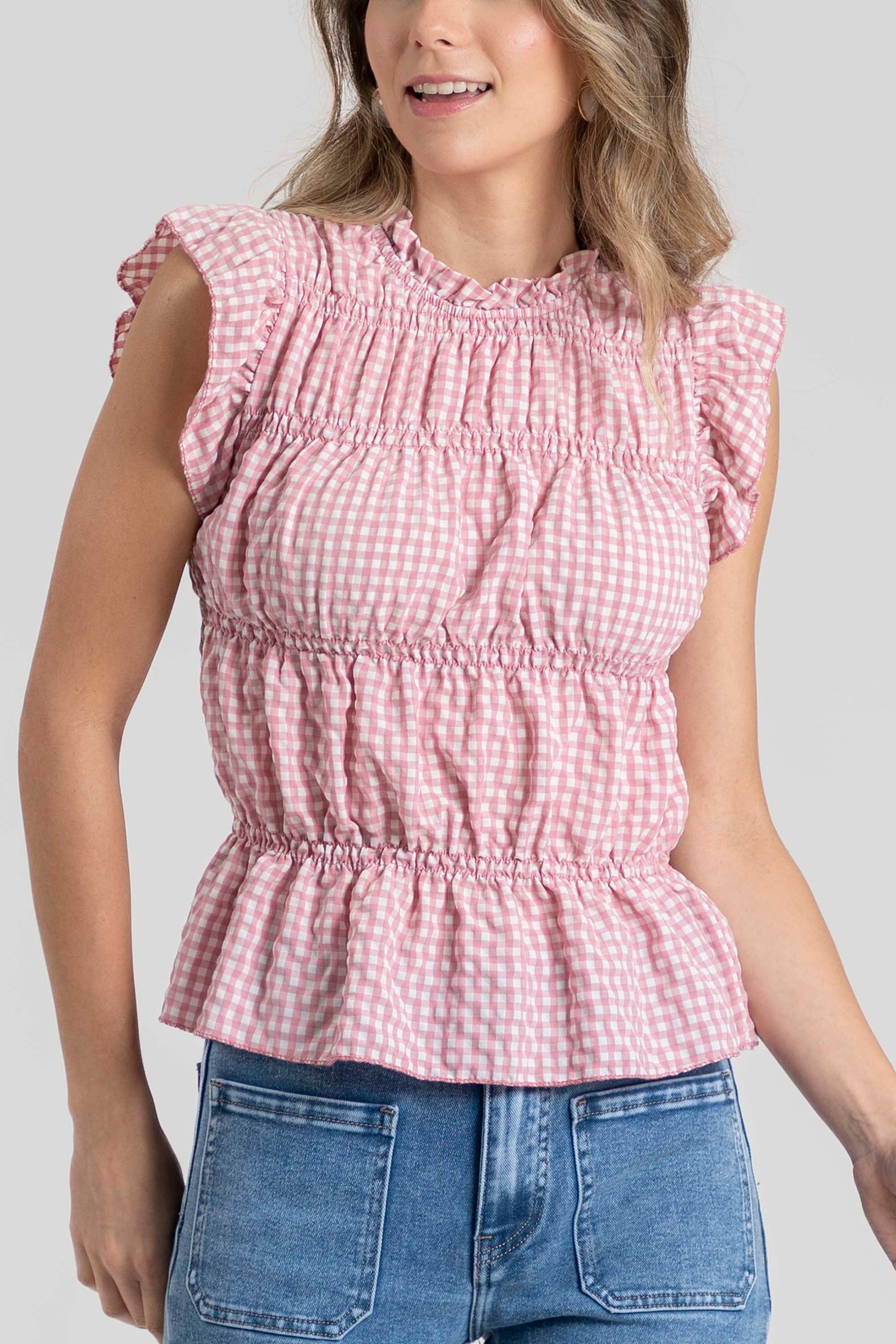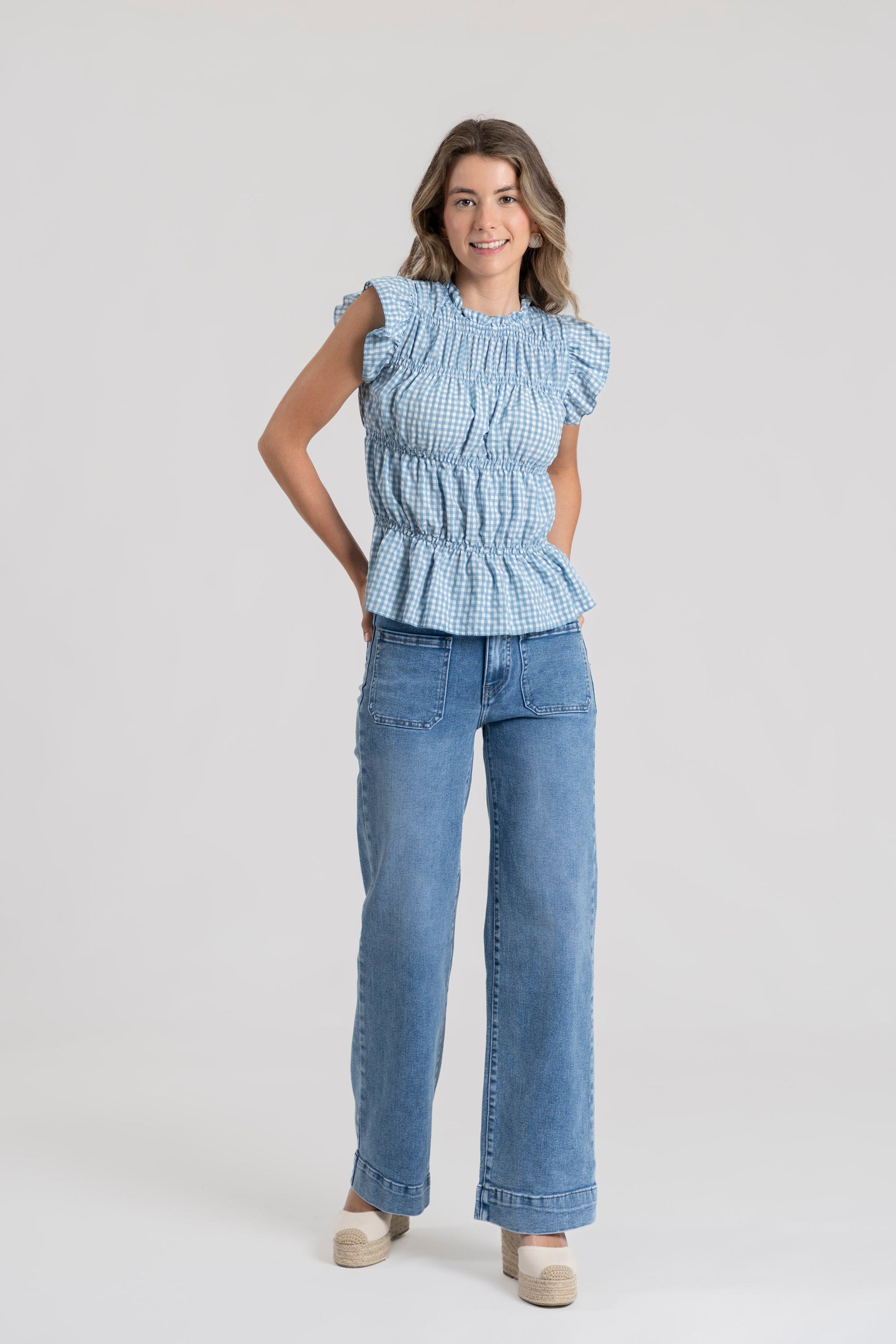 Tejido fluido. Diseño nido. Diseño estampado vichy. Cuello redondo. Manga sisa. Acabados volantes. Talla modelo: S.