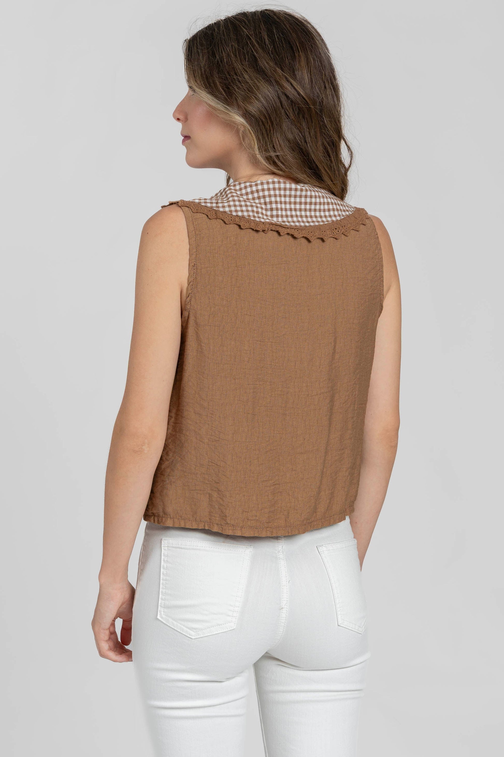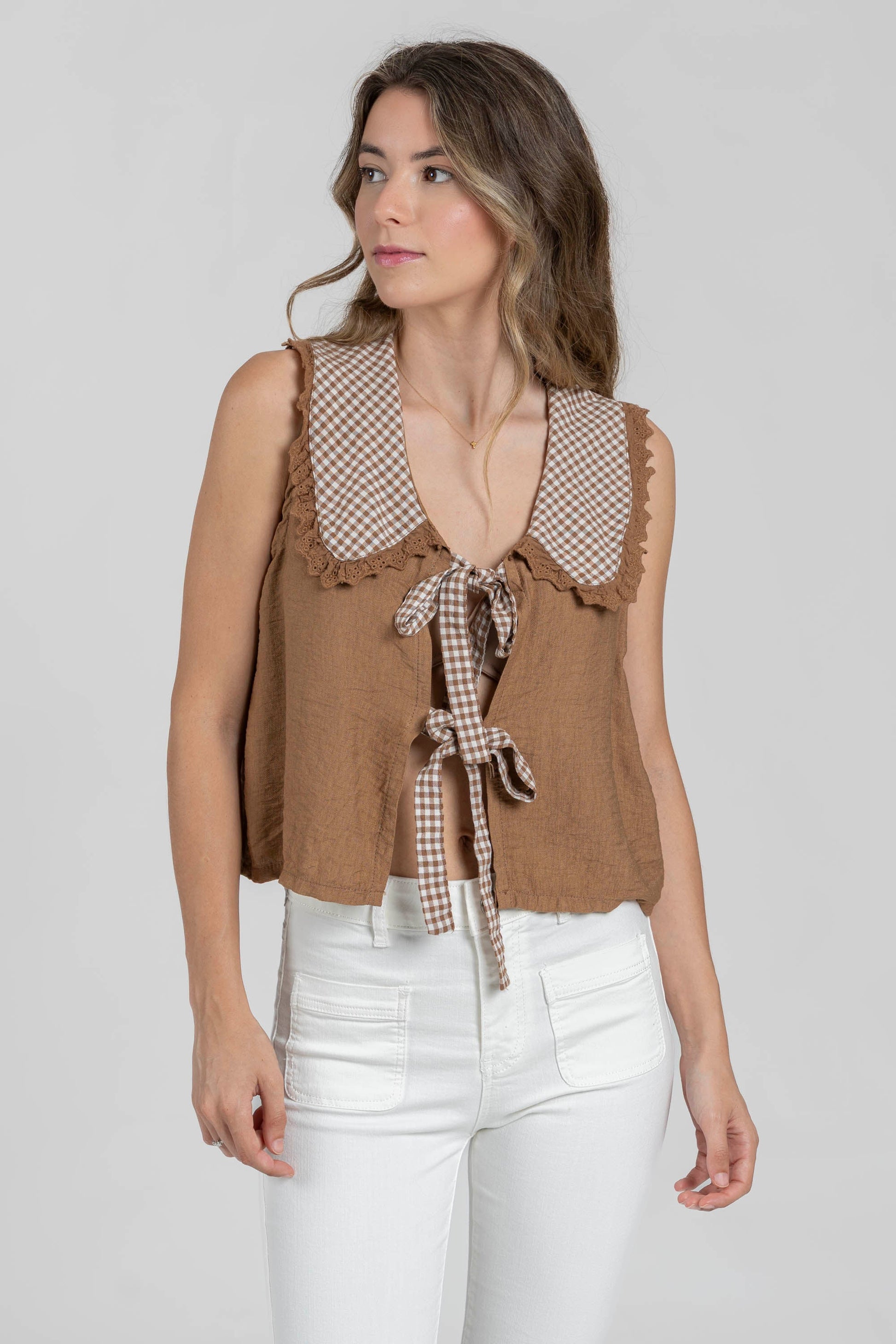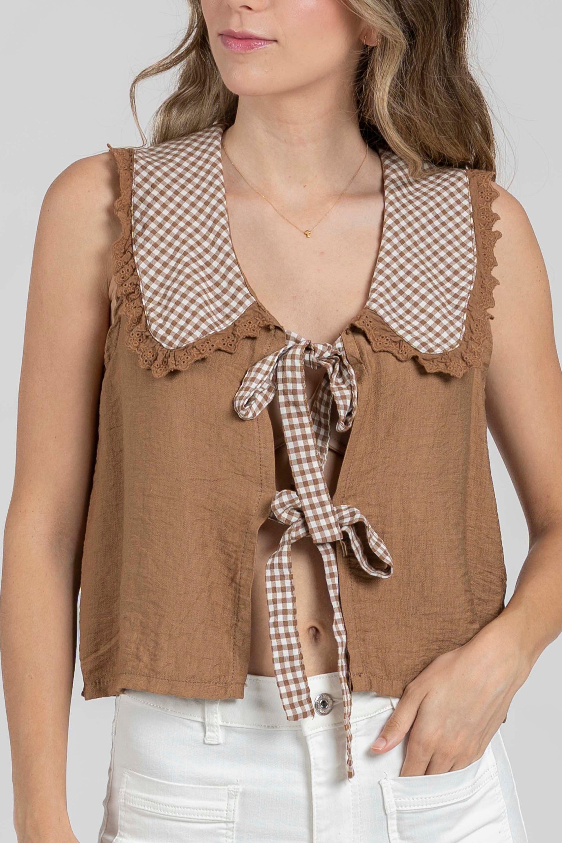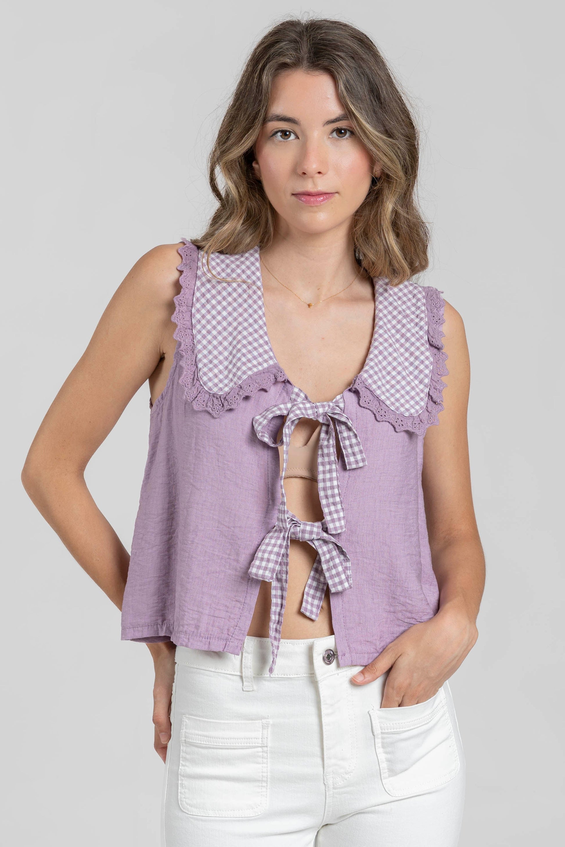 Tejido fluido. Cuello bobo. Manga sisa. Cirre de lazos. Talla S. Altura modelo: 1.70 m