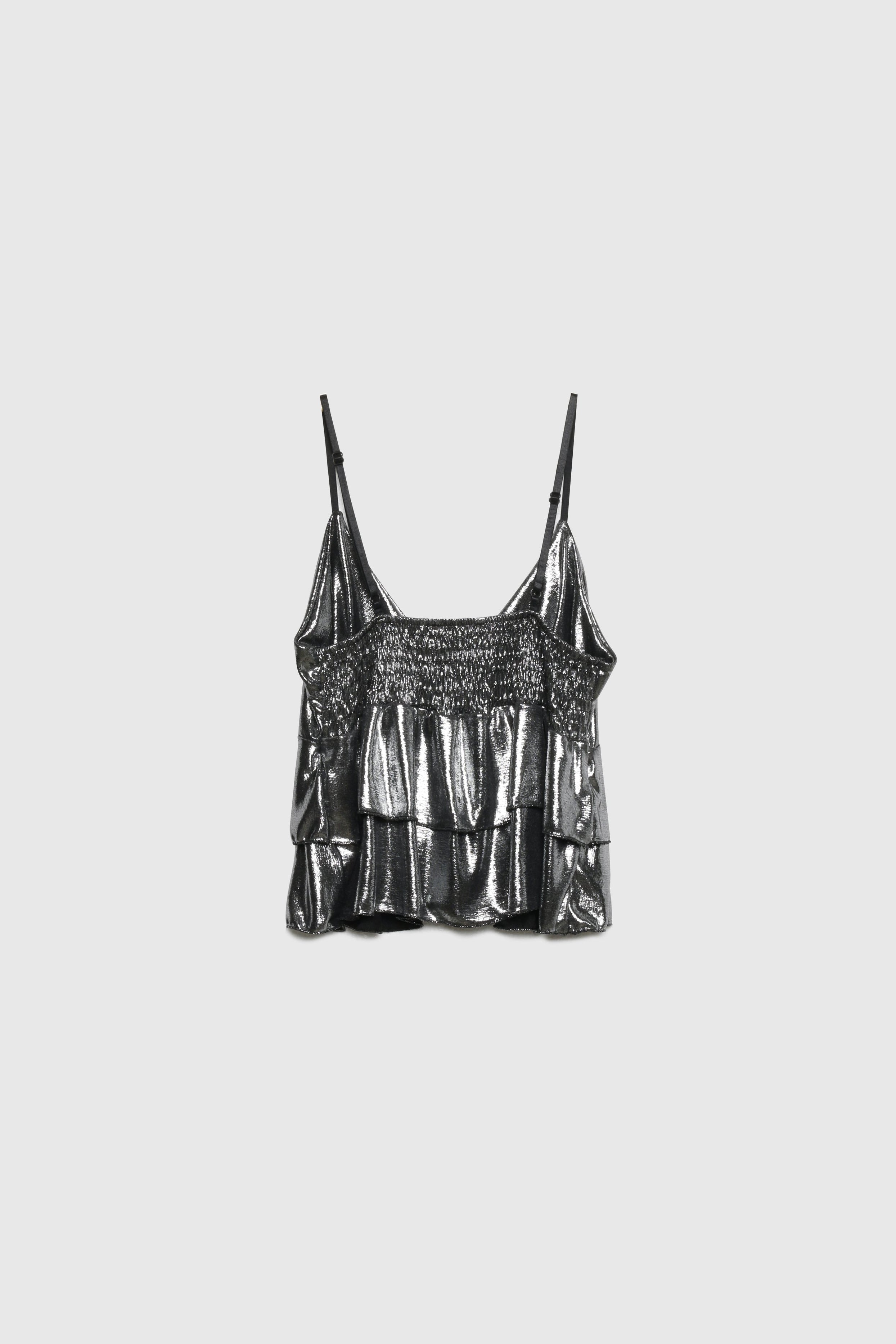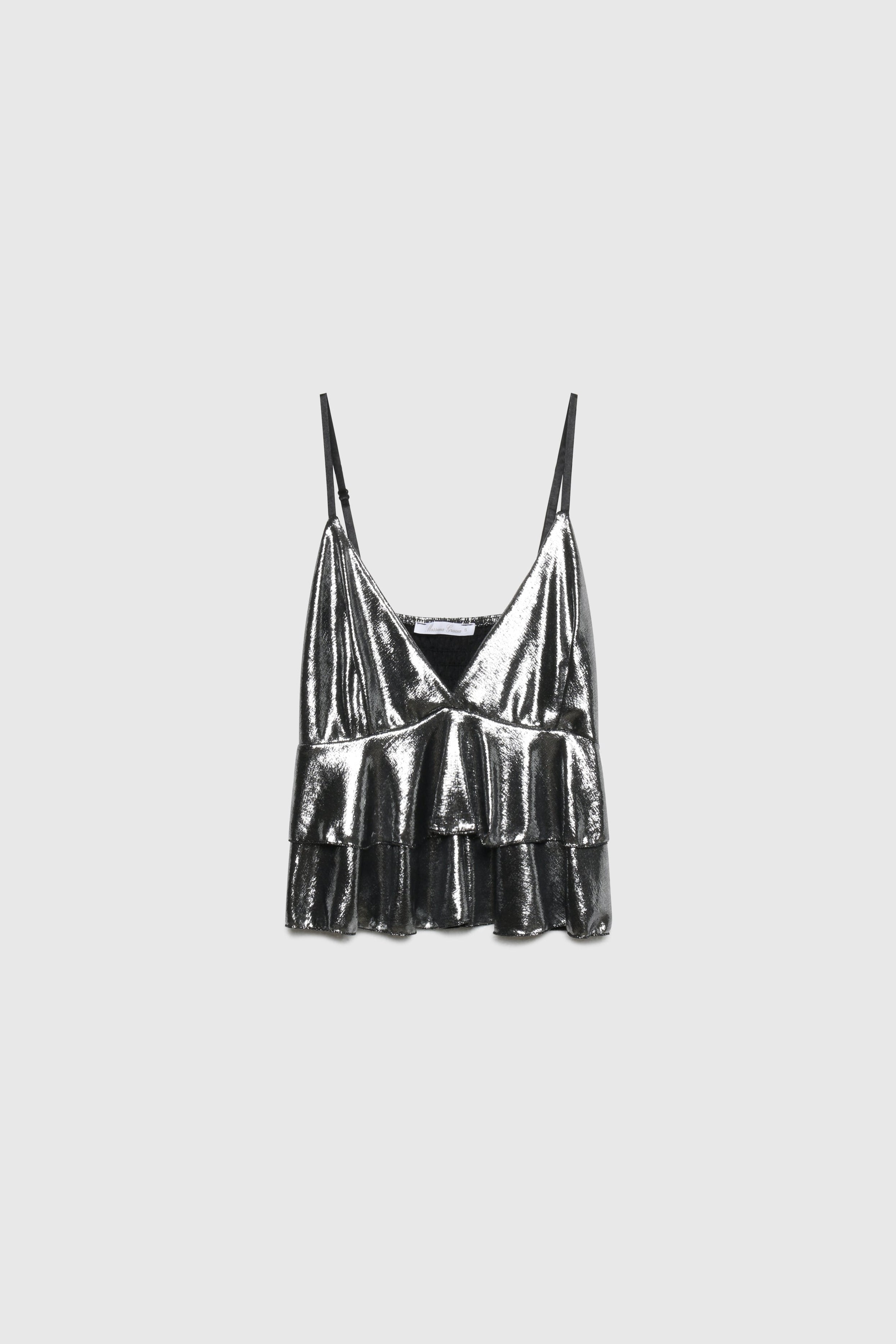 Tejido brillo. Diseño volante. Diseño crop . Escote pico. Tirante fino ajustable. Talla modelo: S. Altura modelo 1,70 m.