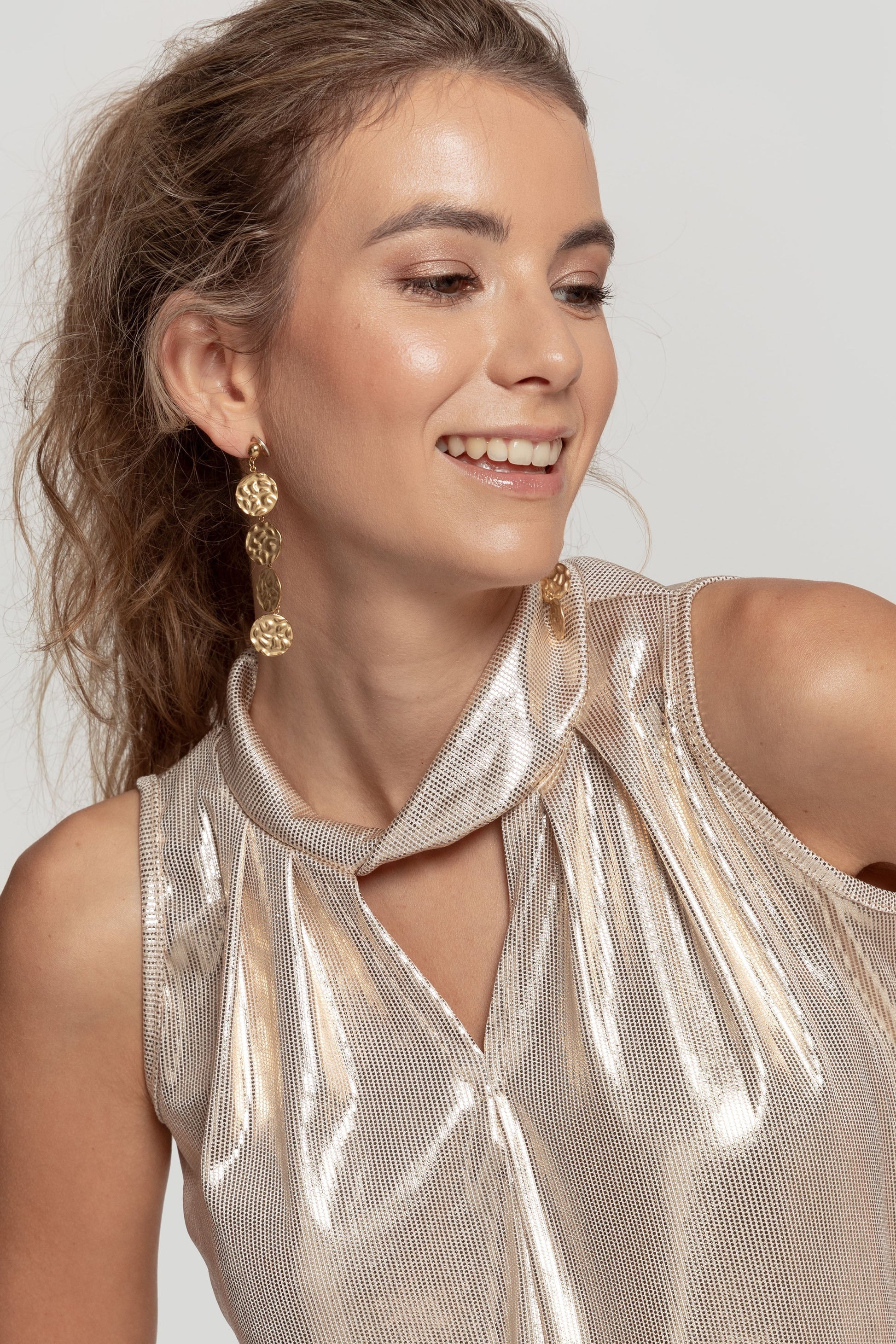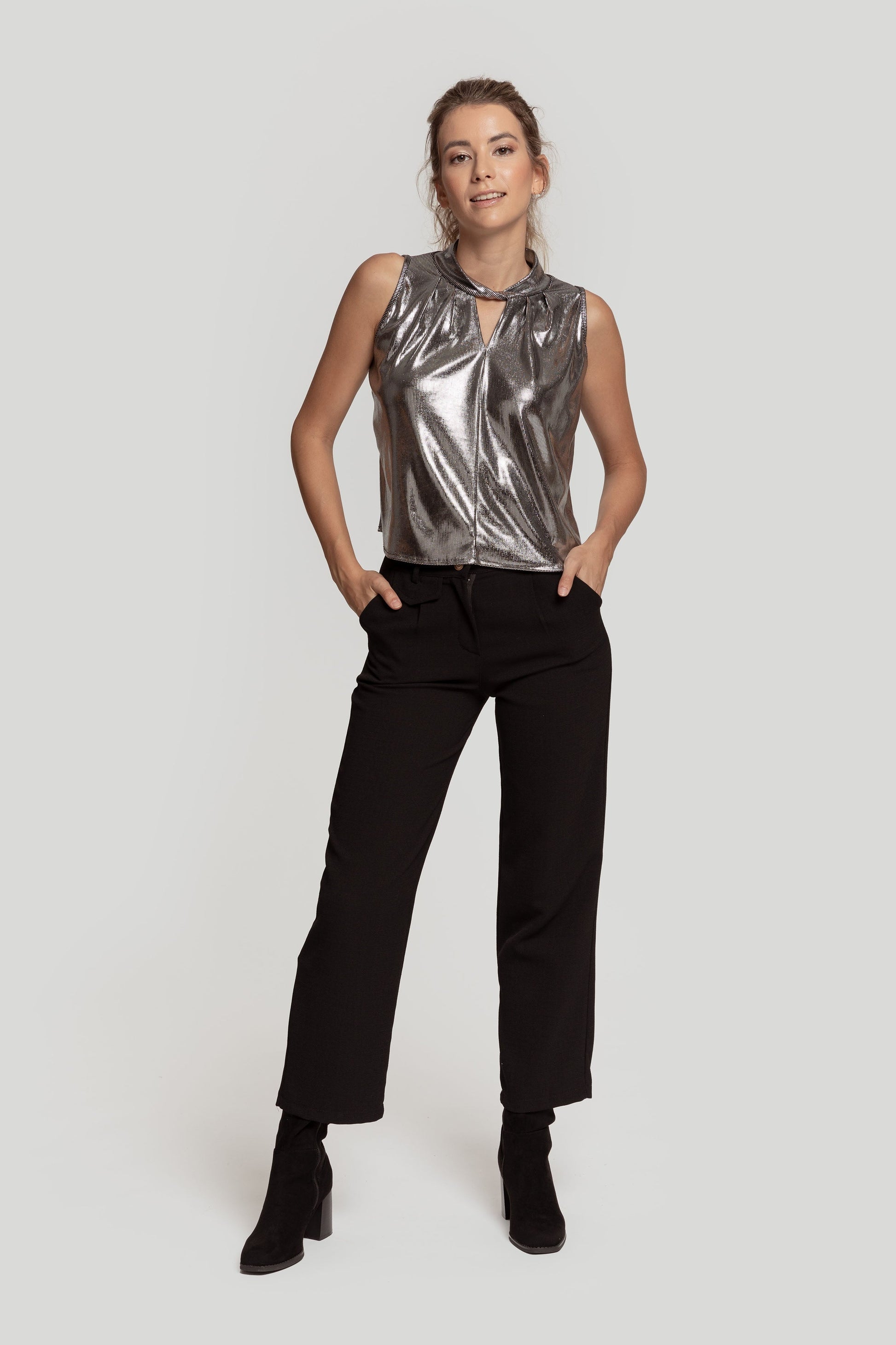 Tejido brillo. Diseño fluido. Cuello perkins. Manga sisa. Doble botón en la nuca. Forrado. Talla modelo: S. Altura modelo 1,70 m.