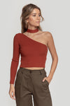 Tejido de canalé. Diseño crop. Cuello asimétrico. Manga larga. Talla modelo: S. Altura modelo: 1,70 m.