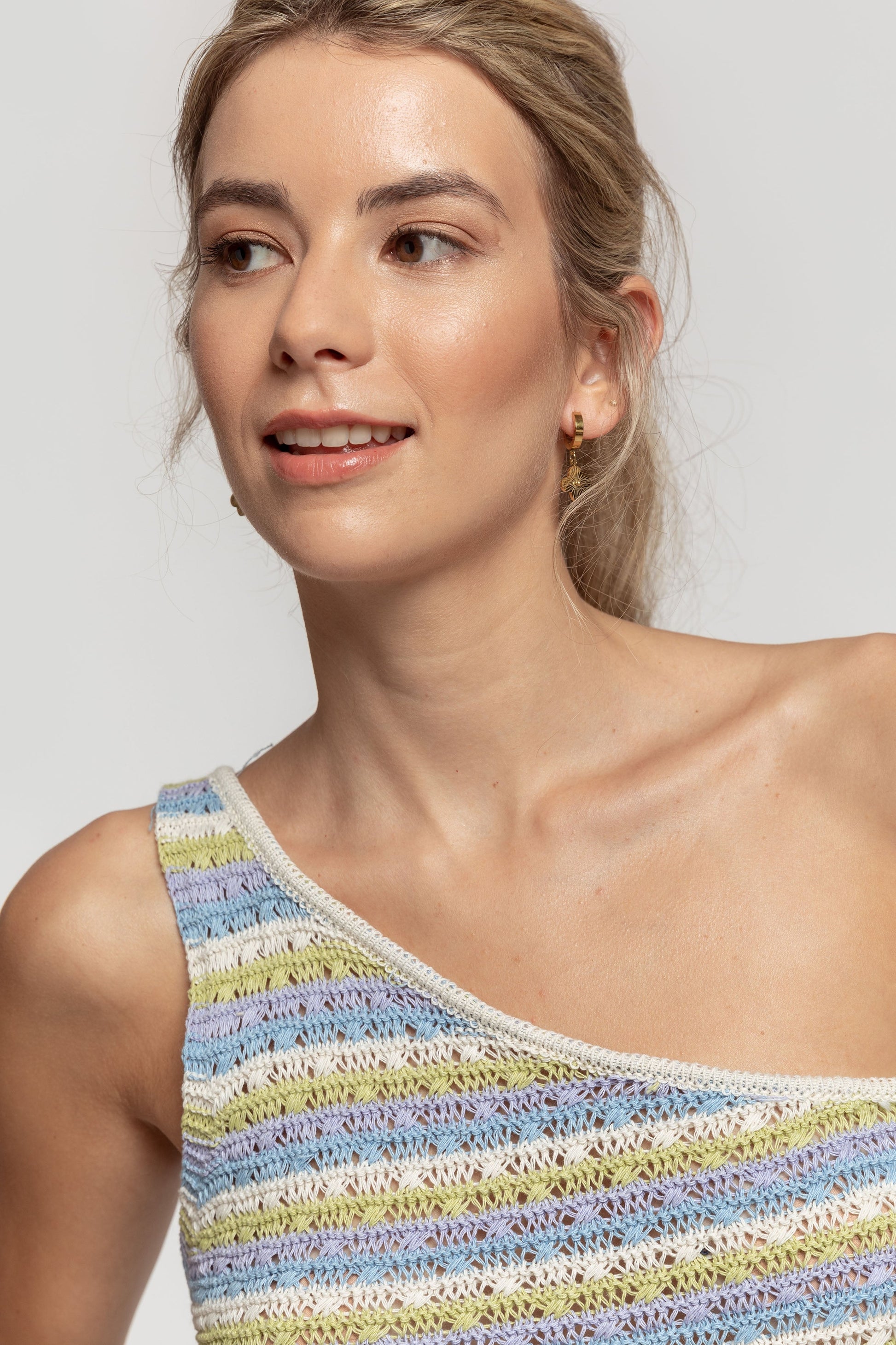 Top calado. Top de punto. Tejido de algodón. Diseño estampado. Diseño recto. Cuello asimétrico. Sin mangas. Talla modelo: S. Altura modelo: 1.70 m.