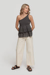 Tejido fluido.Tejido mezcla algodón. Diseño peplum. Manga asimétrica. Bajo volante. Efecto doble. Talla modelo: S. Altura modelo 1,70 m.