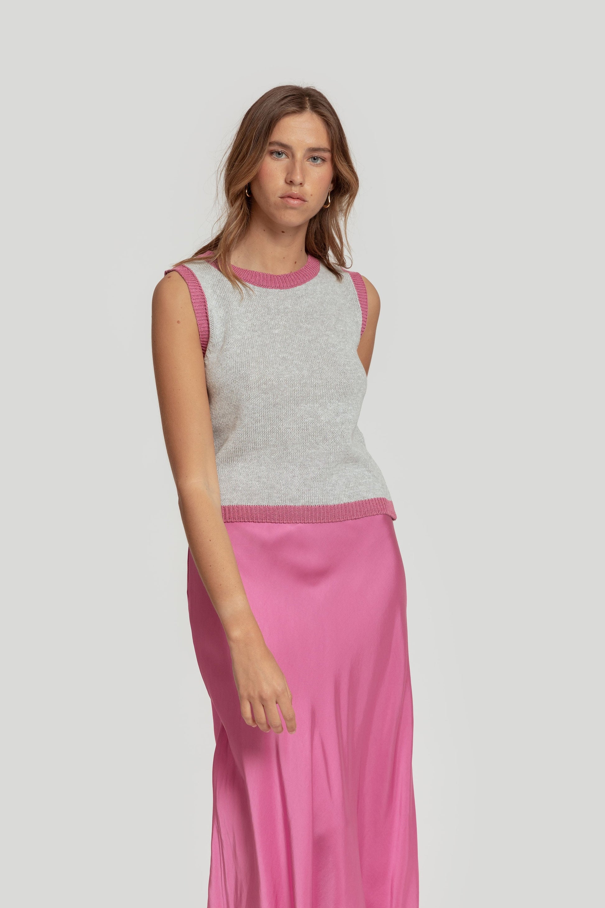 Tejido de algodón. Tejido de punto. Tejido trenzado. Diseño recto. Manga sisa. Terminaciones en otro color. Talla modelo: S. Altura modelo: 1,70 m.