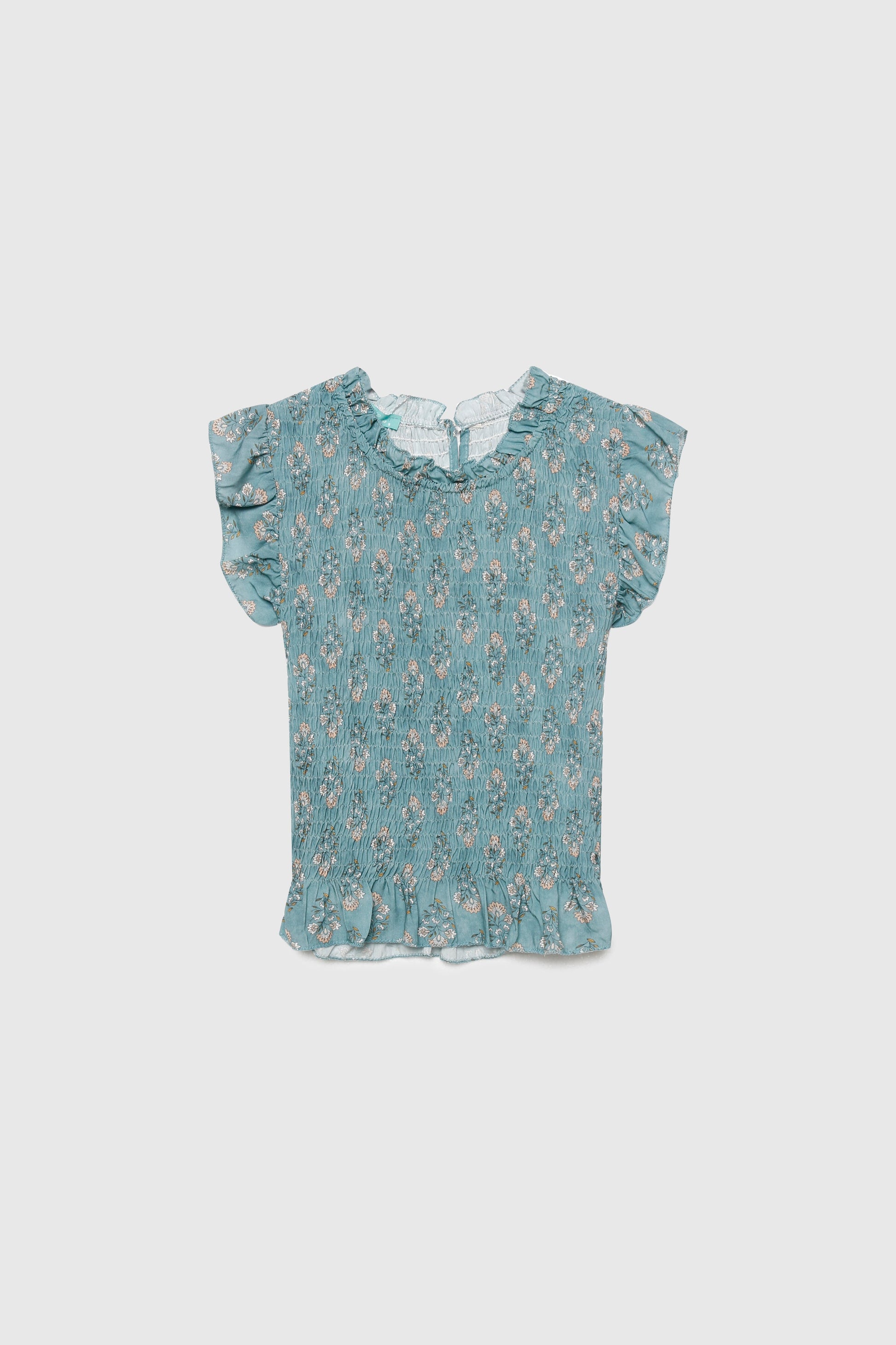 Tejido fluido. Tejido textura. Diseño estampado. Diseño recto. Diseño ajustado. Cuello redondo. Manga sisa. Terminaciones en volante. Talla modelo: S. Altura modelo: 1,70 m.