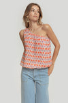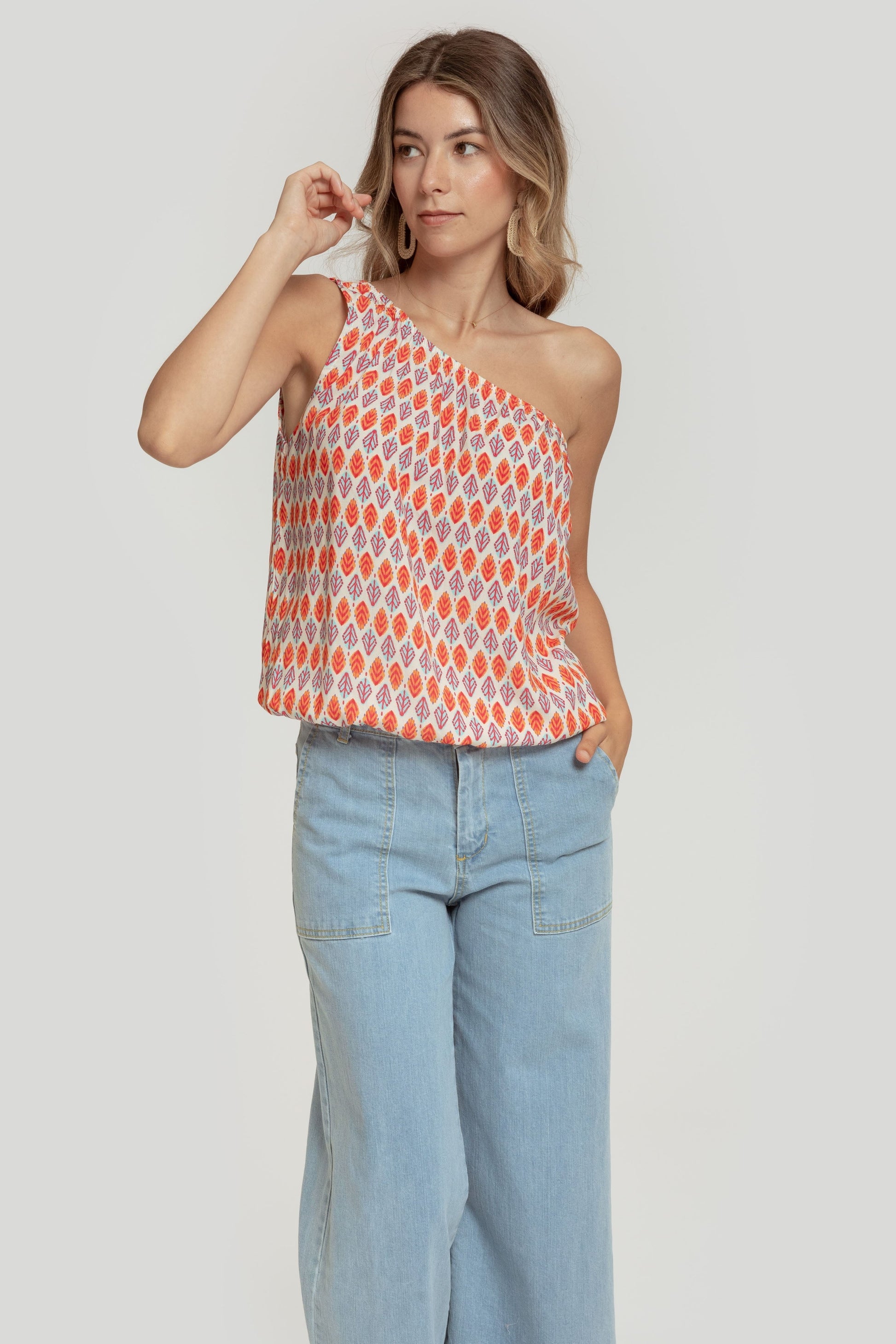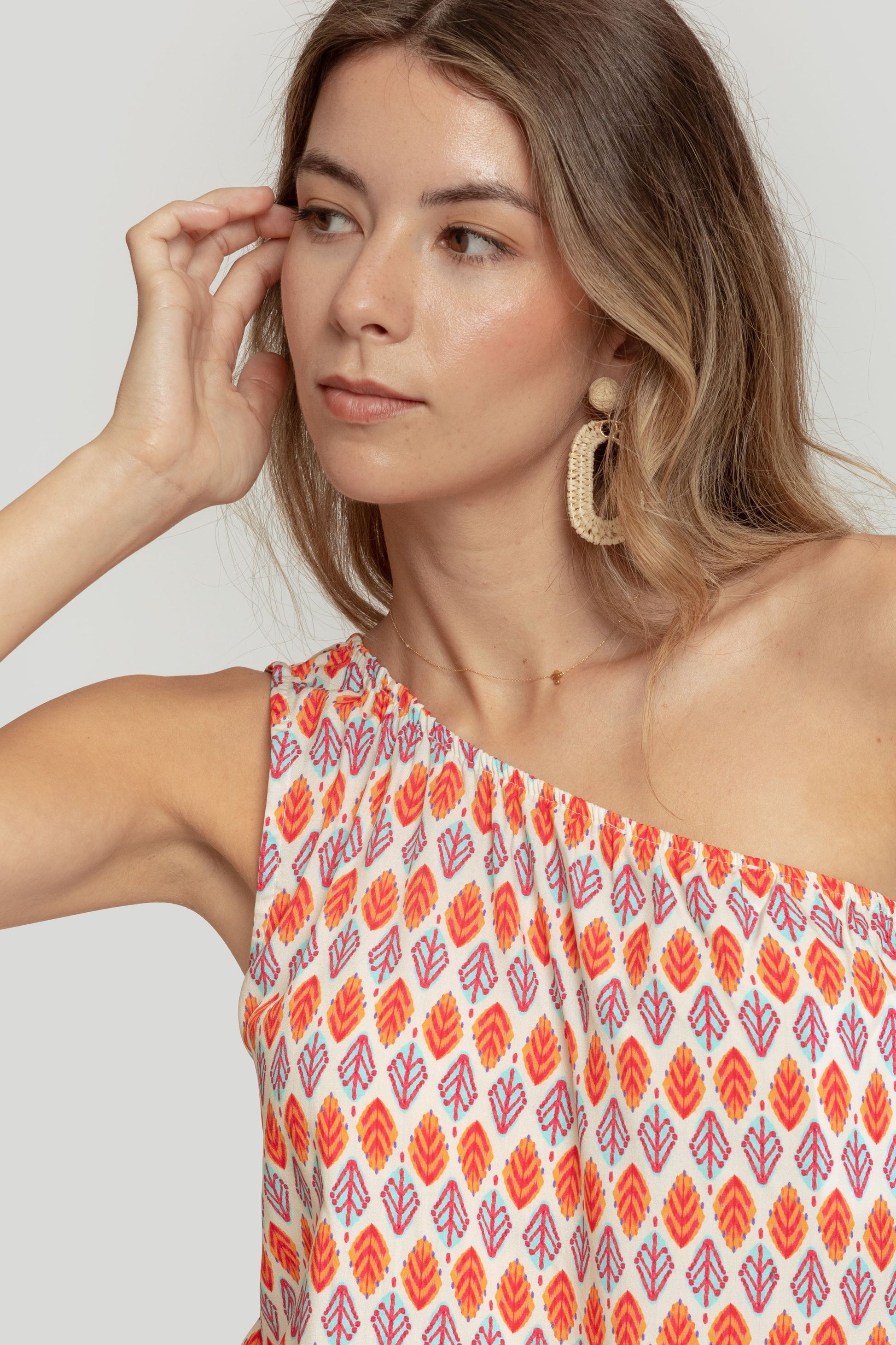 Tejido fluido. Diseño estampado. Diseño globo. Diseño amplio. Manga asimétrica. Manga sisa. Acabado elástico. Talla modelo: S. Altura modelo 1,70 m.