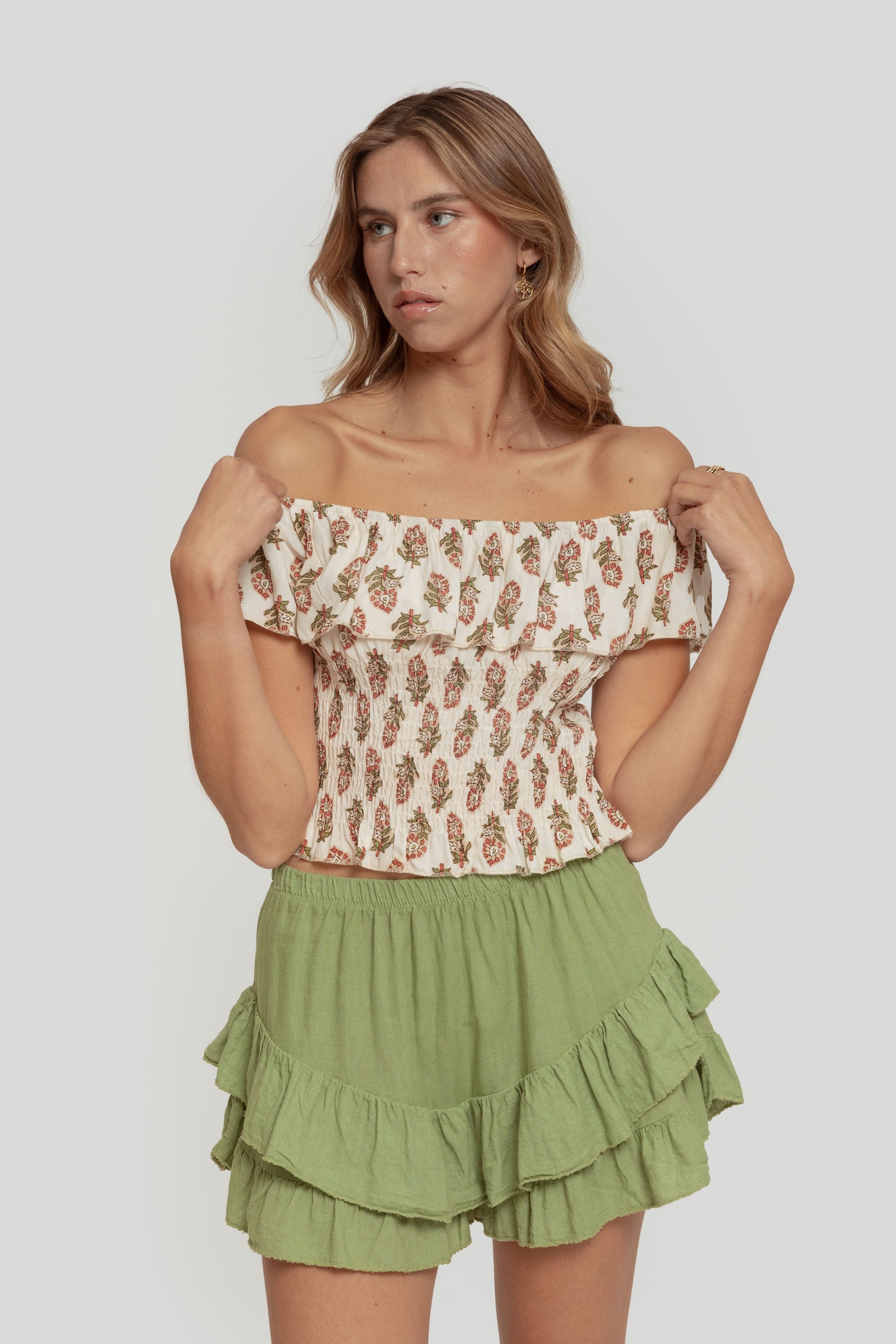 Tejido fluido. Diseño estampado. Diseño recto. Panel elástico. Hombros descubierto. Talla modelo: S. Altura modelo: 1,70 m.