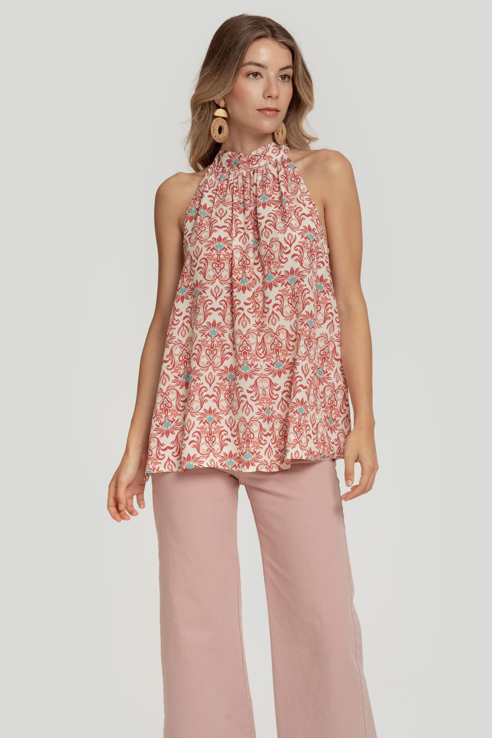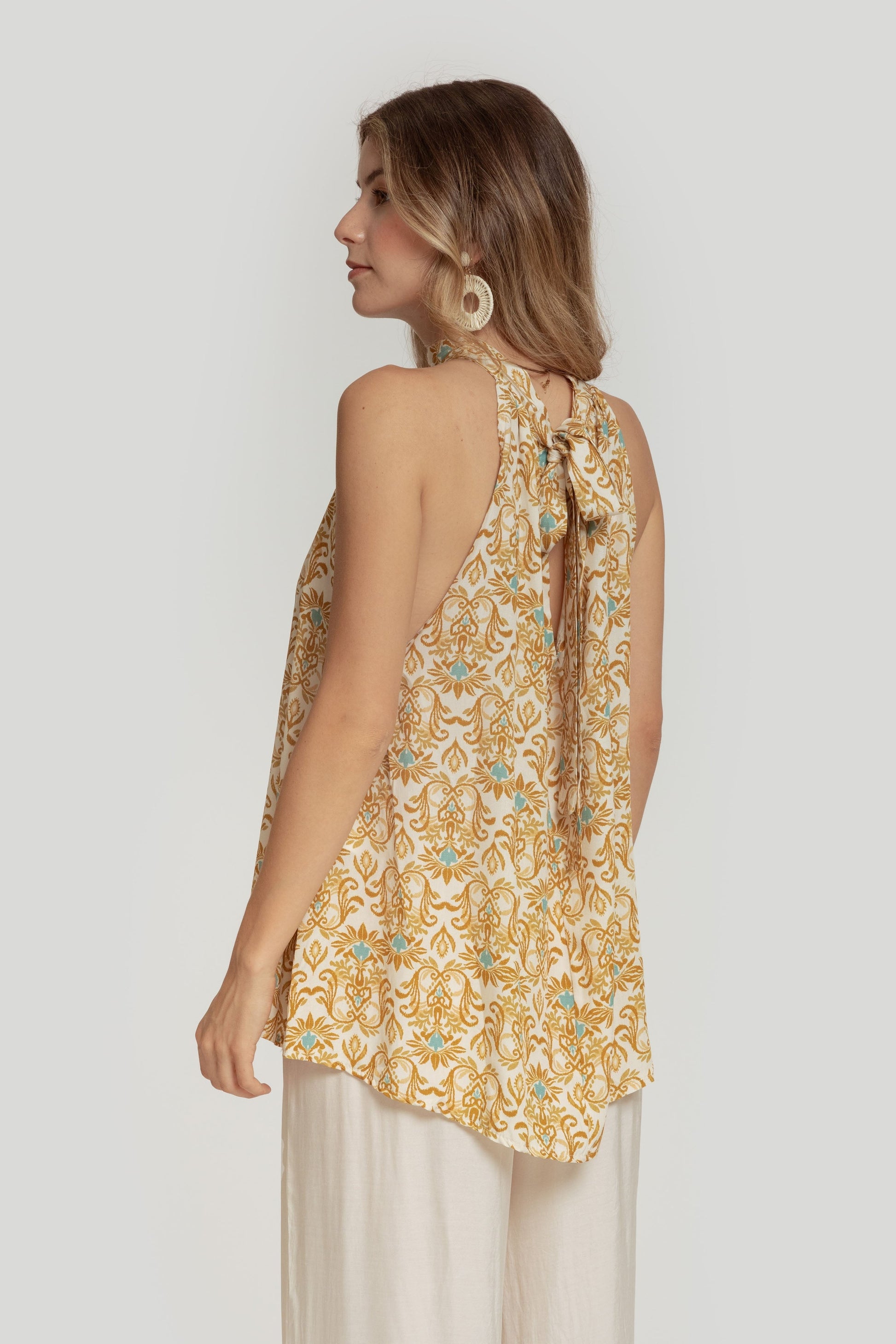 Tejido fluido. Diseño estampado. Diseño amplio. Cuello halter. Lazo posterior en el cuello. Talla modelo: S. Altura modelo: 1,70 m.