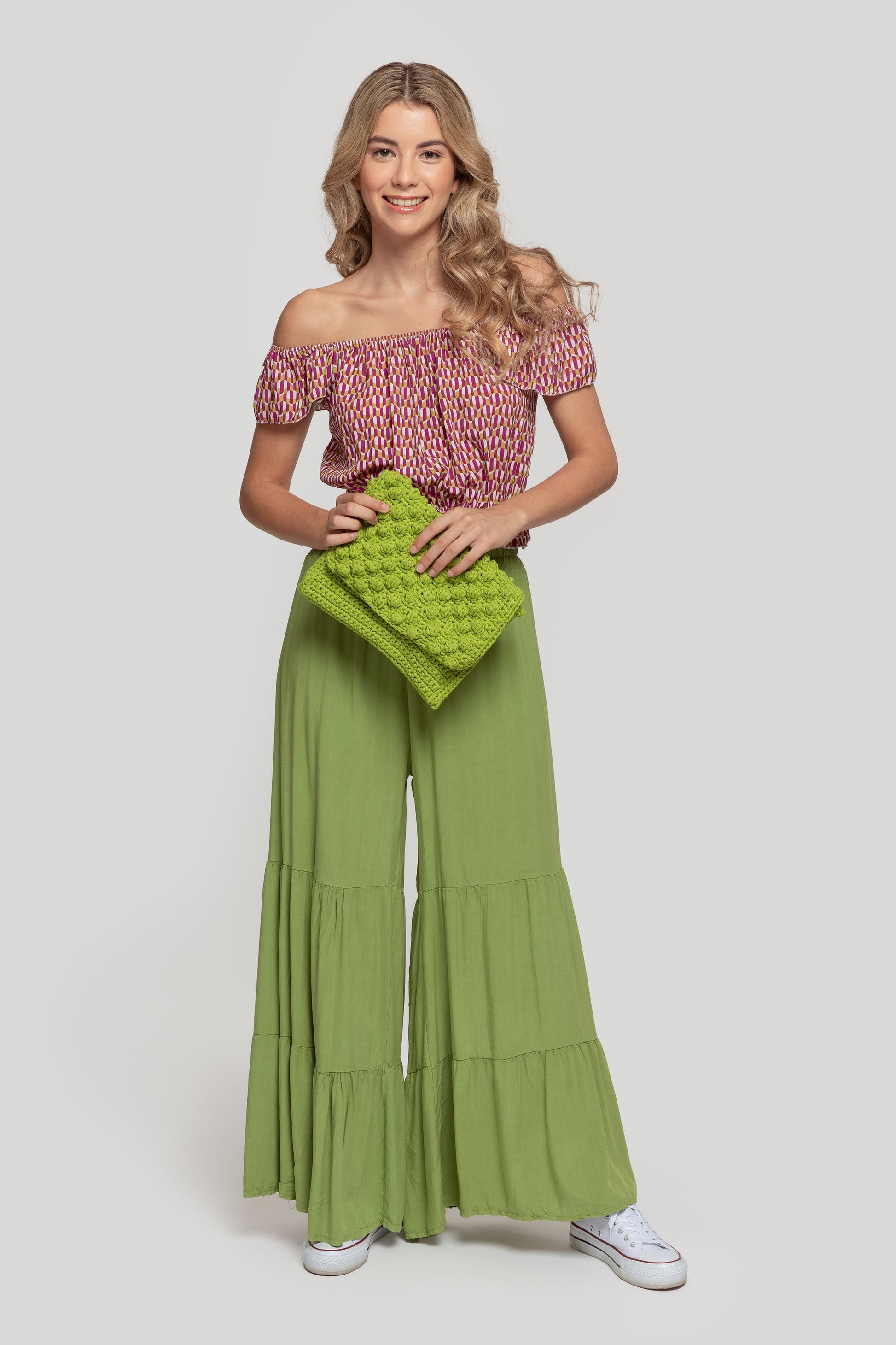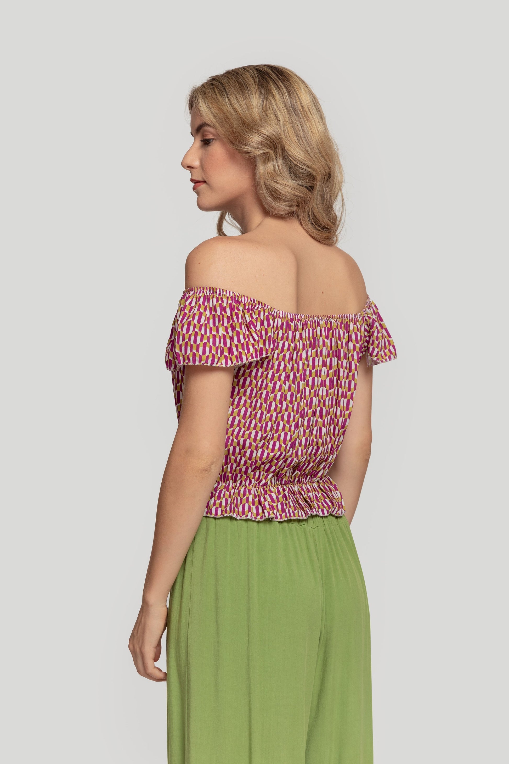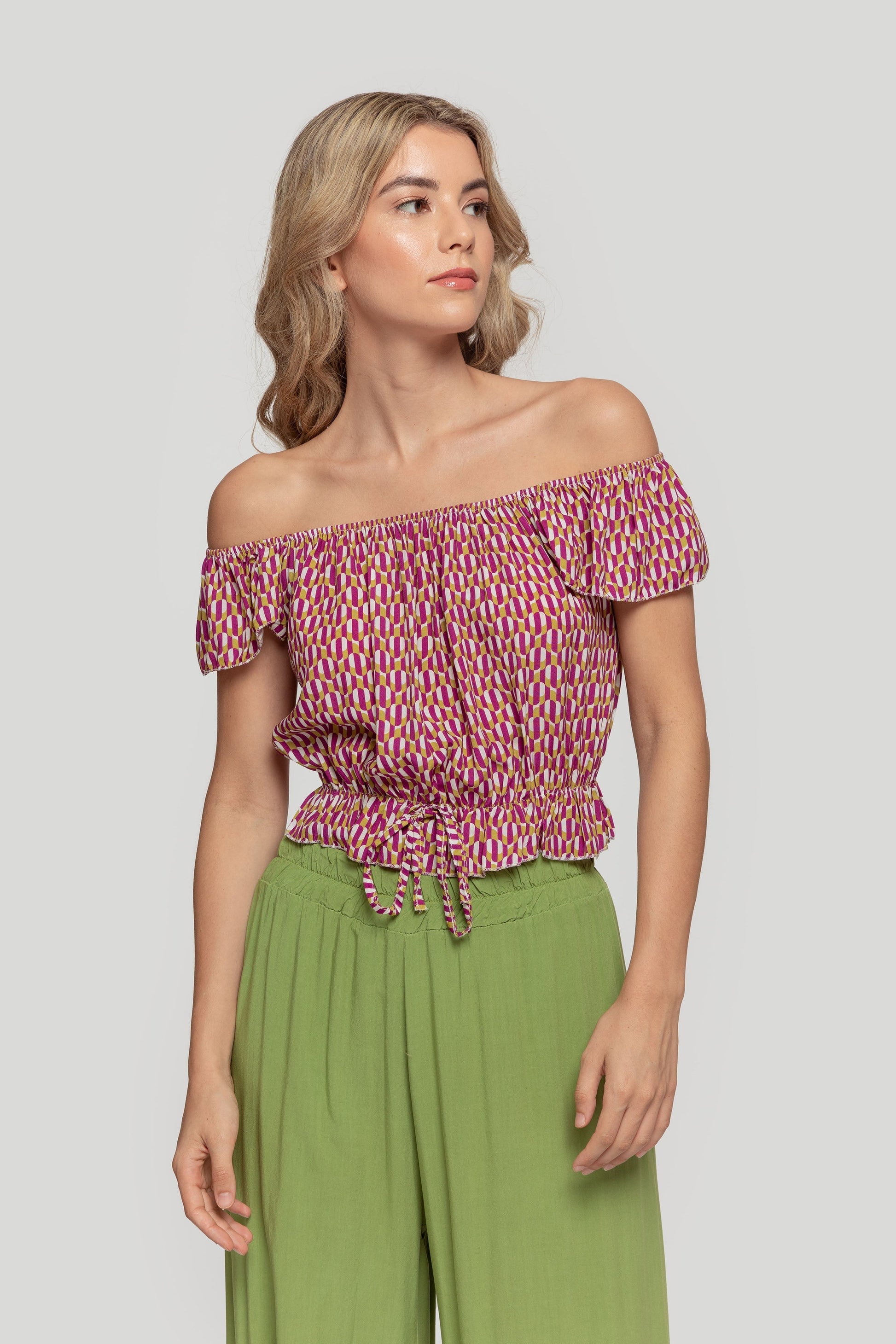 Tejido satinado. Diseño corto. Diseño estampado. Escote palabra de honor. Bajo elástico. Nudo decorativo. Talla modelo: S. Altura modelo 1,70 m.