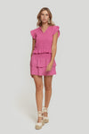 Tejido textura. Diseño recto. Diseño ajustado. Cuello redondo. Cuello pico. Manga sisa. Terminaciones en volantes. Talla modelo: S. Altura modelo: 1,70 m.