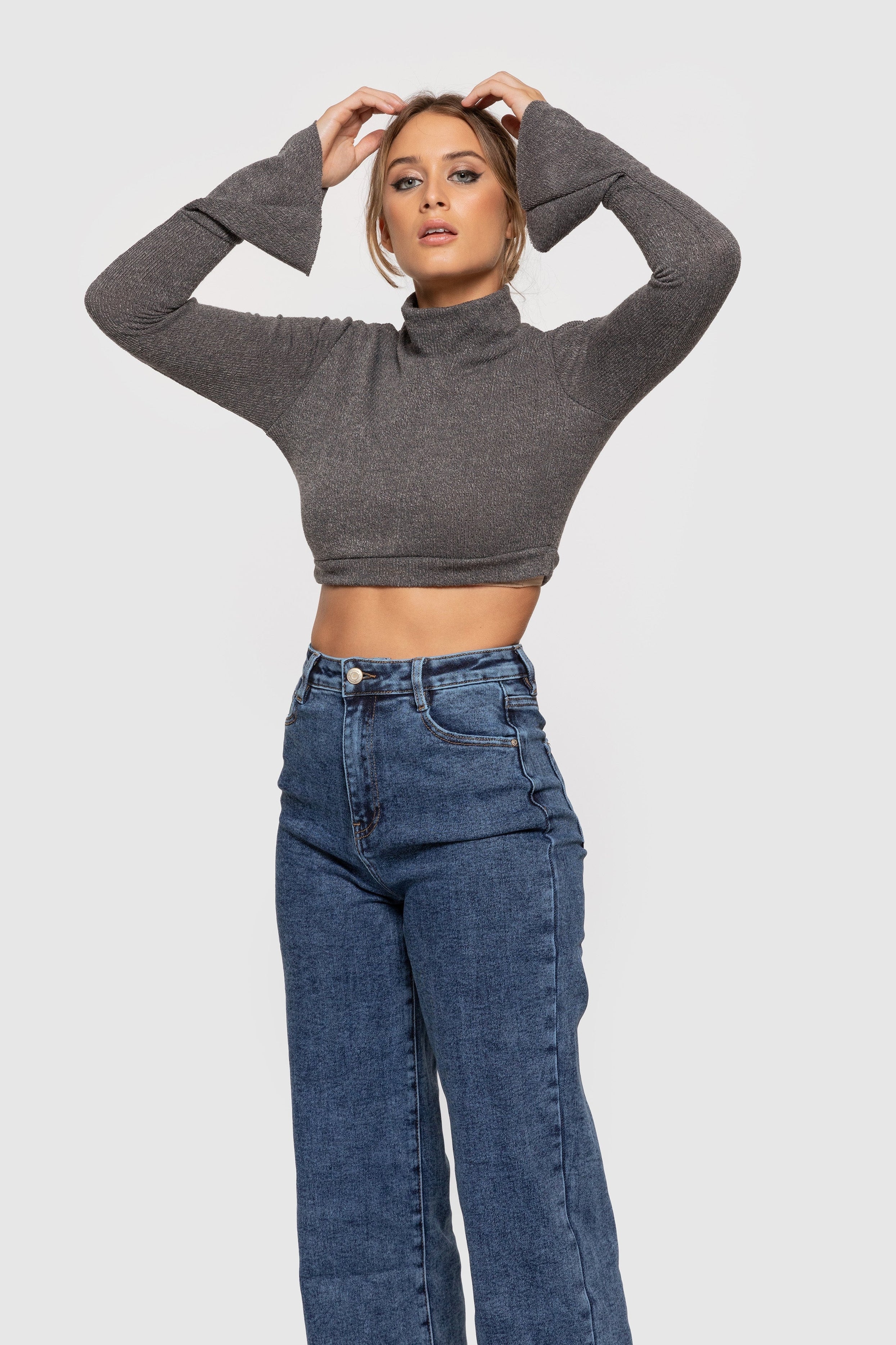 Top de canalé. Diseño corto. Diseño ajustado. Cuello perkings. Manga larga acampanada. Talla modelo: S. Altura modelo 1,66 m.