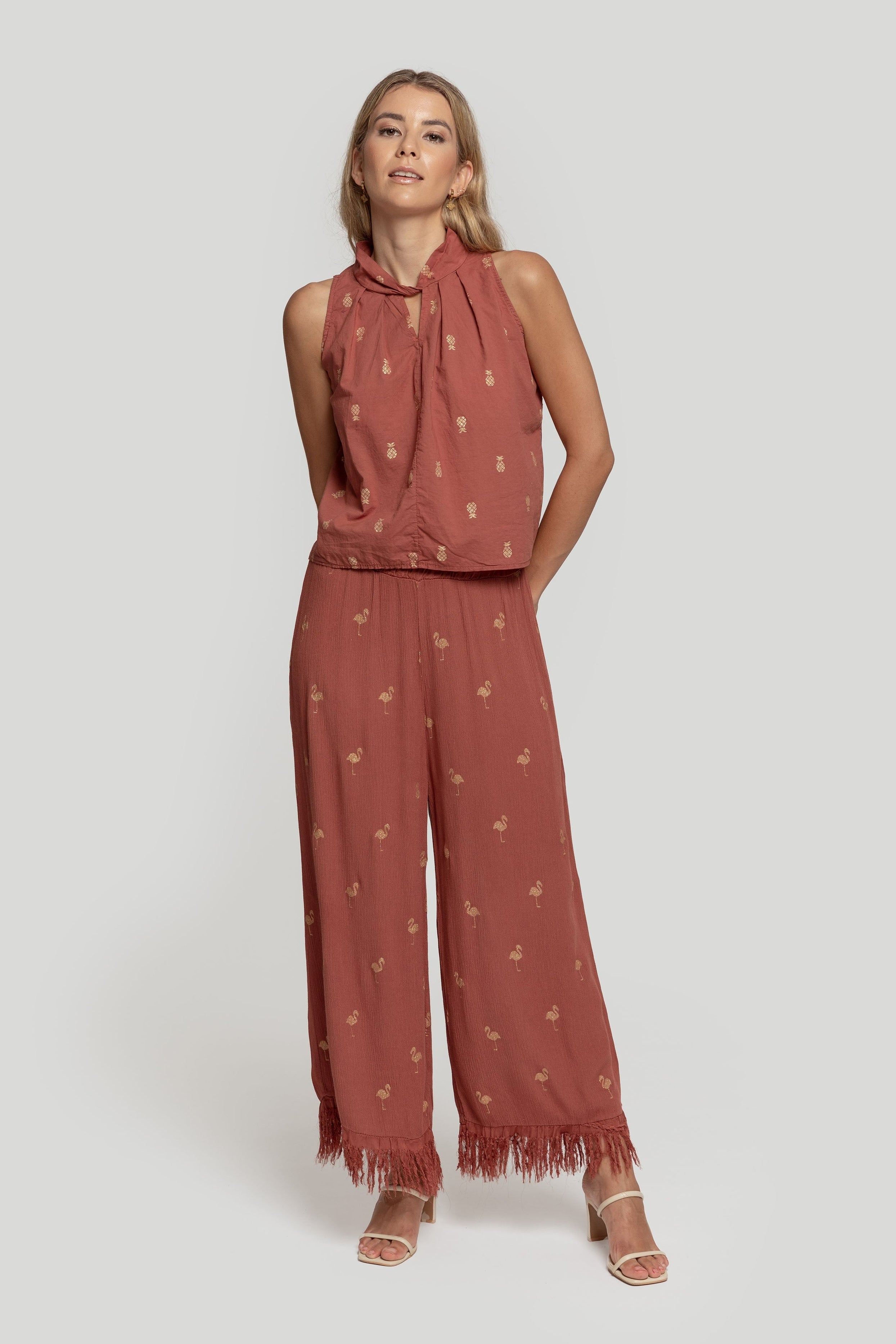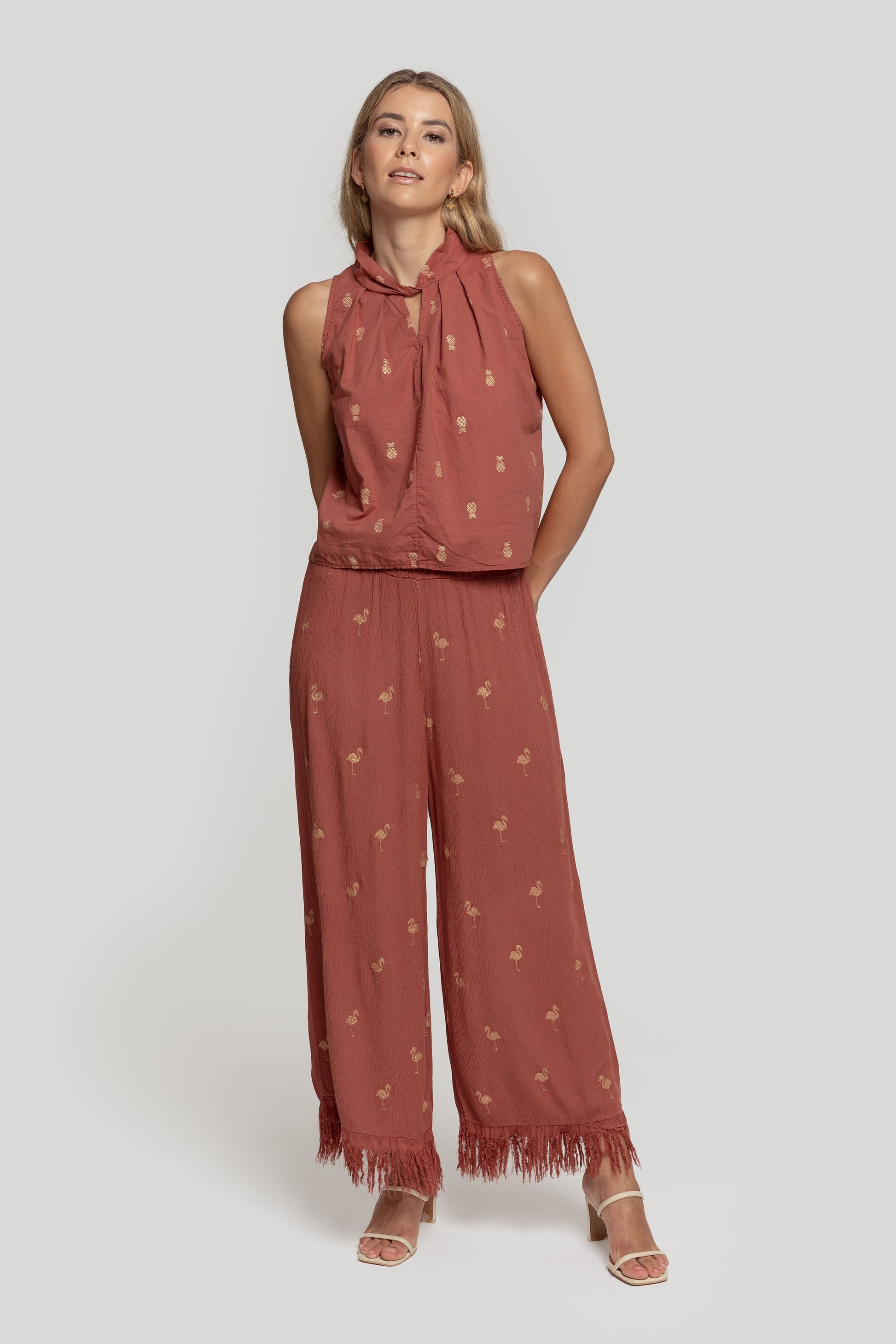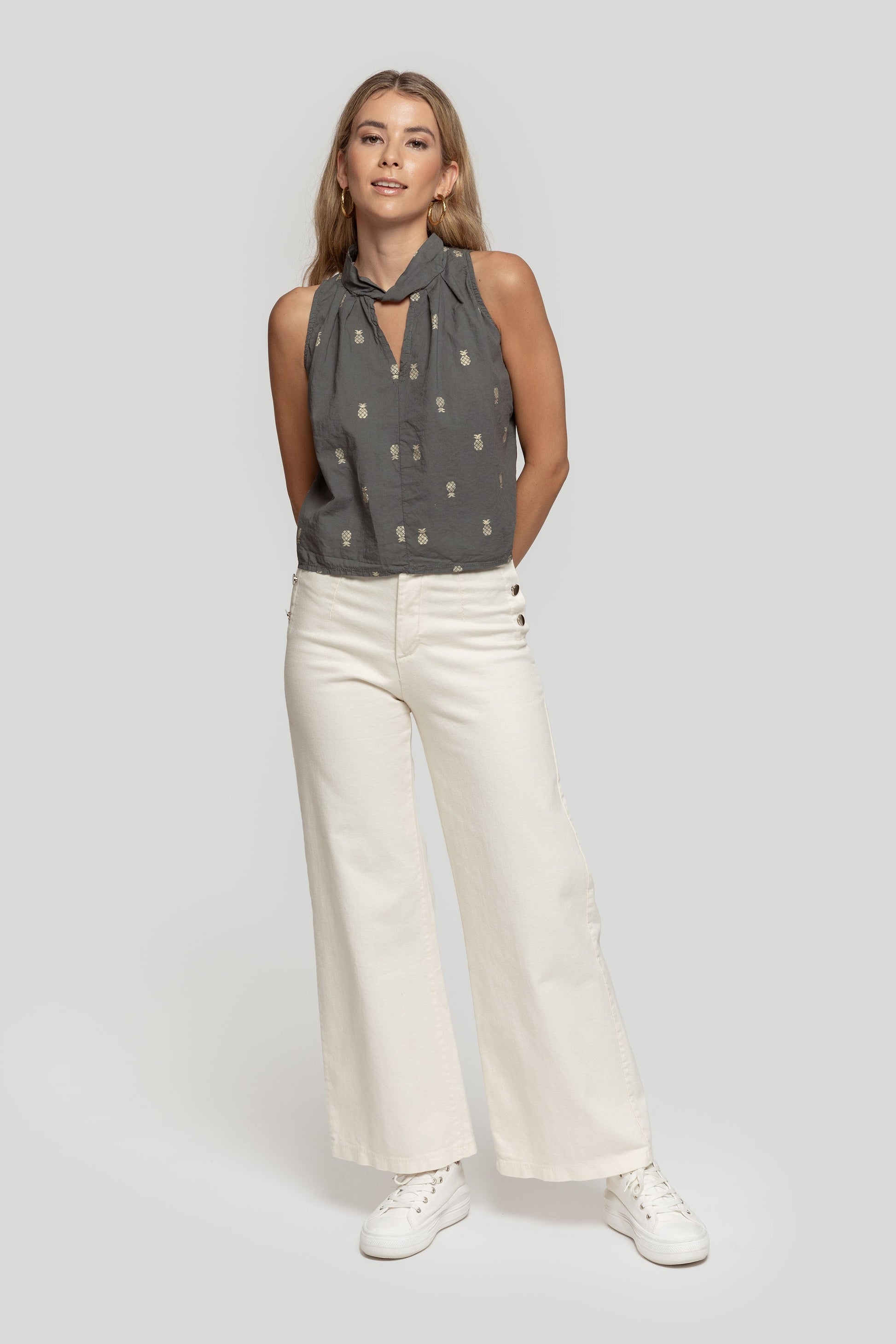Tejido mezcla de algodón. Diseño estampado. Diseño recto. Cuello alto. Manga sisa. Doble botón en la nuca. Talla modelo: S. Altura modelo 1,70 m.
