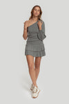 Tejido con textura. Diseño corto. Panel elástico. Manga asimétrica. Manga larga. Detalle costuras brillantes. Talla modelo: S. Altura modelo: 1,70 m.