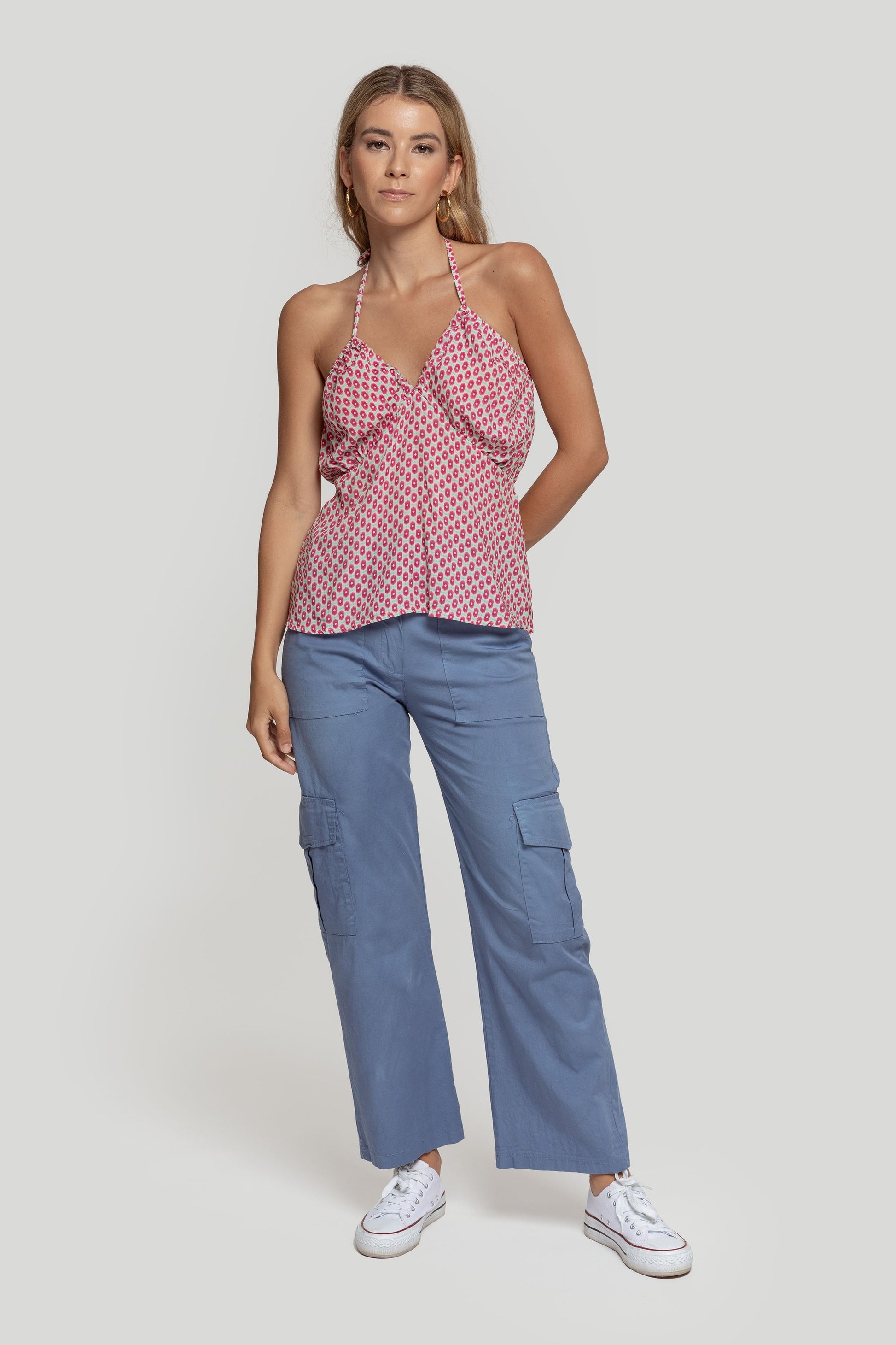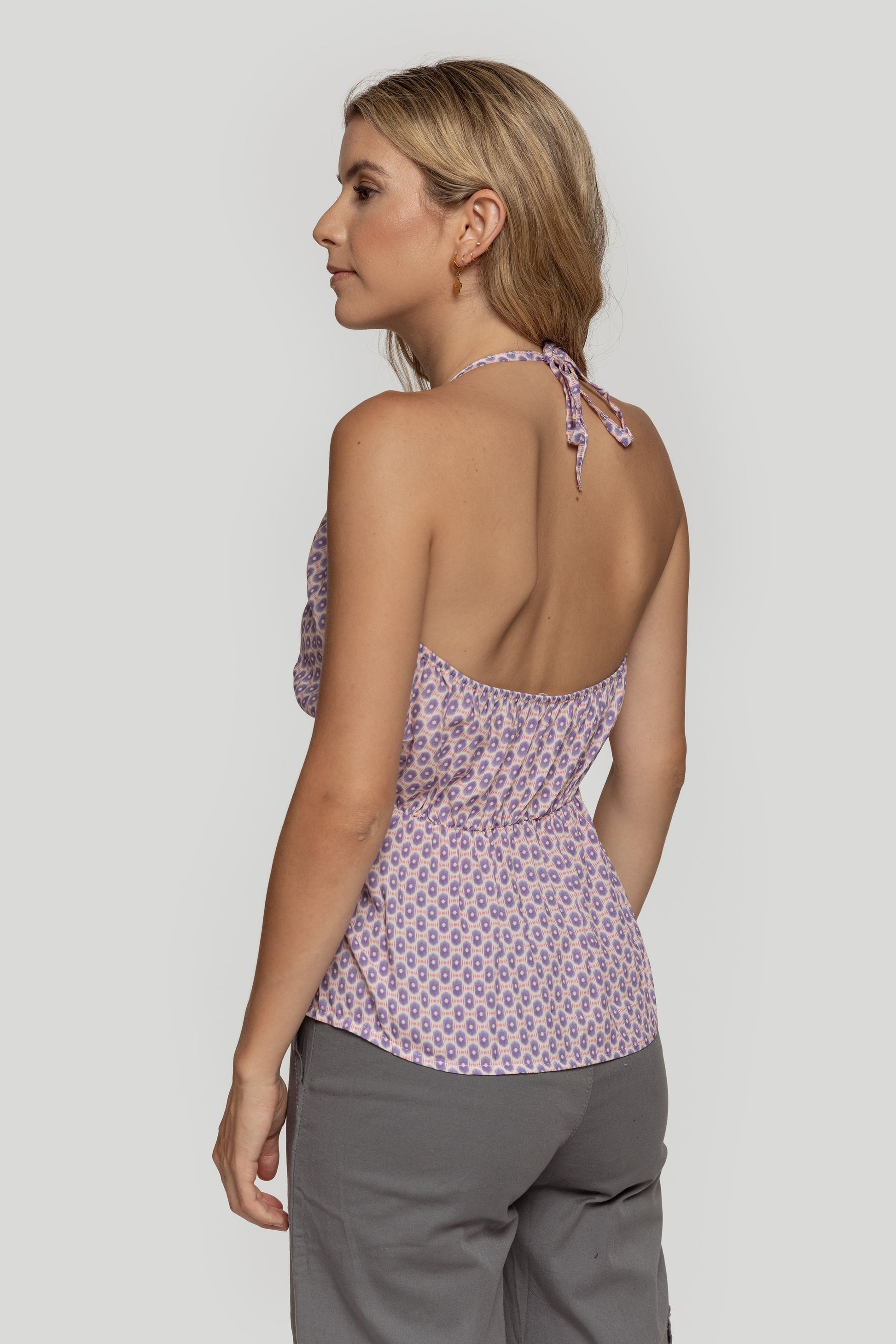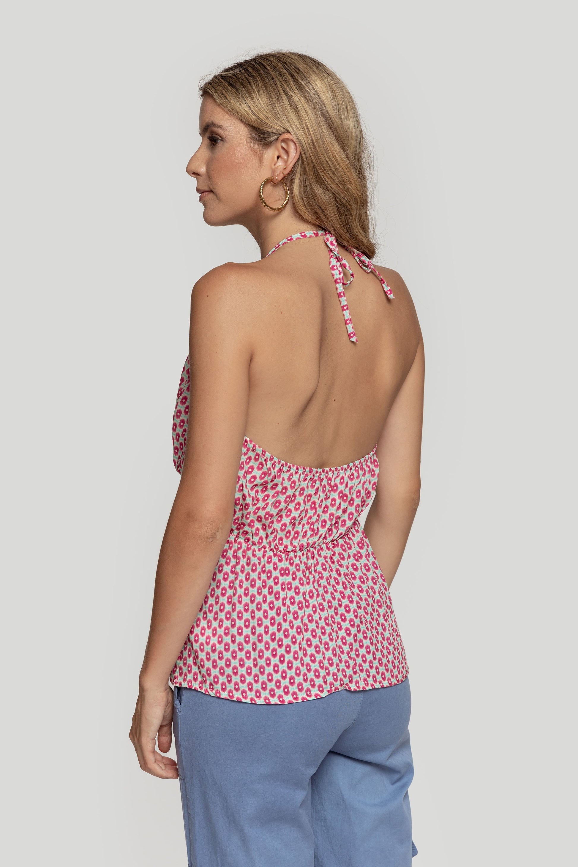 Tejido satinado. Diseño estampado. Diseño crop. Escote halter. Tirante fino. Anudado al cuello. Espalda descubierta. Talla modelo: S. Altura modelo: 1,70 m.
