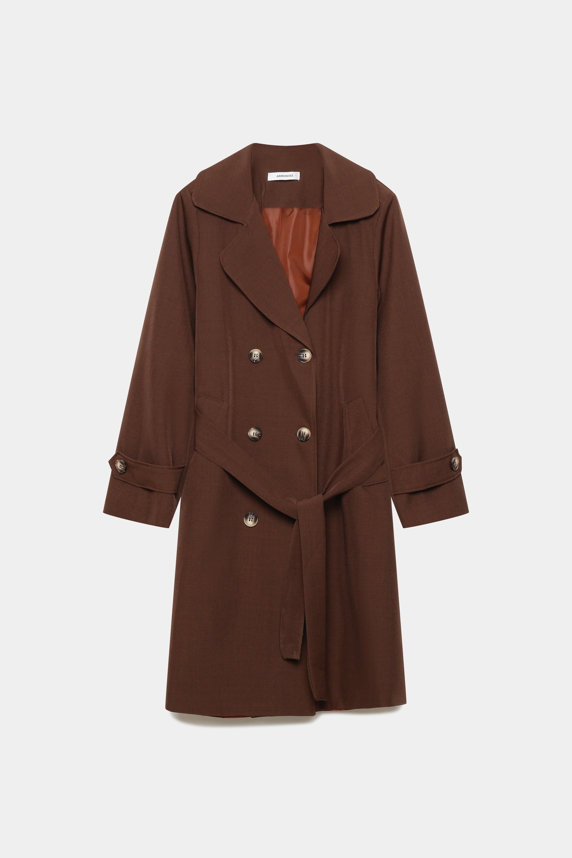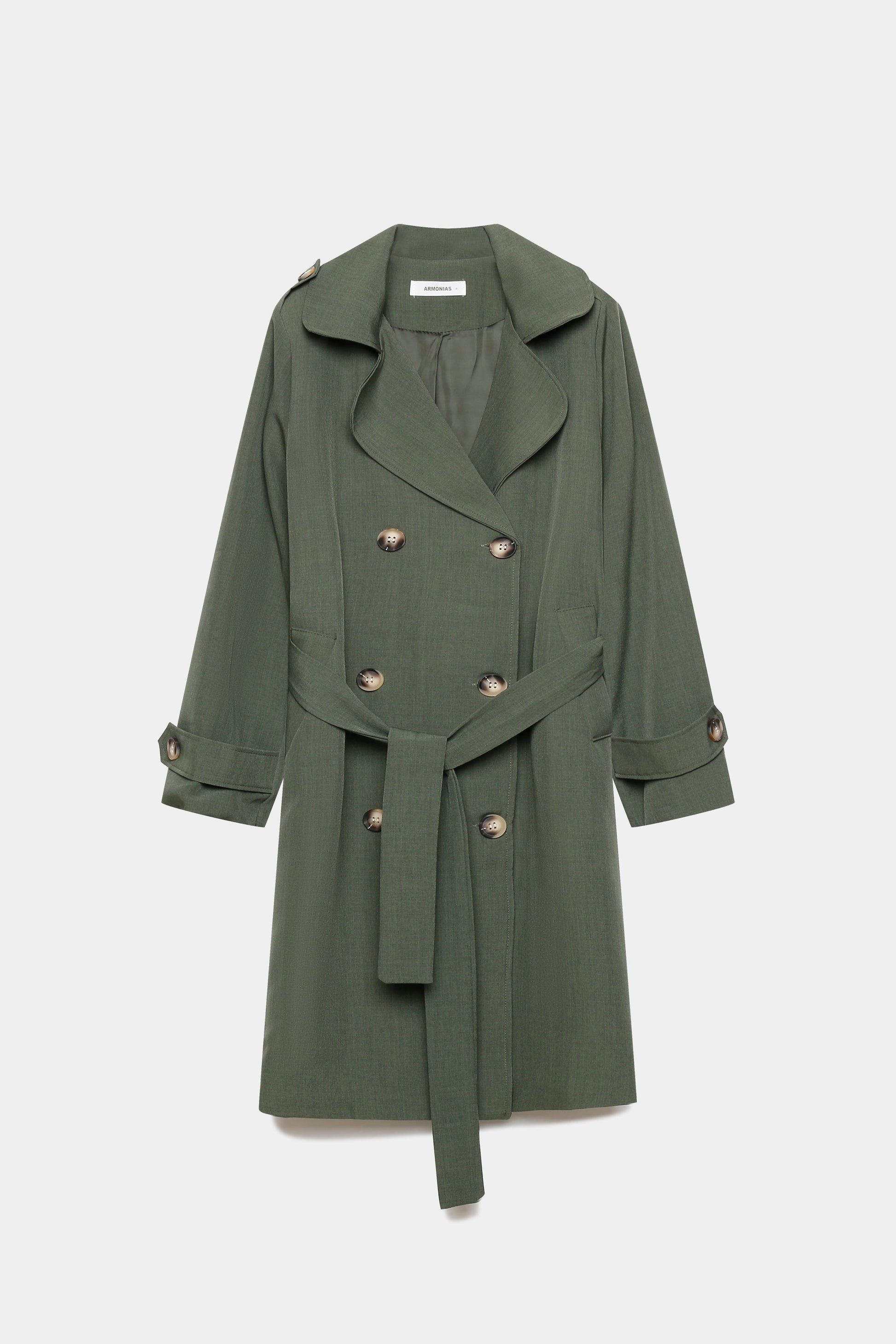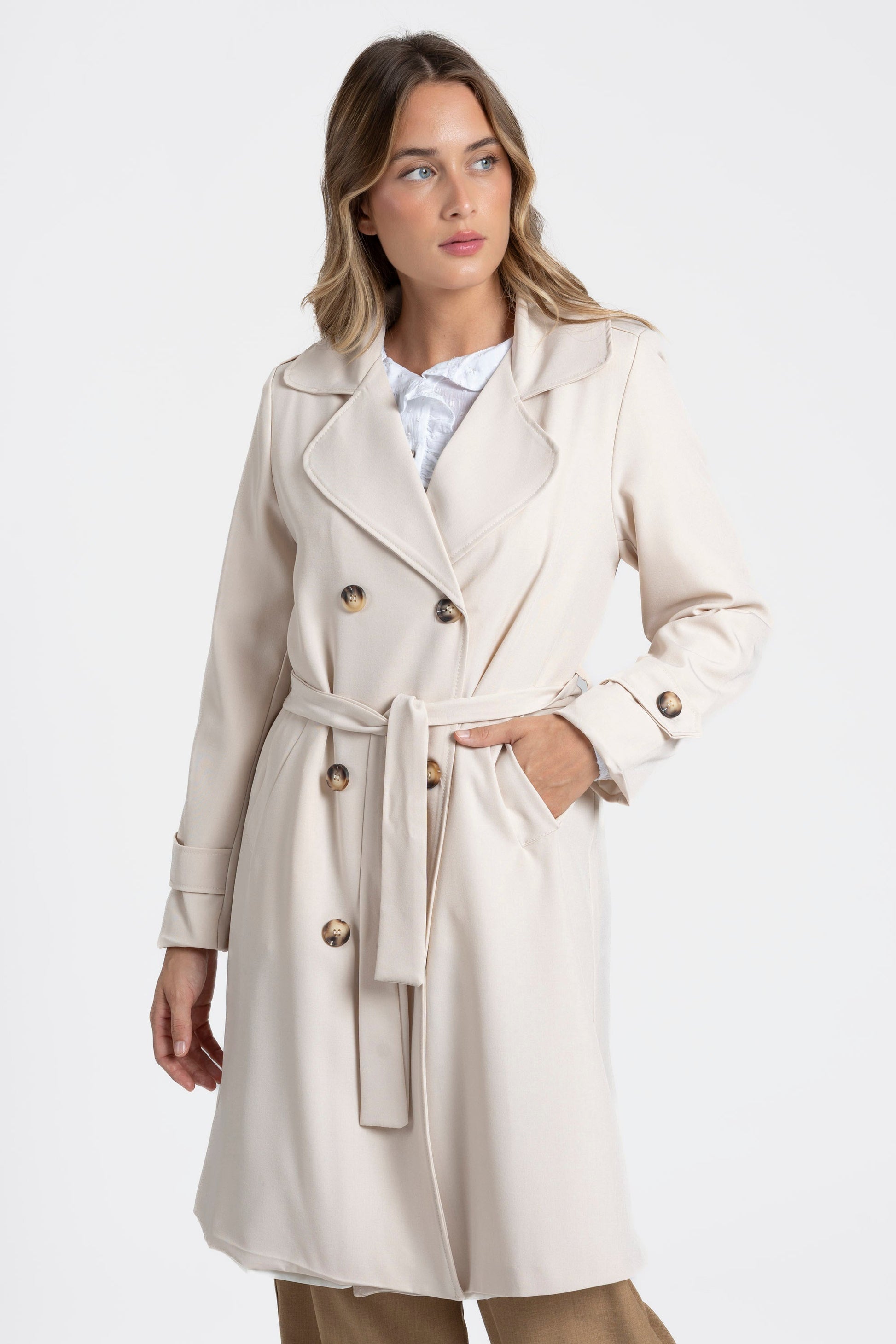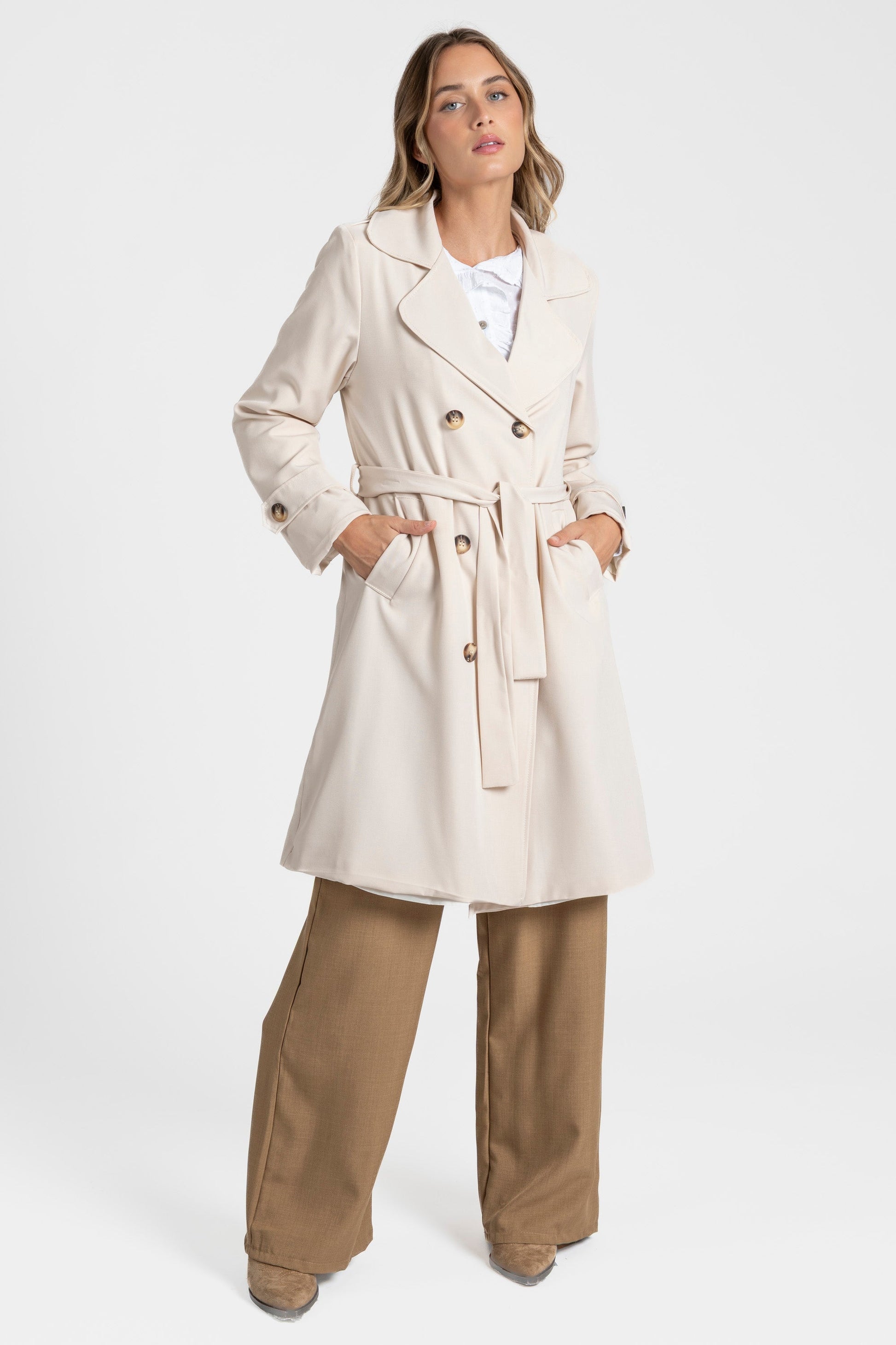 Trench de cuello solapa y manga larga. Bolsillos delanteros. Cierre frontal cruzado con botones y cinturón del mismo tejido.