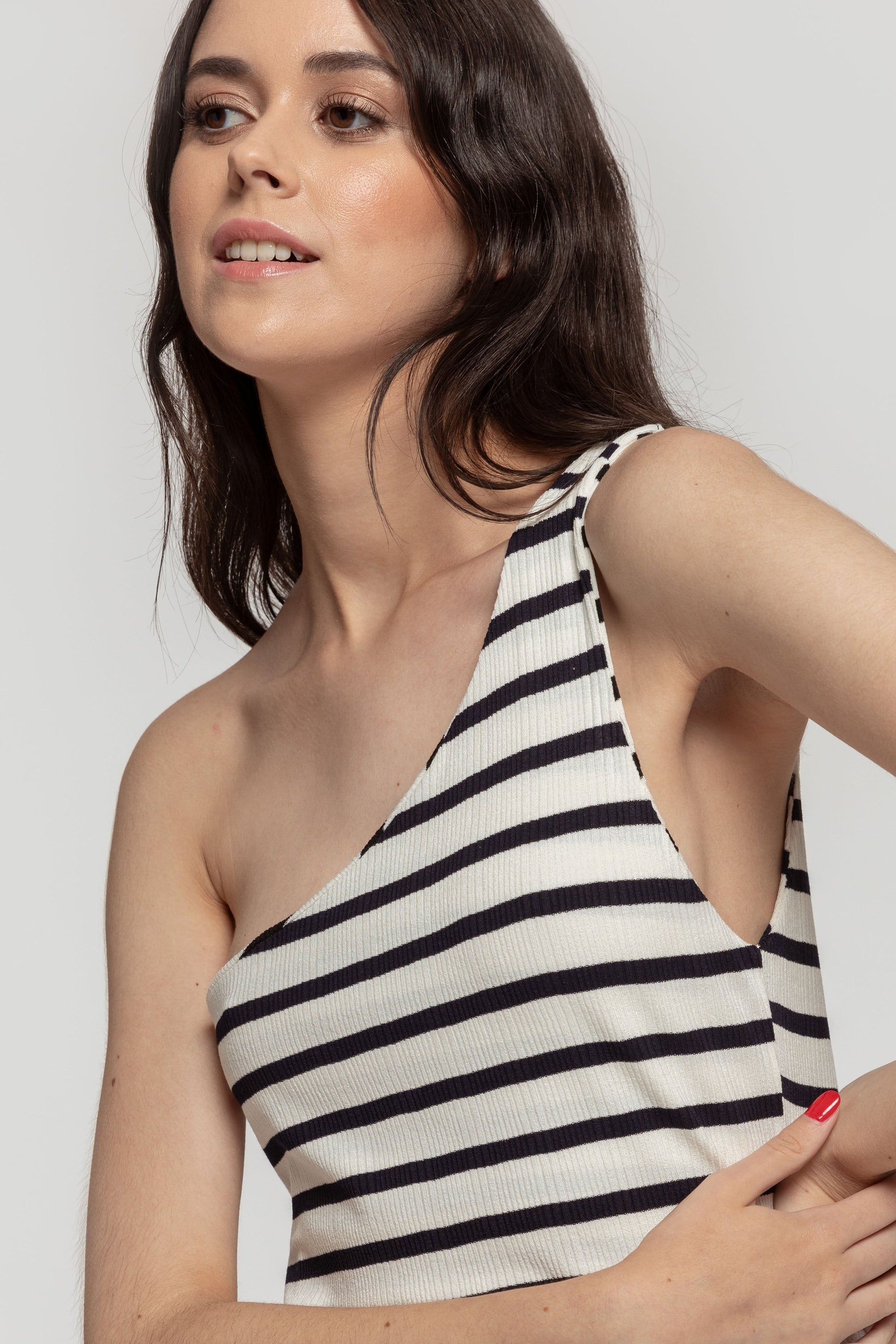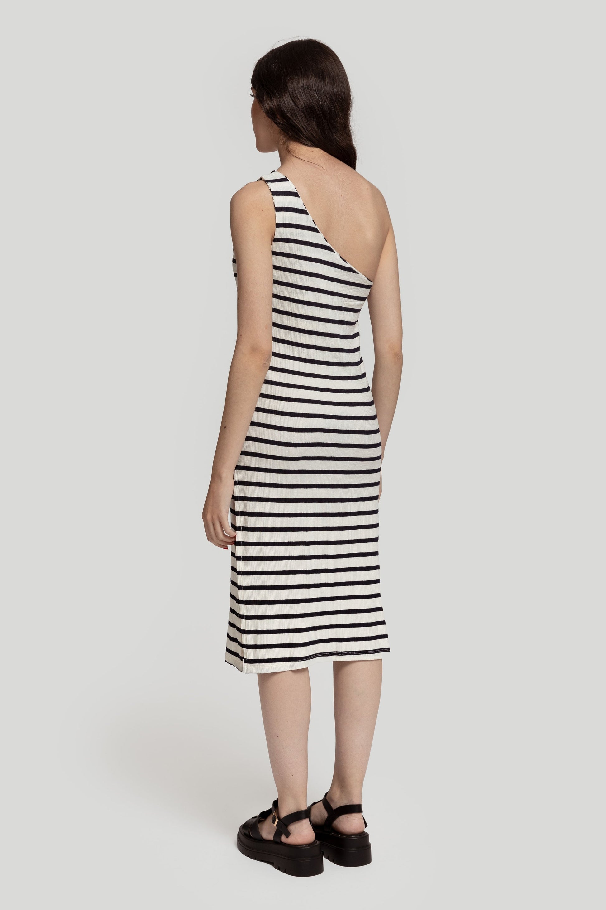 Vestido midi. Diseño básico. Diseño estampado. Diseño recto. Diseño ajustado. Escote asimétrico. Sin manga. Talla modelo: S. Altura modelo 1,67 m.