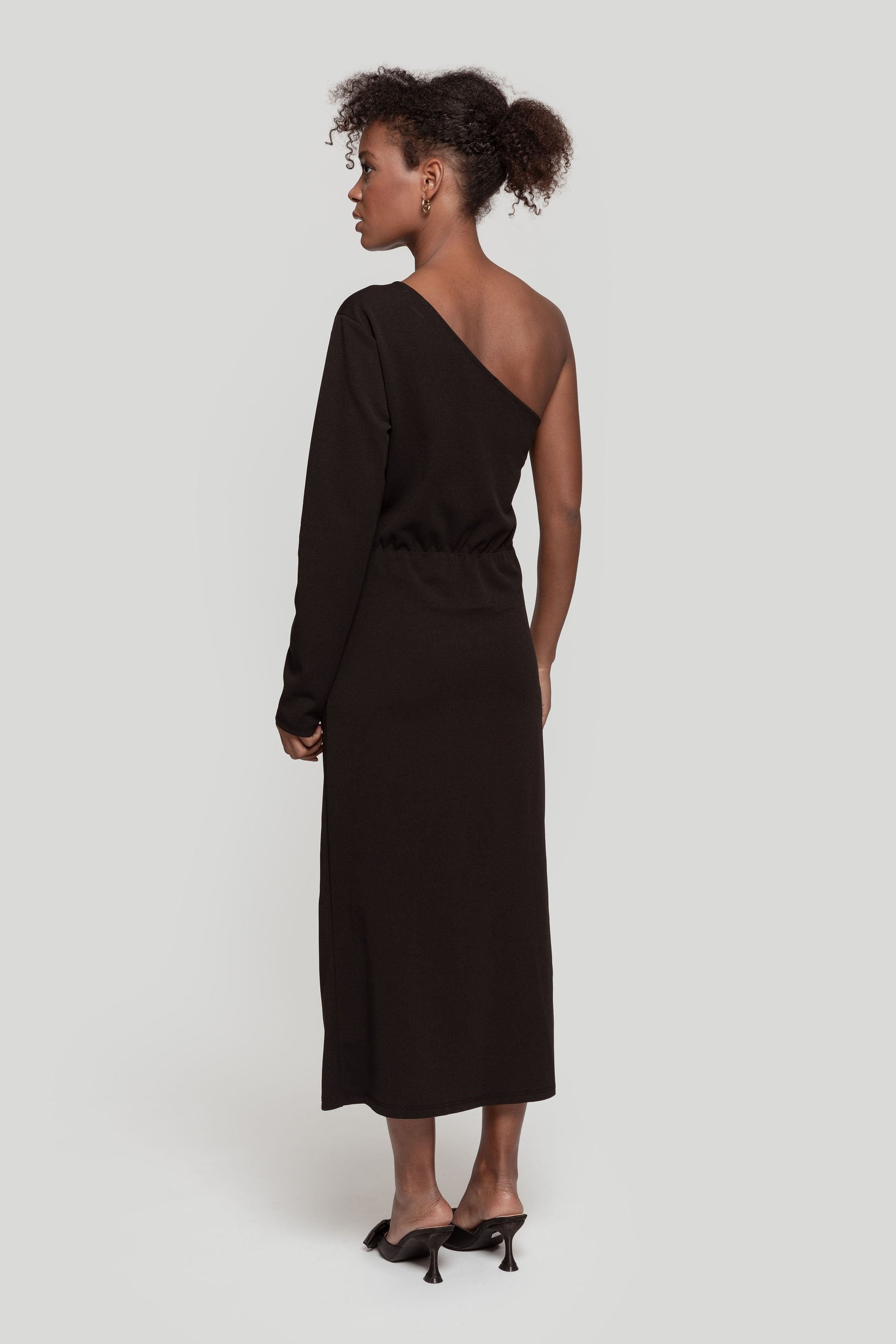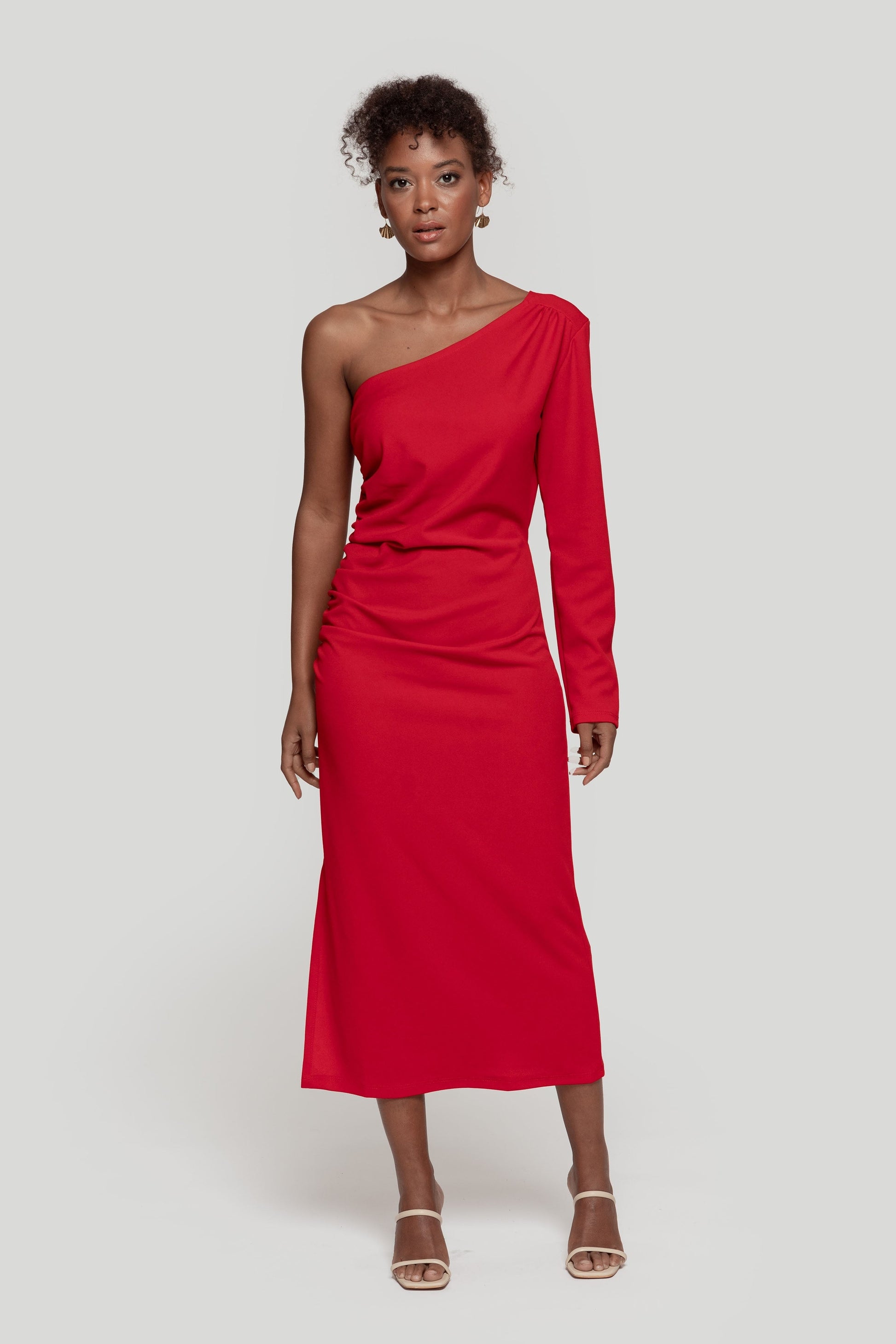 Tejido elástico. Diseño recto. Diseño entallado. Diseño midi. Diseño frunce. Cuello asimétrico. Manga larga. Abertura lateral. Talla modelo: S. Altura modelo 1,65 m.