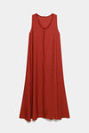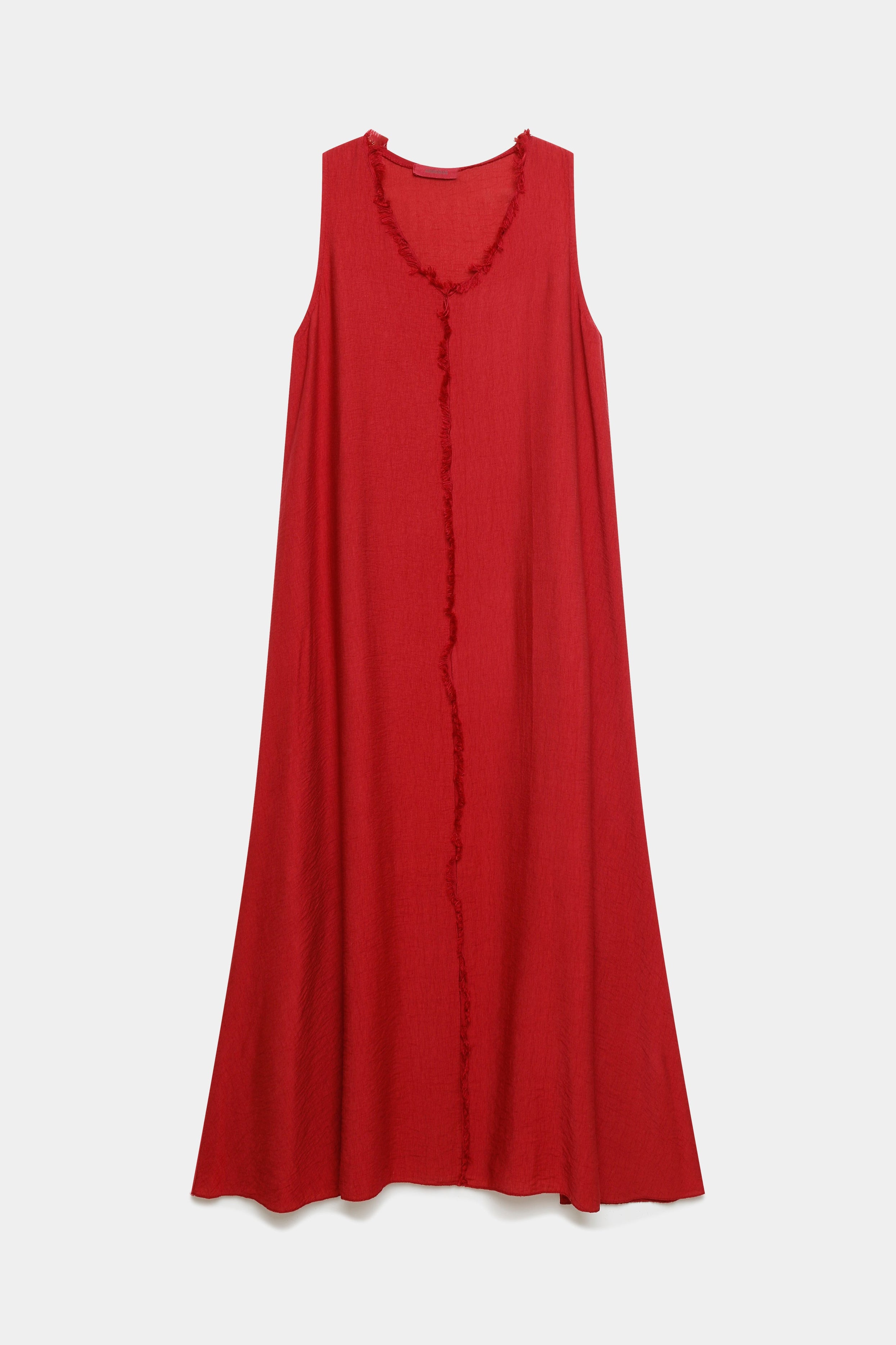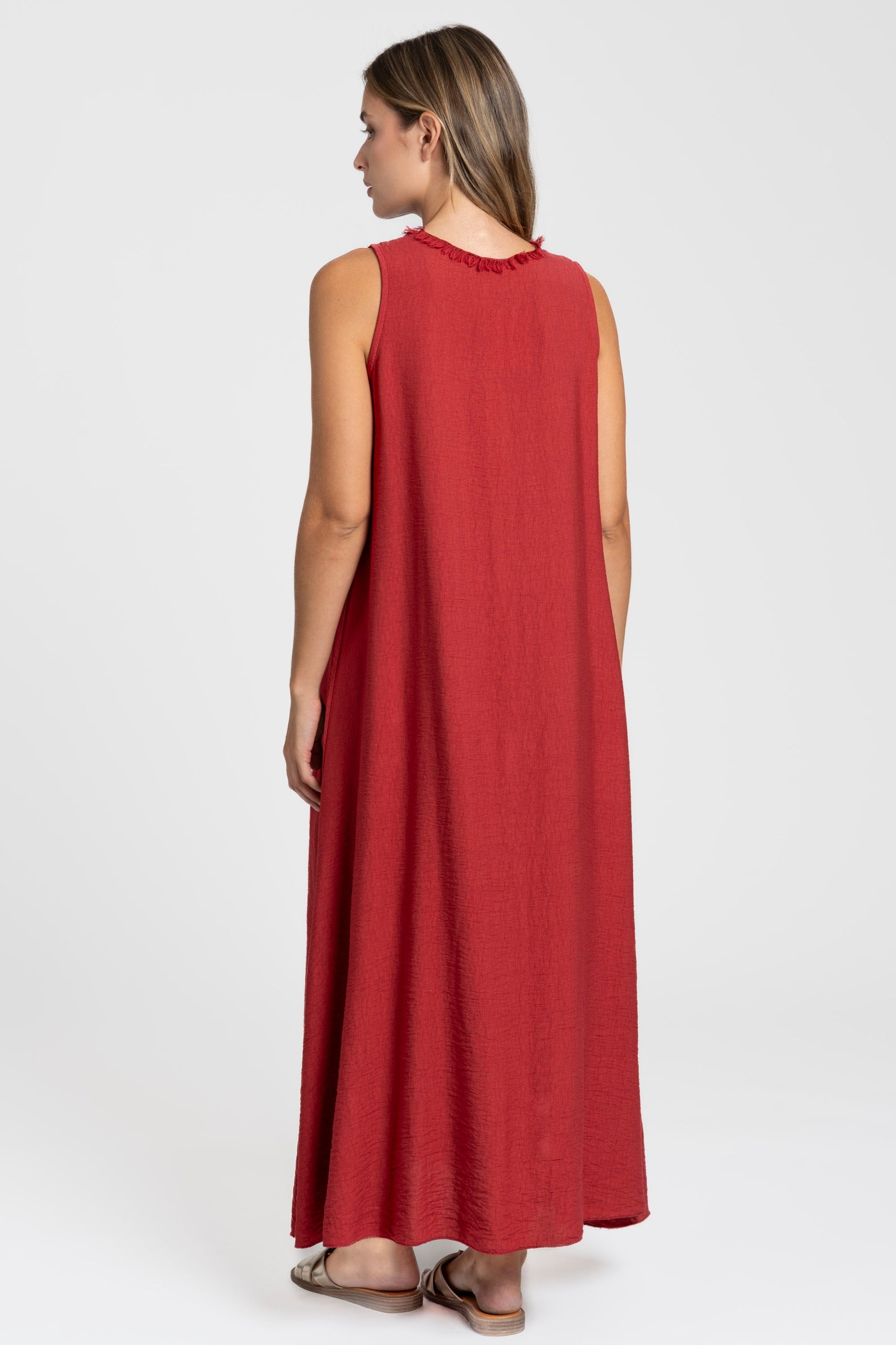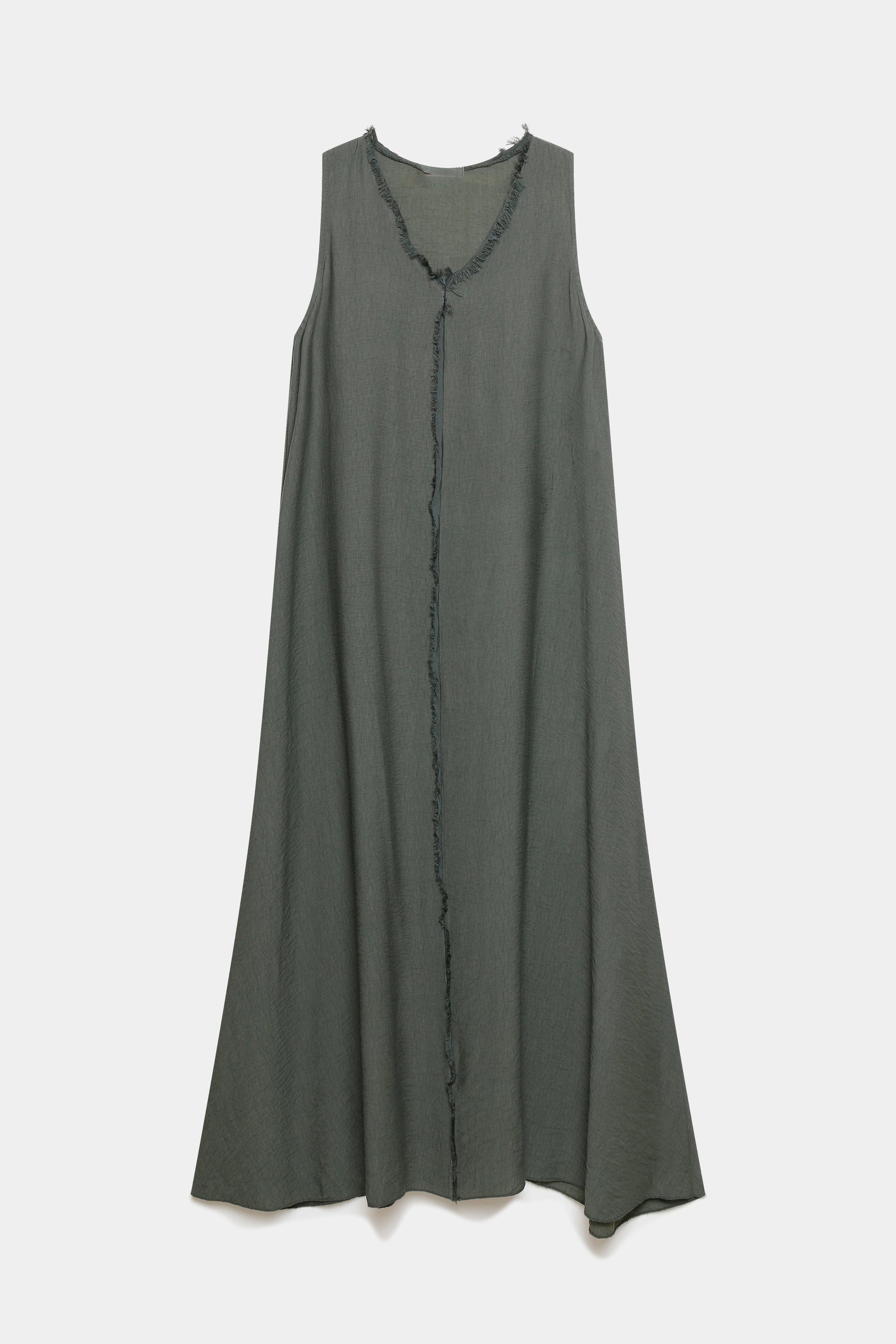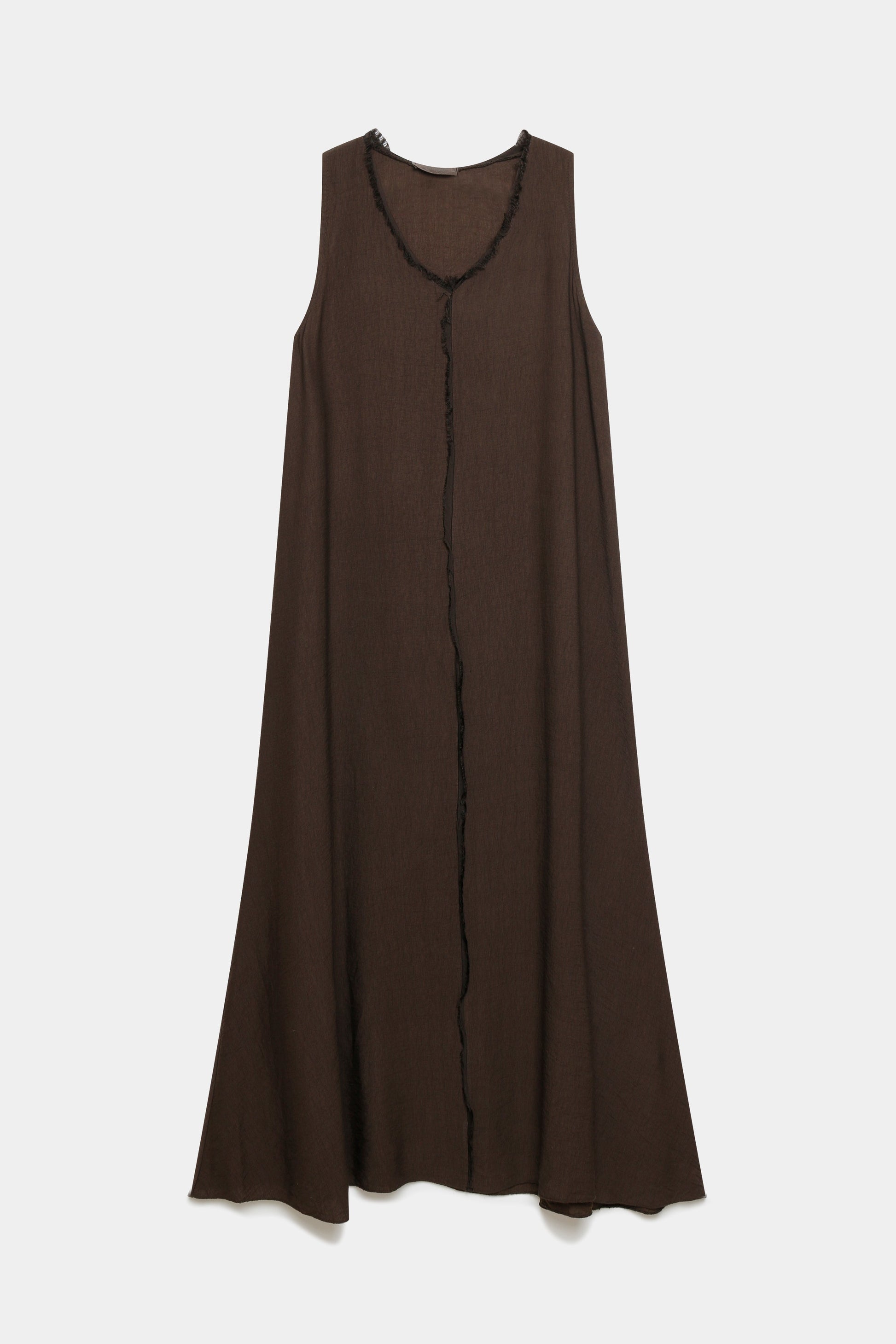 Tejido fluido. Efecto lino. Escote pico. Manga sisa. Diseño largo. Detalle flecos.